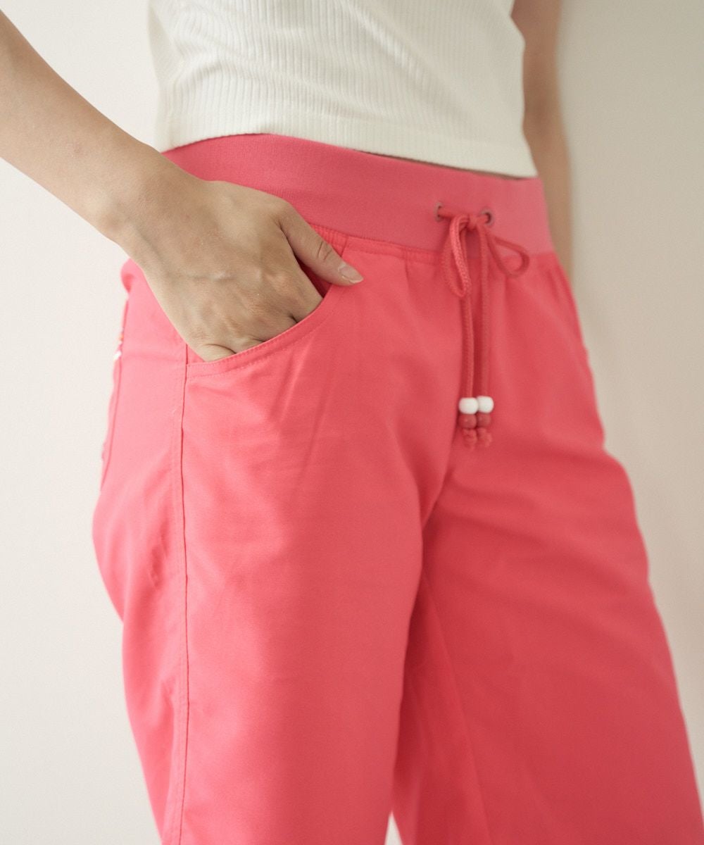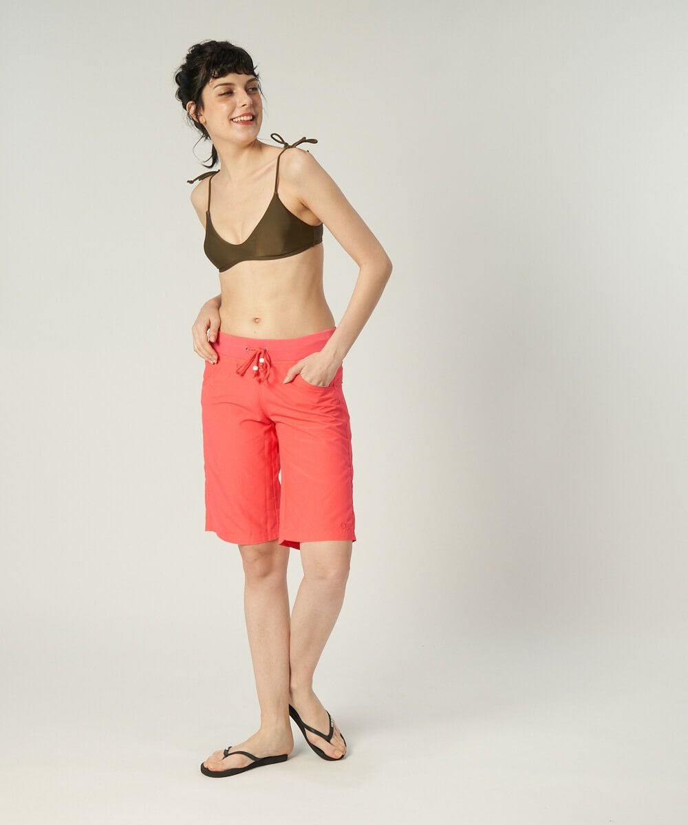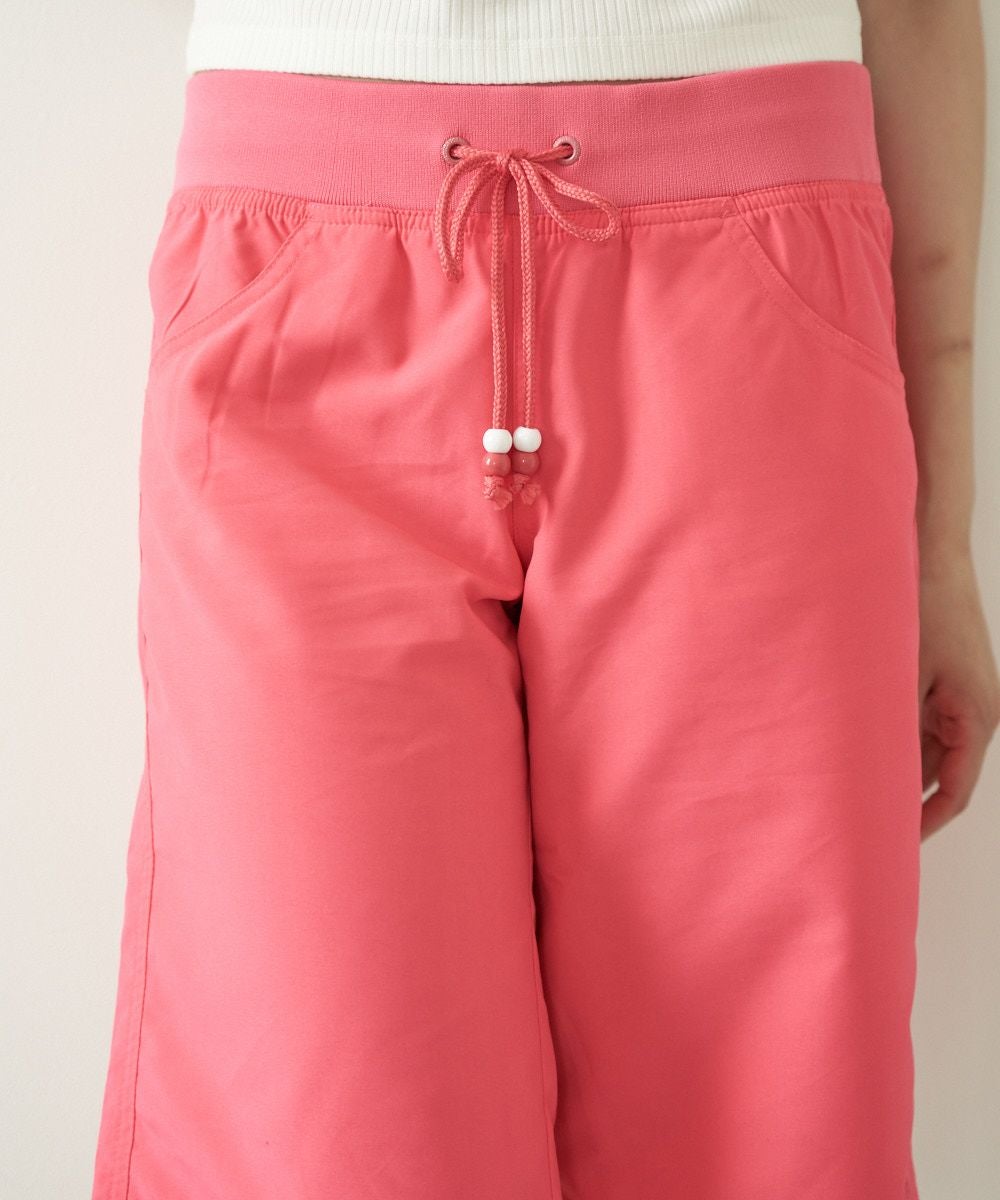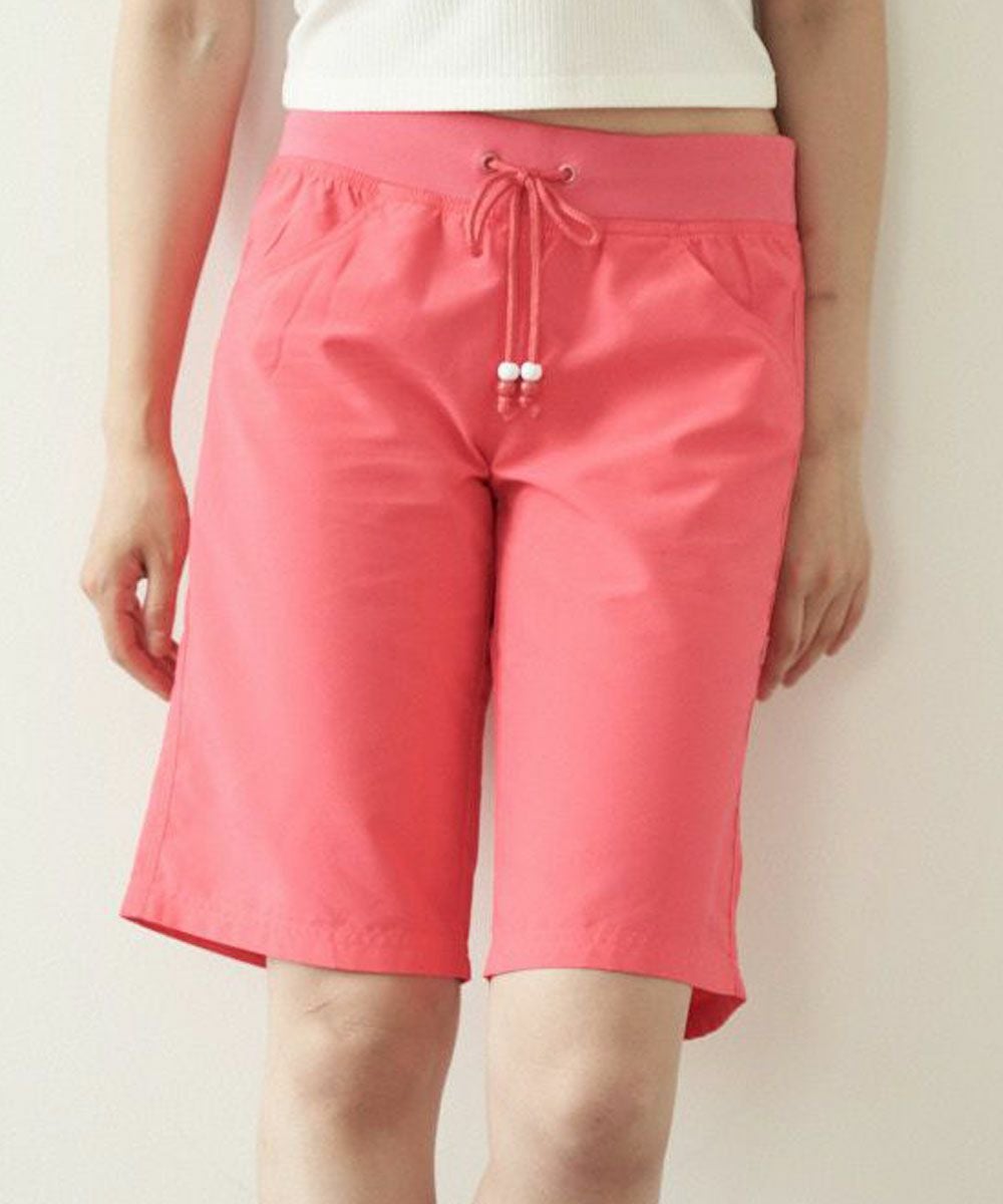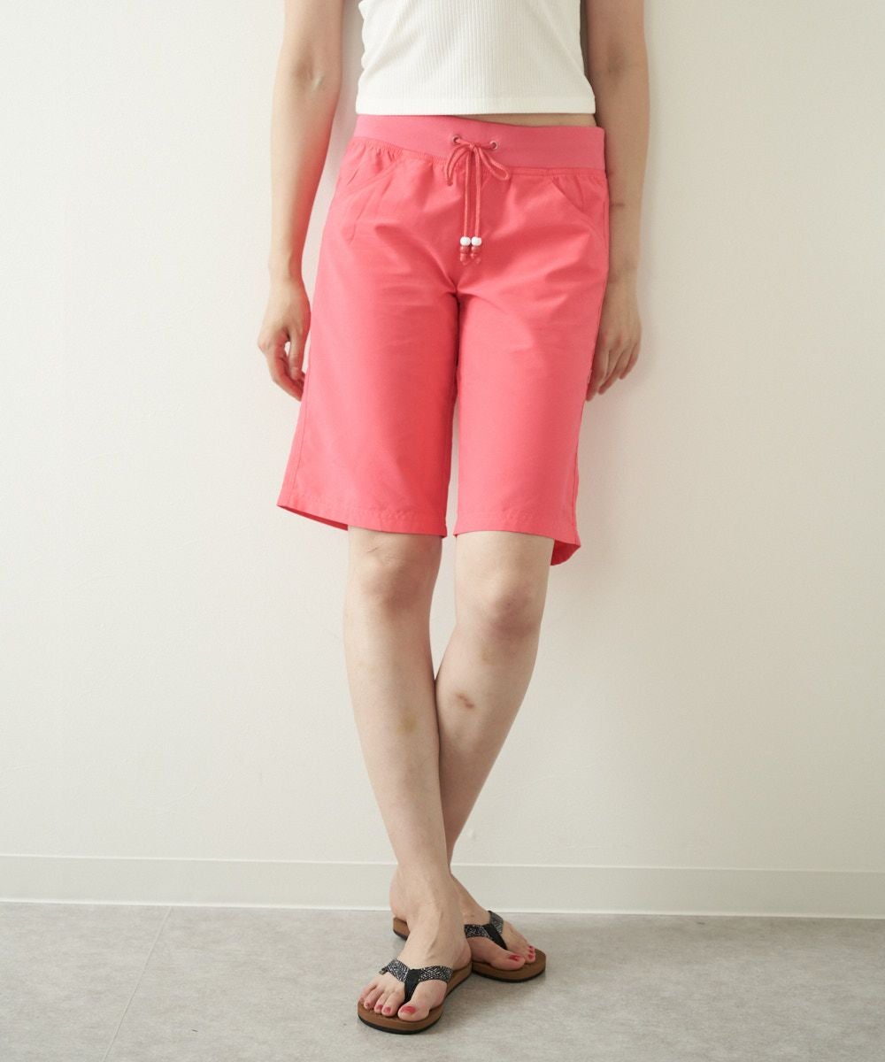 ウエスト部分に総リブゴムを使用した、リラックススタイルのボードショーツ。ドローコードには大きめのビーズ付き。股上が浅めにデザインされているので、着痩せしやすく、様々なコーデに合わせやすいアイテムです。