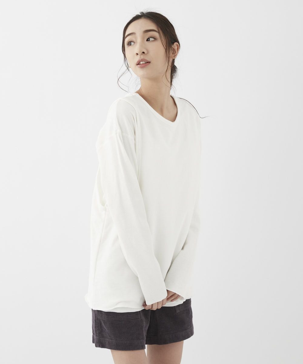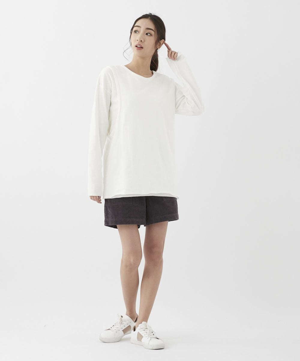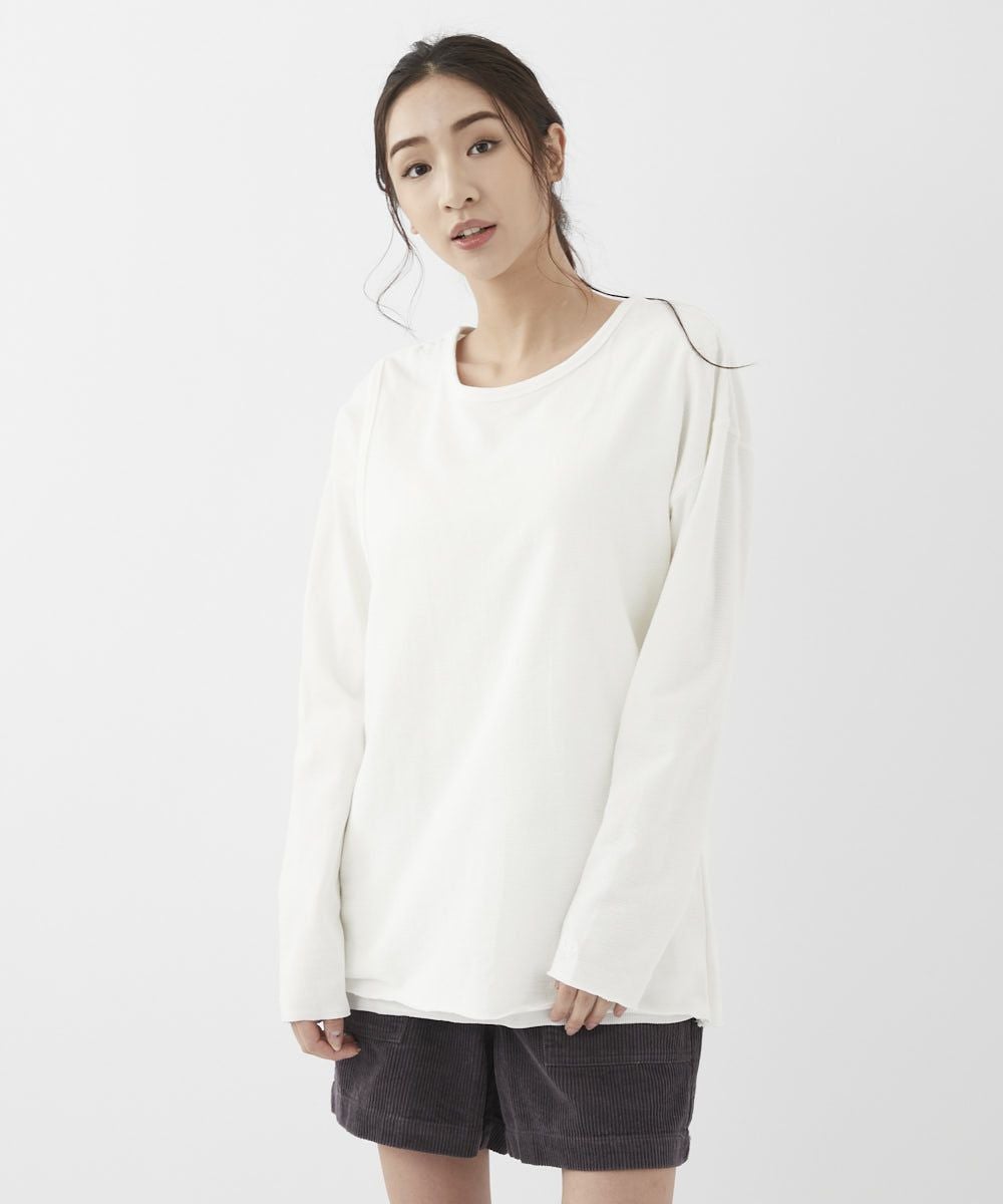 異素材の組み合わせが新しいデザインロンT。肩の部分を少しずらして抜け感のある着方もできるトレンドの 1枚です。