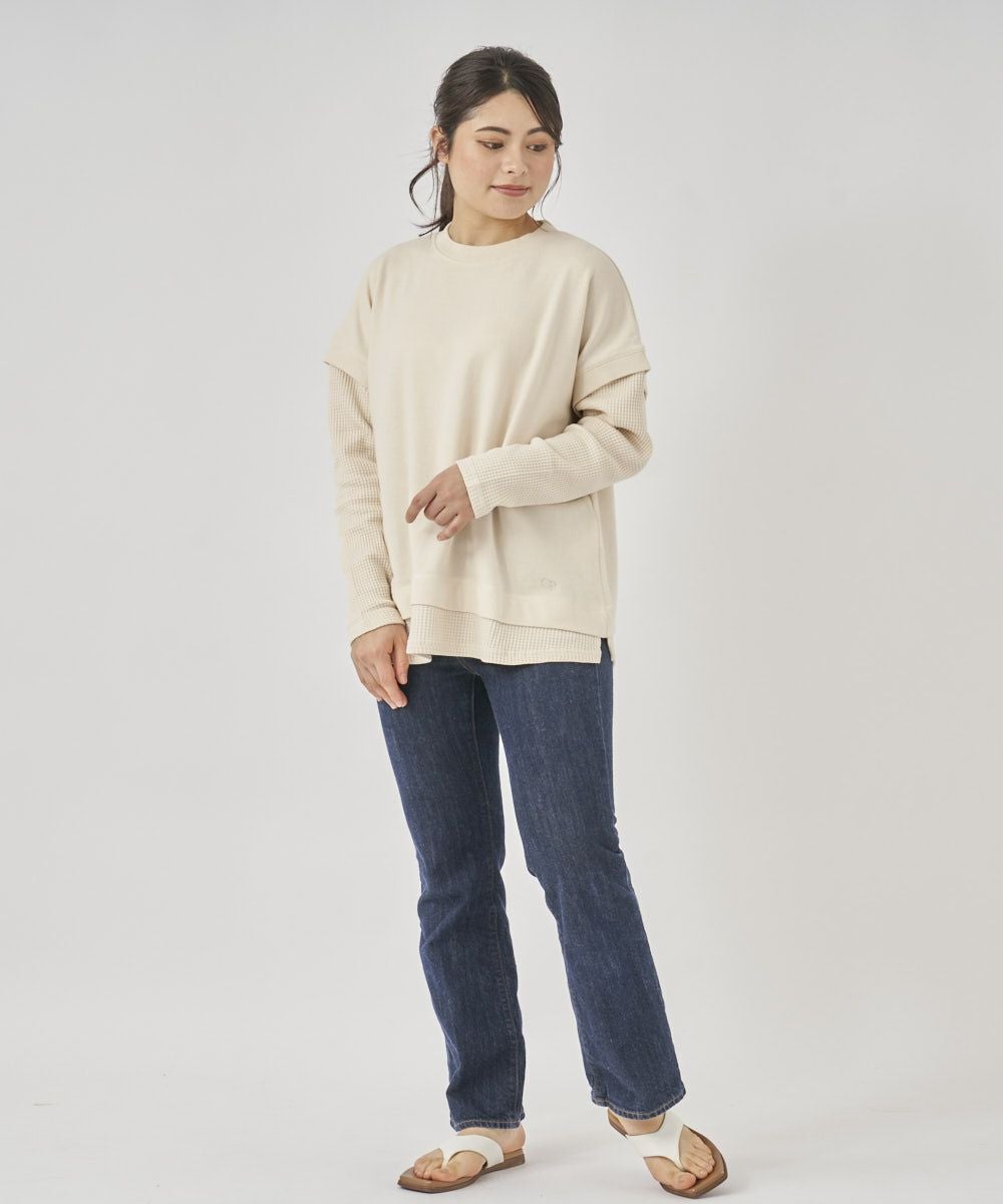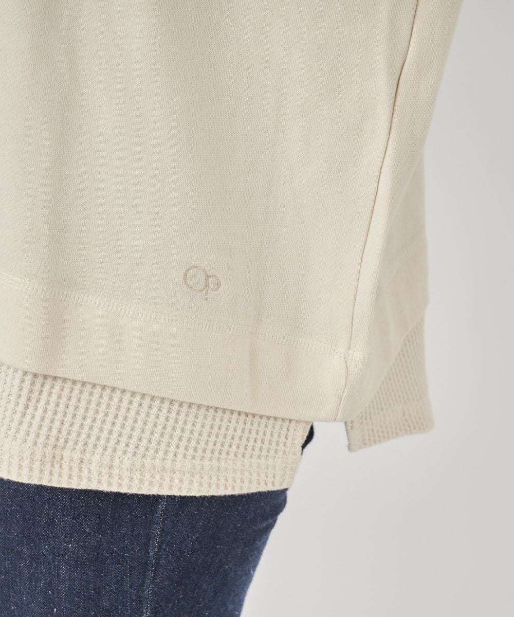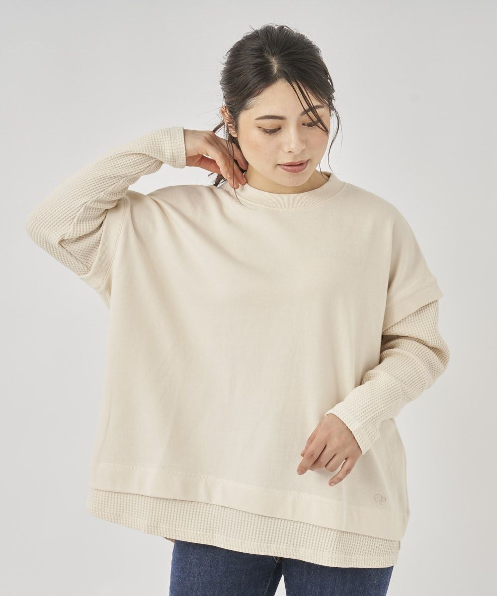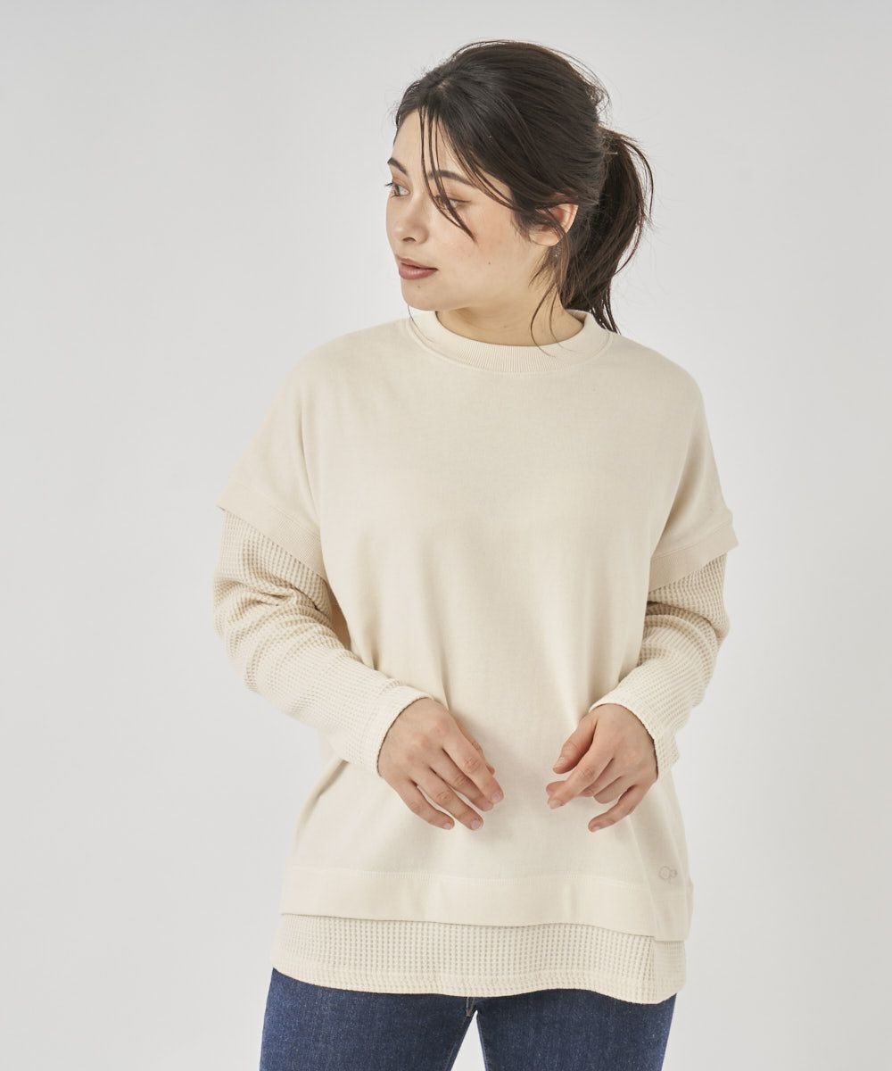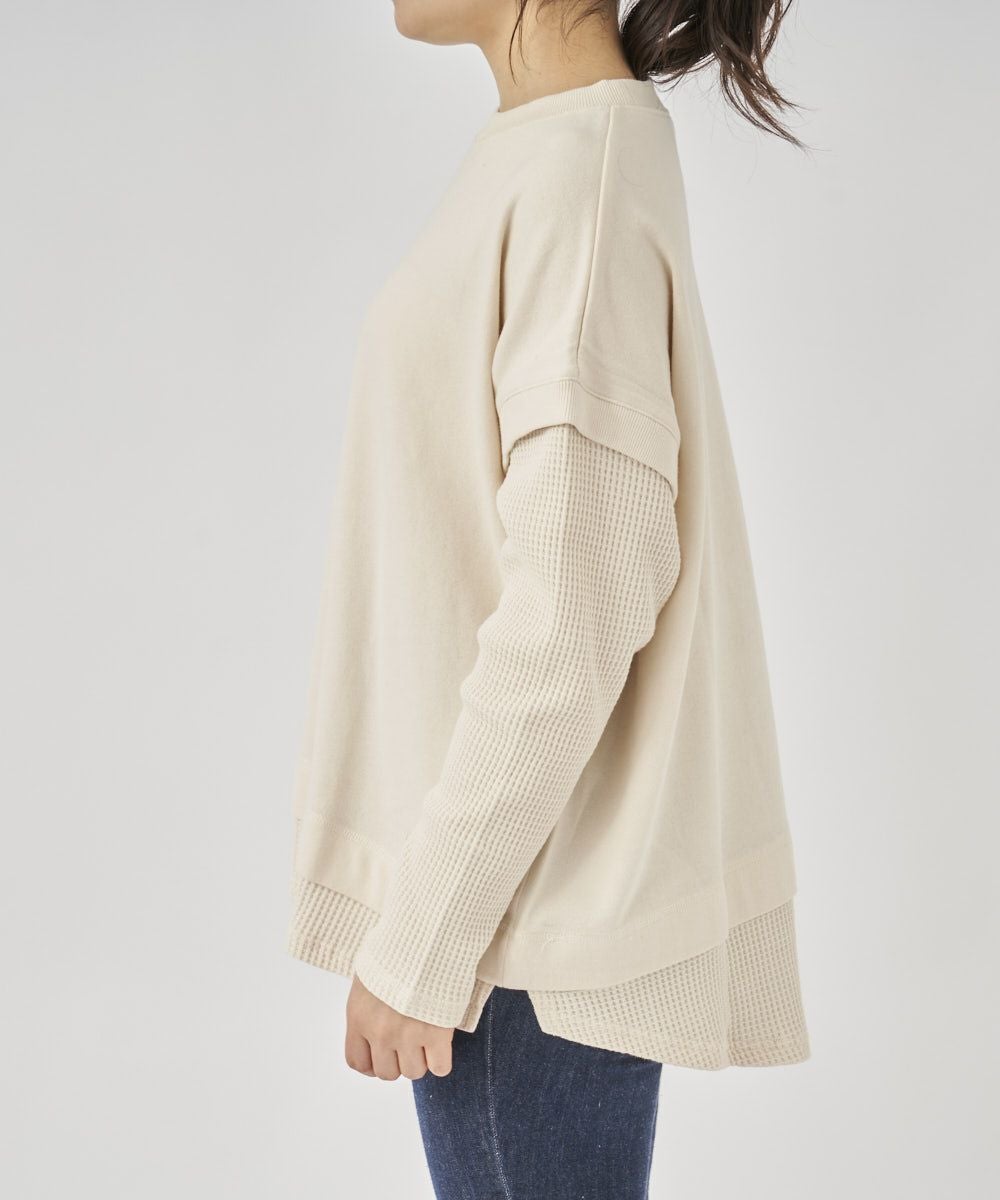 ワッフルとミニ裏毛のレイヤード風デザイン。オーバーサイズでヒップまで隠れてレギンスや細身のパンツと相性抜群。