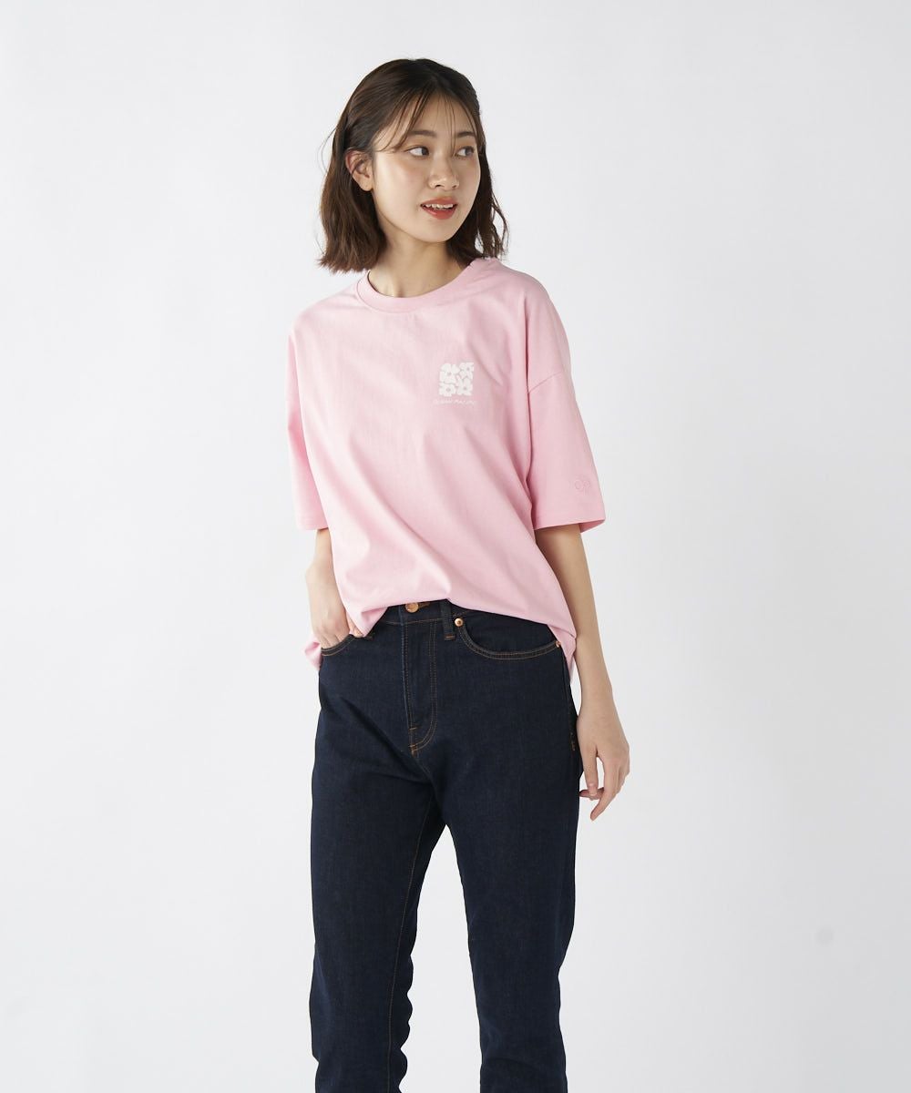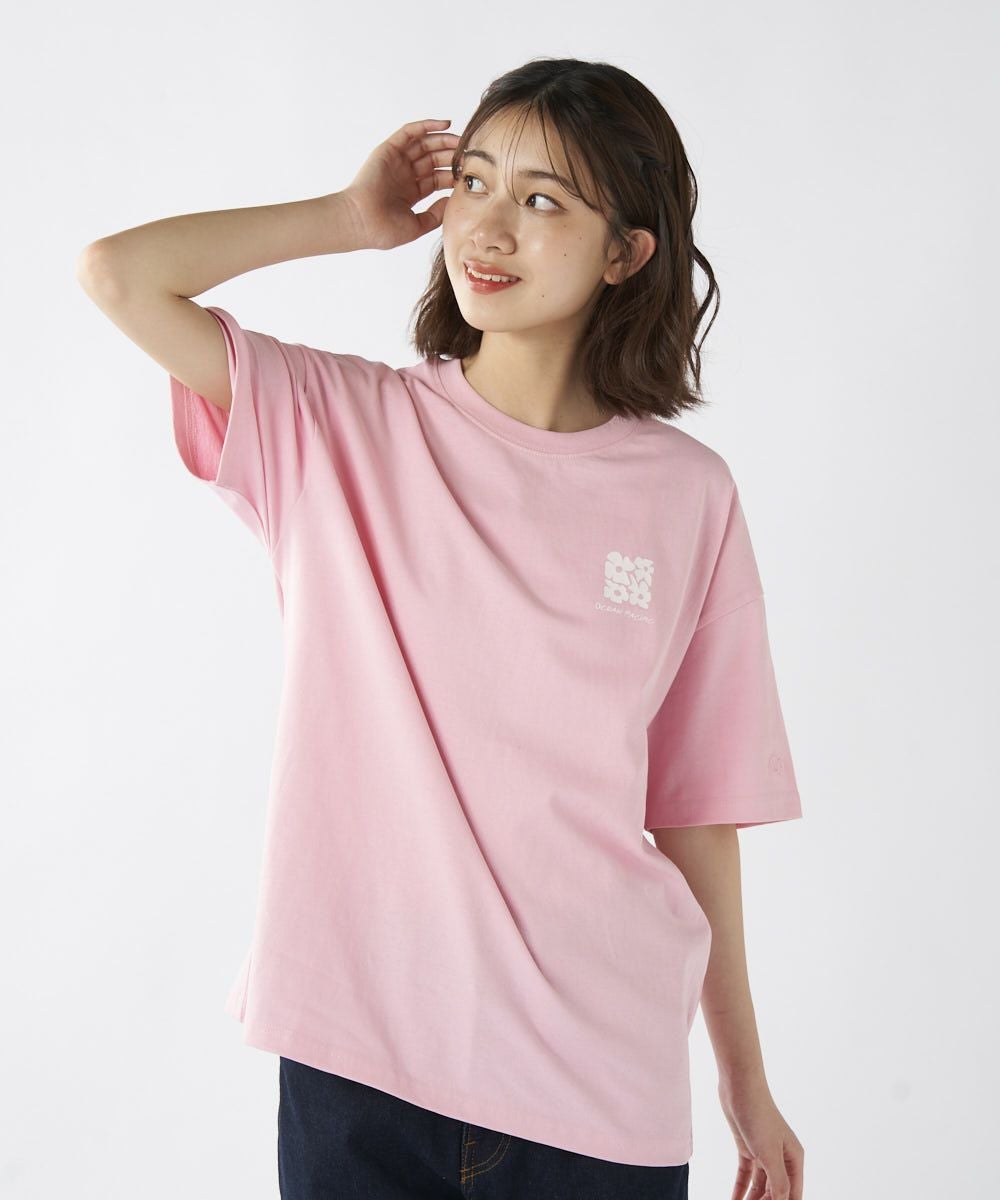 フラワープリントが色と形にこだわったTシャツです。フロントはワンポイントでシンプルに、バックはボックスフラワー柄で後ろ姿もおしゃれに!
