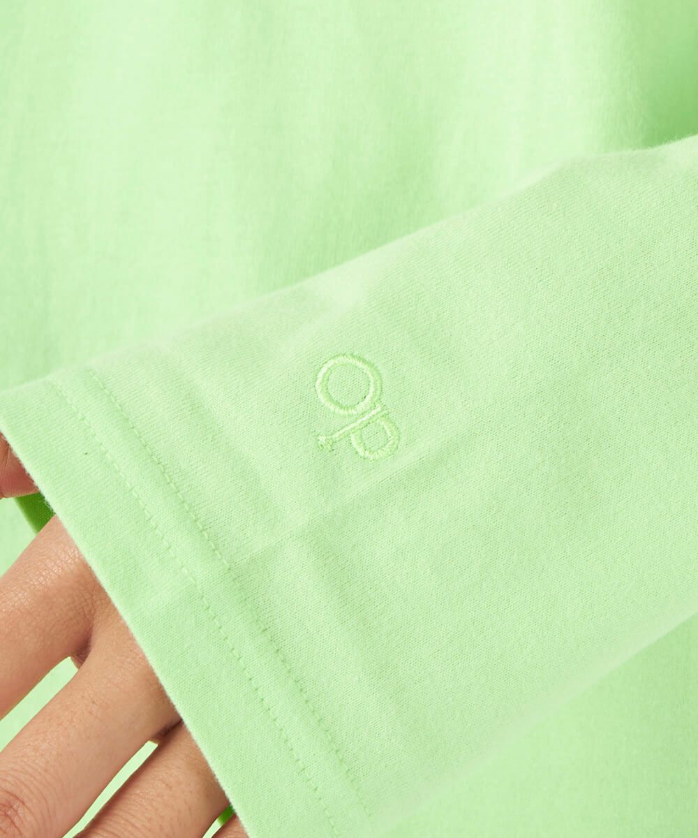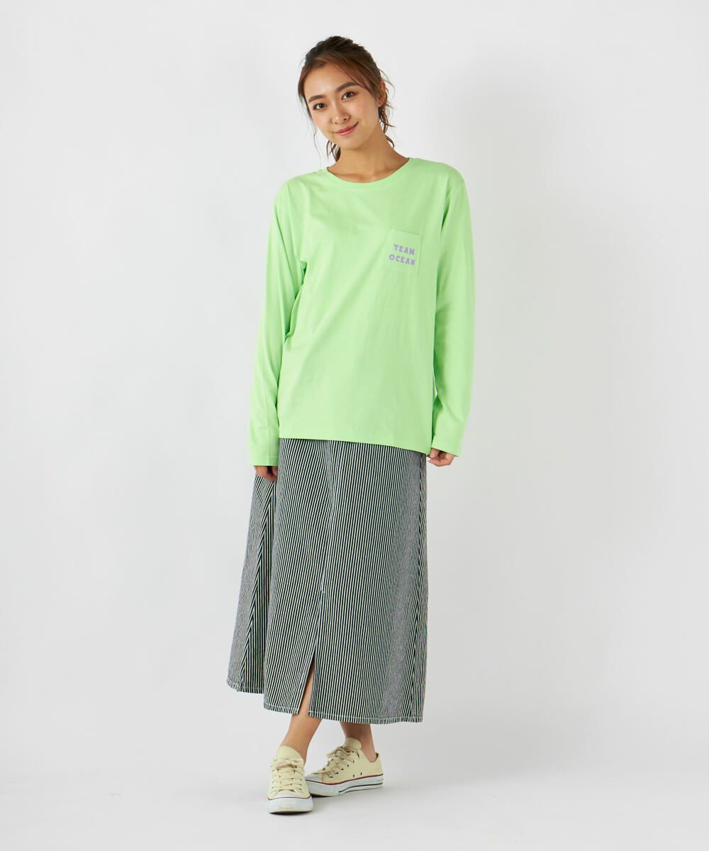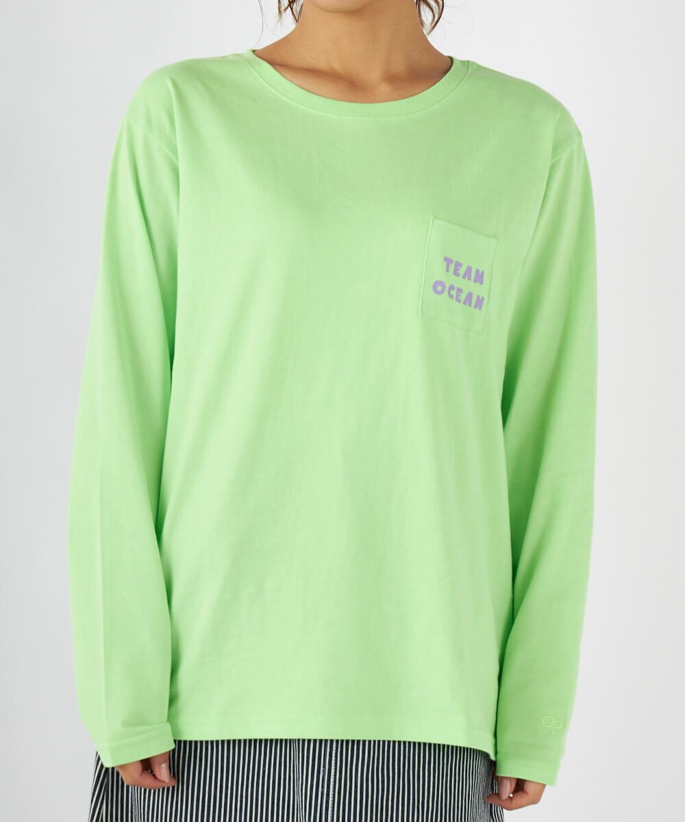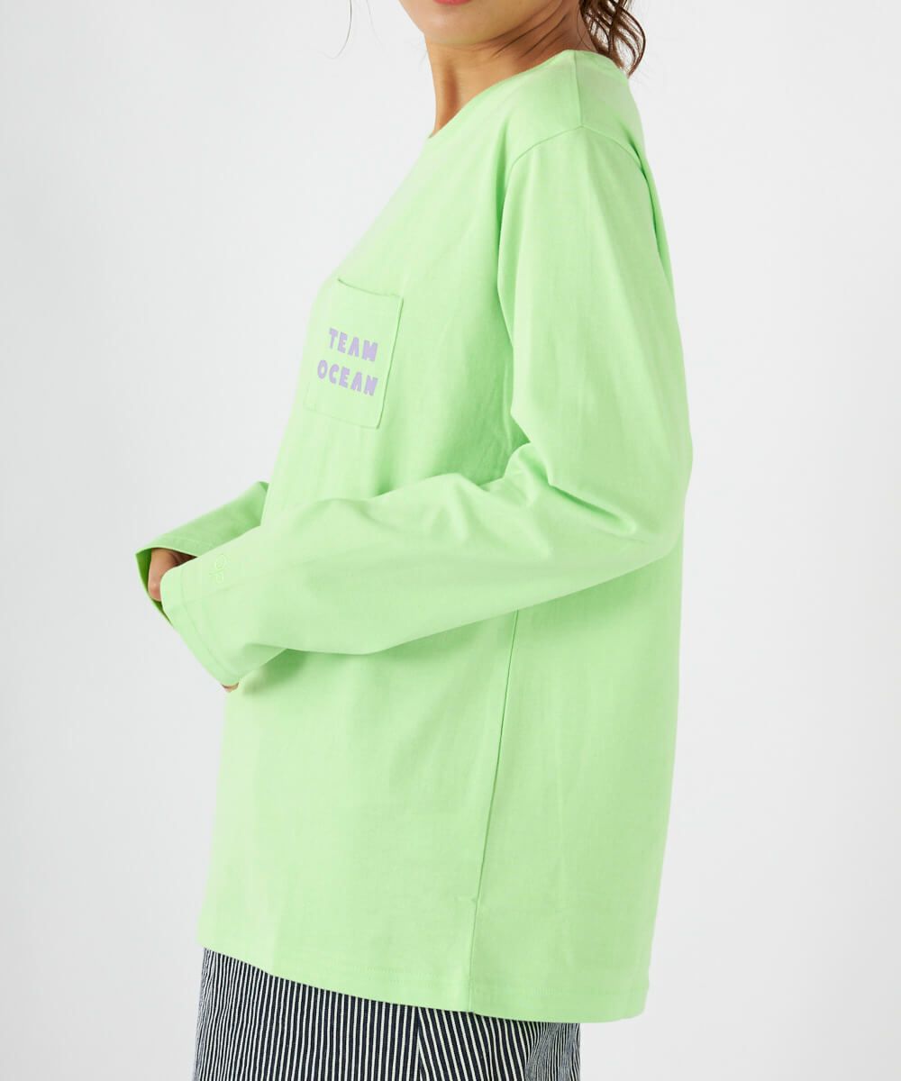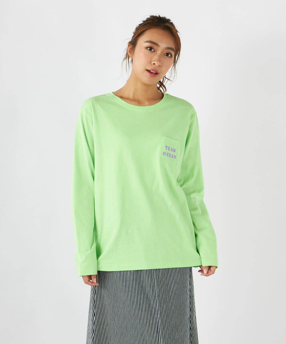 オーバーシルエットの胸ポケット付きロンT。POPなロゴデザインがポイント。
