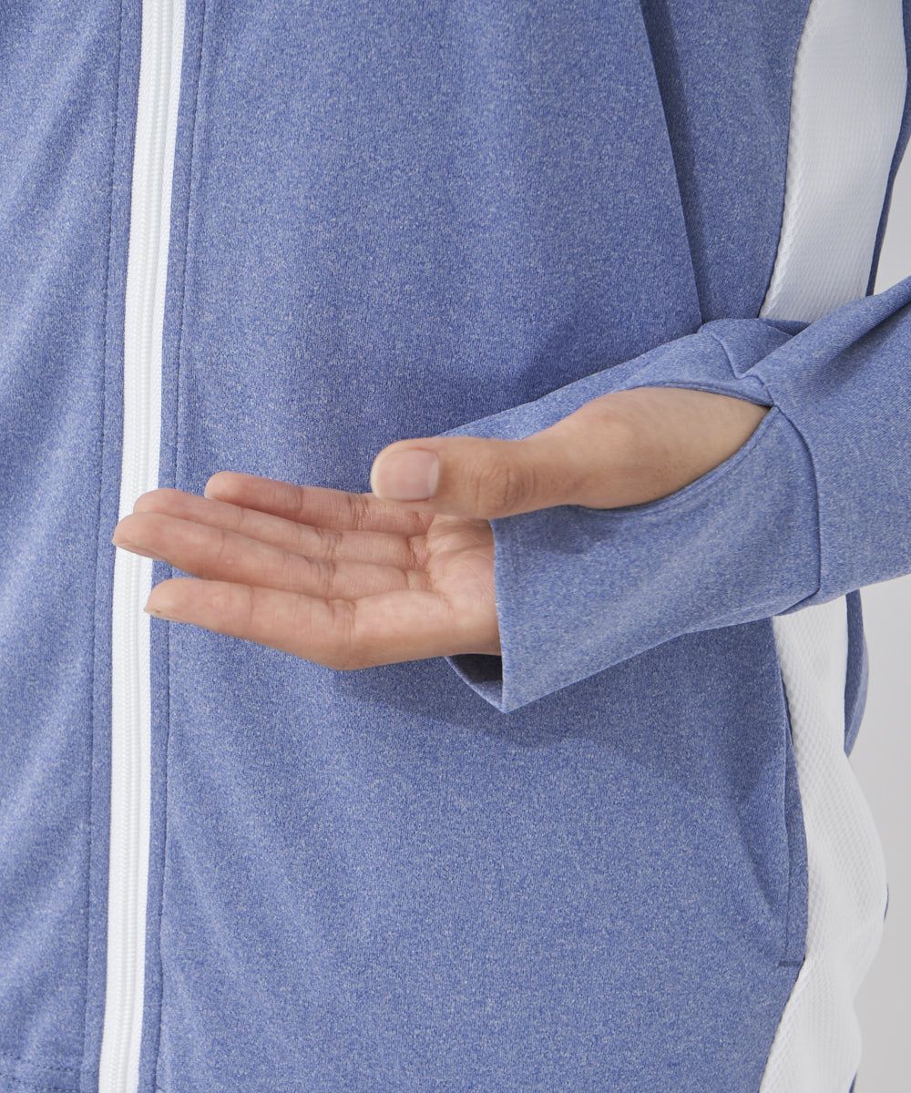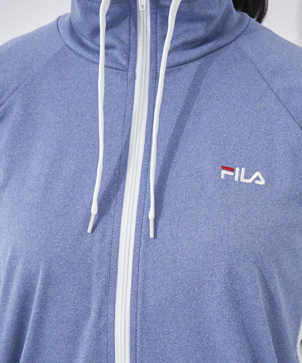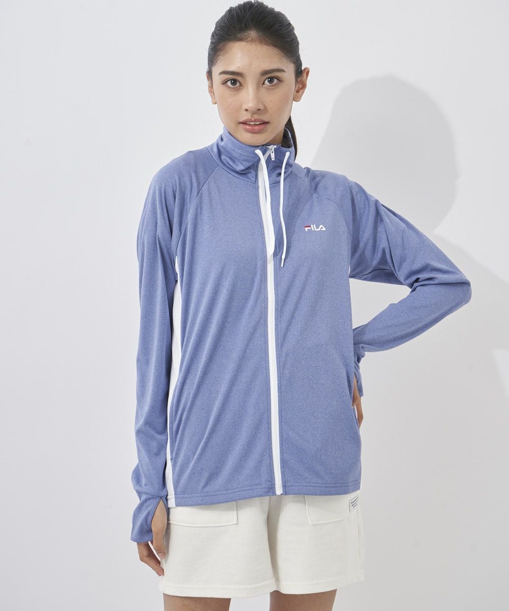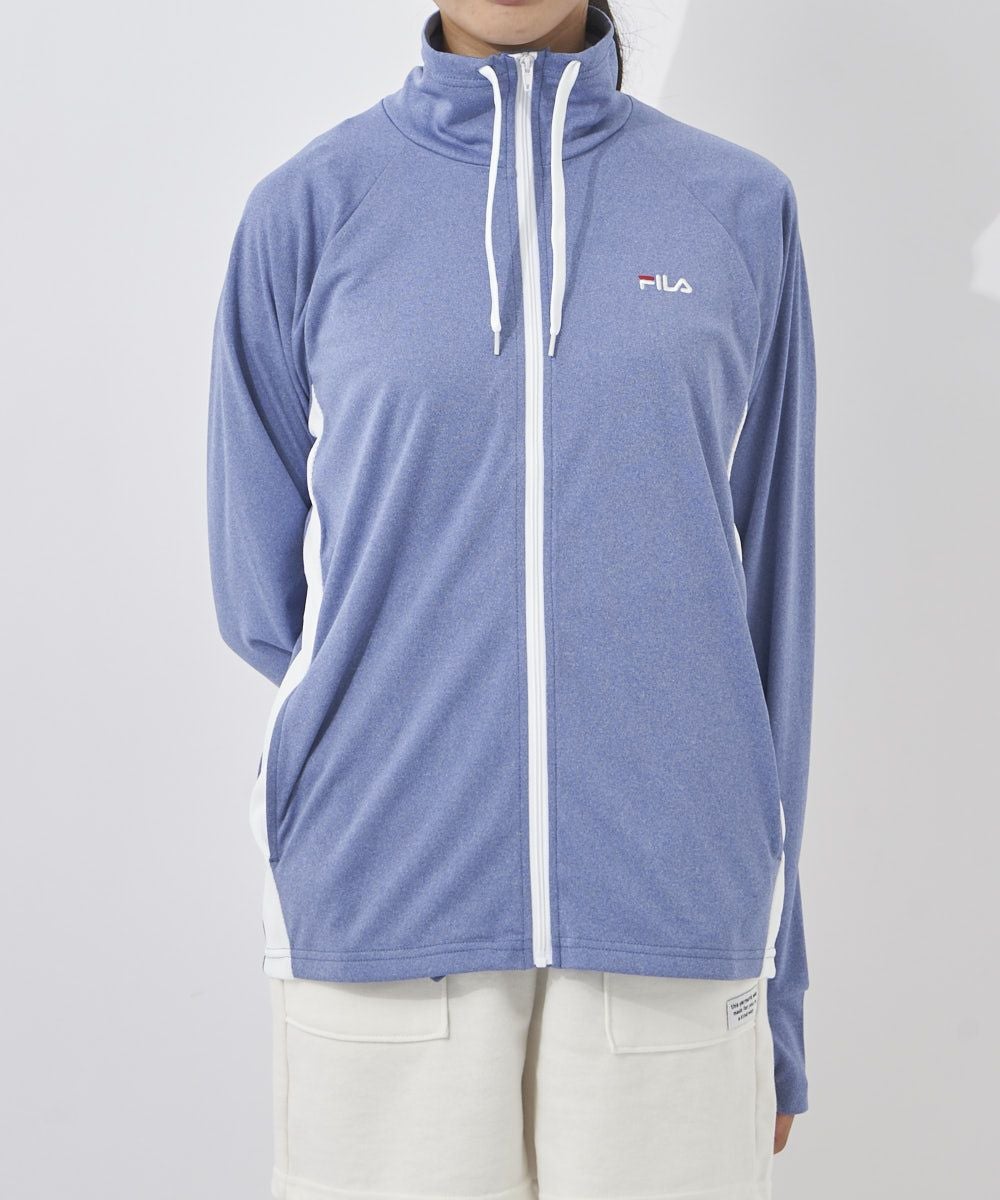 水陸両用・UV遮蔽率90%以上。UVフルジップジャケット。脇とスタンド衿内側がメッシュ切り替えなのでサラリとした肌触りです。両脇にポケット付き。手の甲も日焼けからカバーできる指穴付き。左胸にFILAロゴ刺繍。