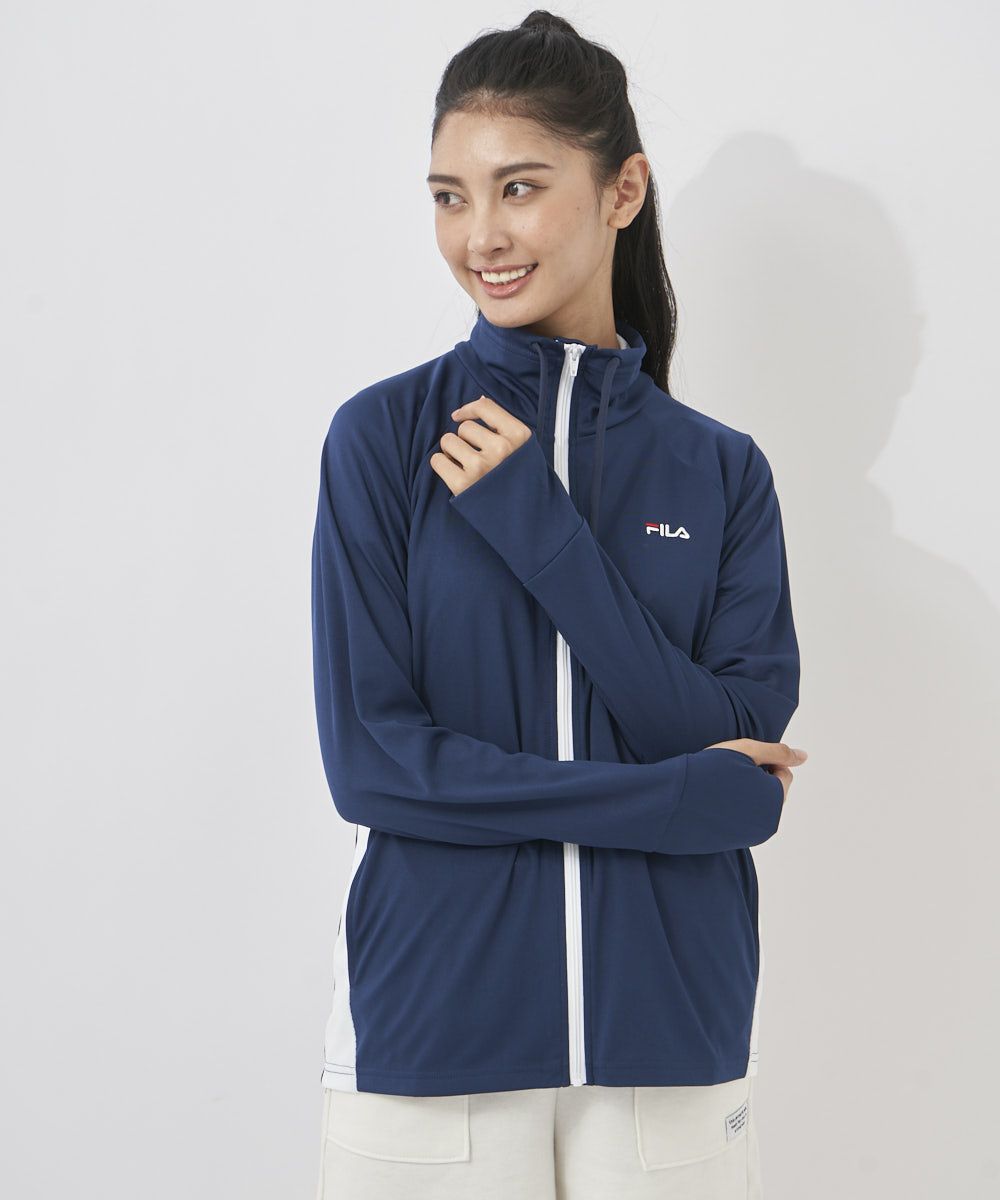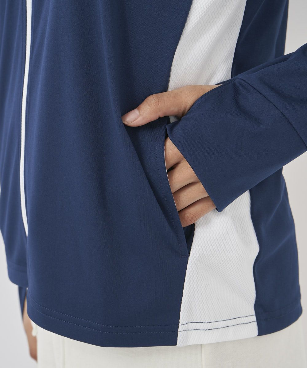 水陸両用・UV遮蔽率90%以上。UVフルジップジャケット。脇とスタンド衿内側がメッシュ切り替えなので