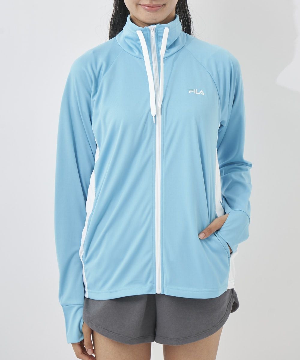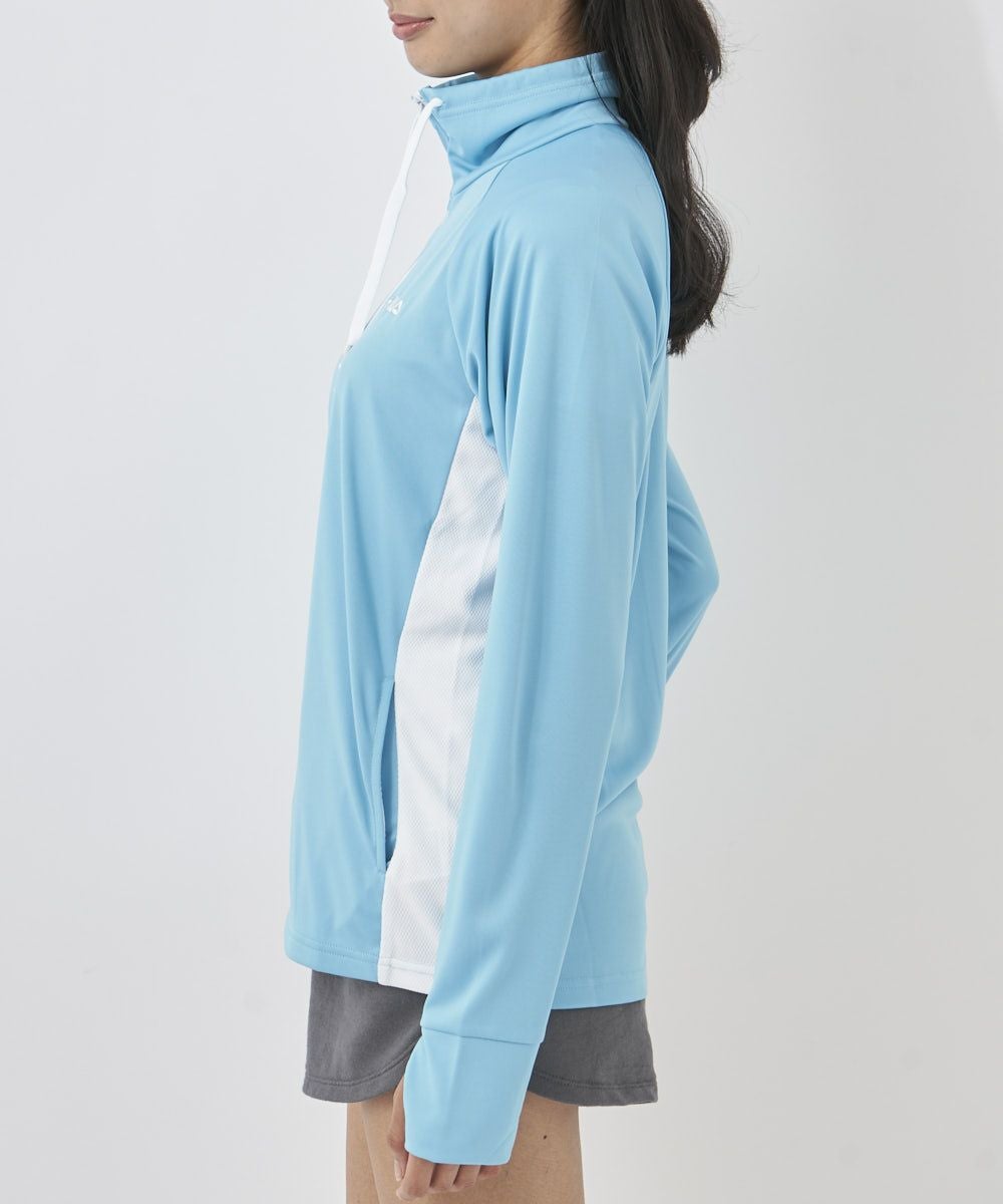 水陸両用・UV遮蔽率90%以上。UVフルジップジャケット。脇とスタンド衿内側がメッシュ切り替えなので