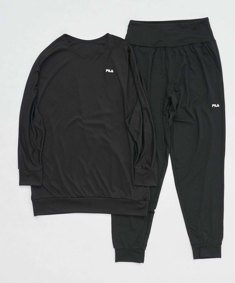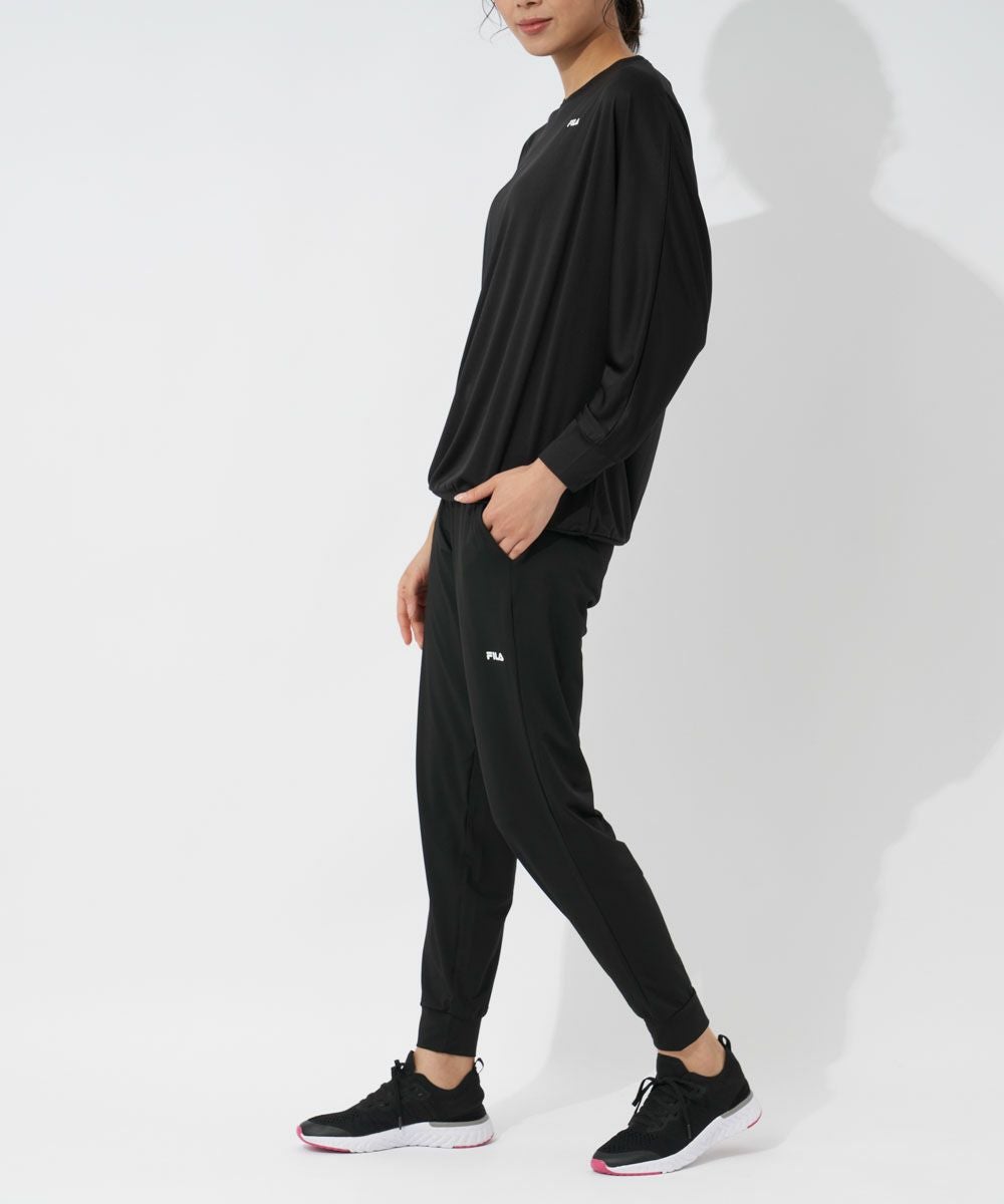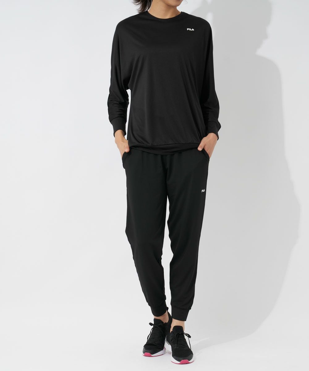 UV 紫外線遮蔽率95%以上で水陸両用、吸水速乾と機能面にも優れた、ドルマン長袖Tシャツ、ロングパンツのレディス上下セットウェアです。