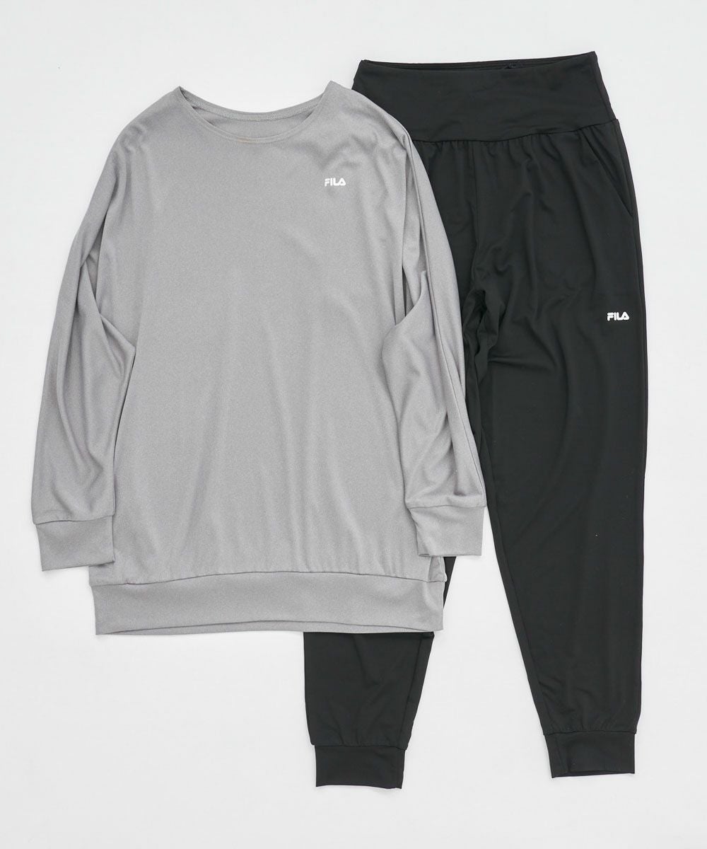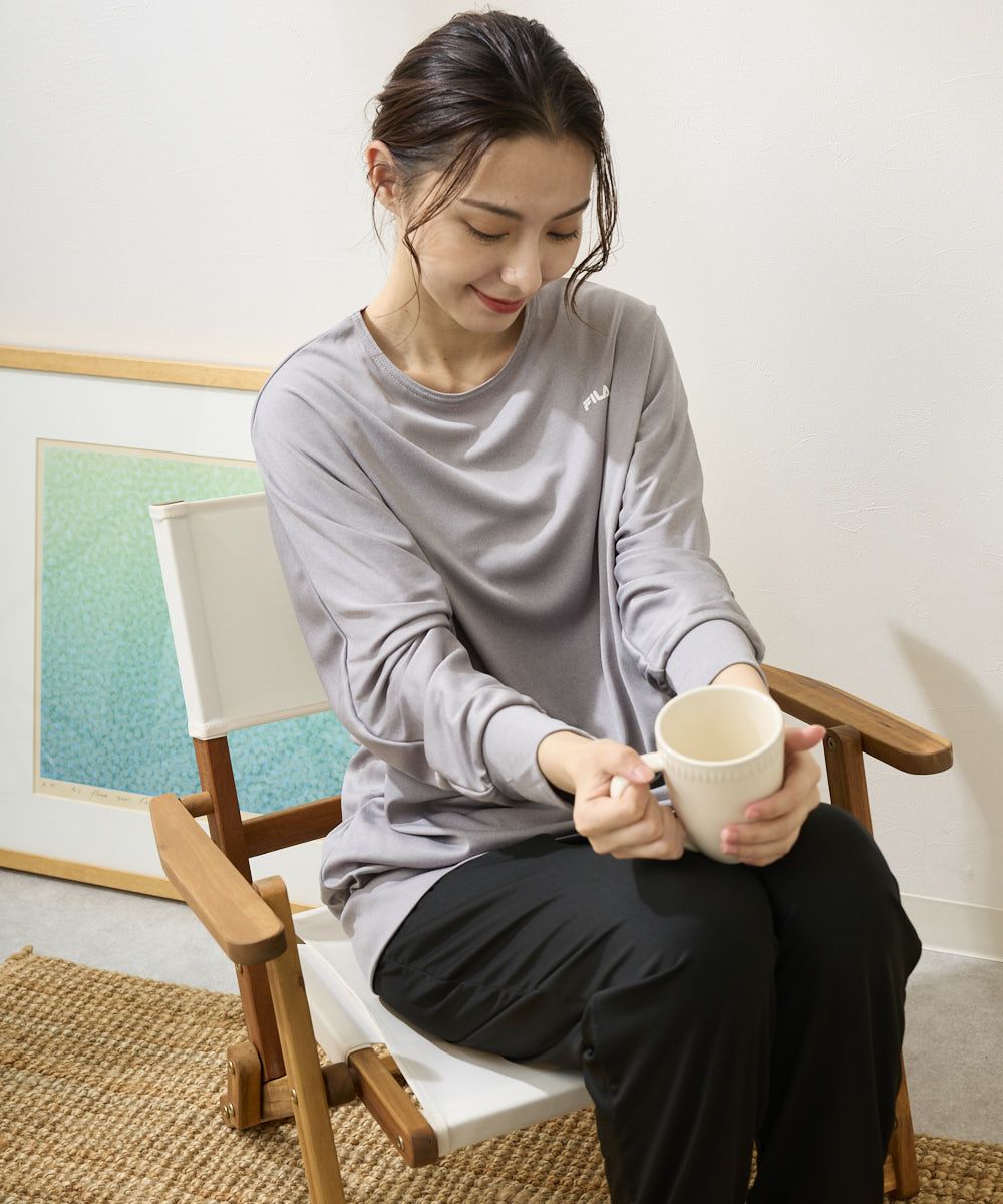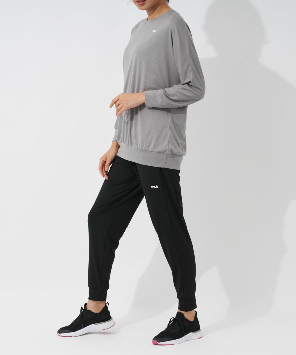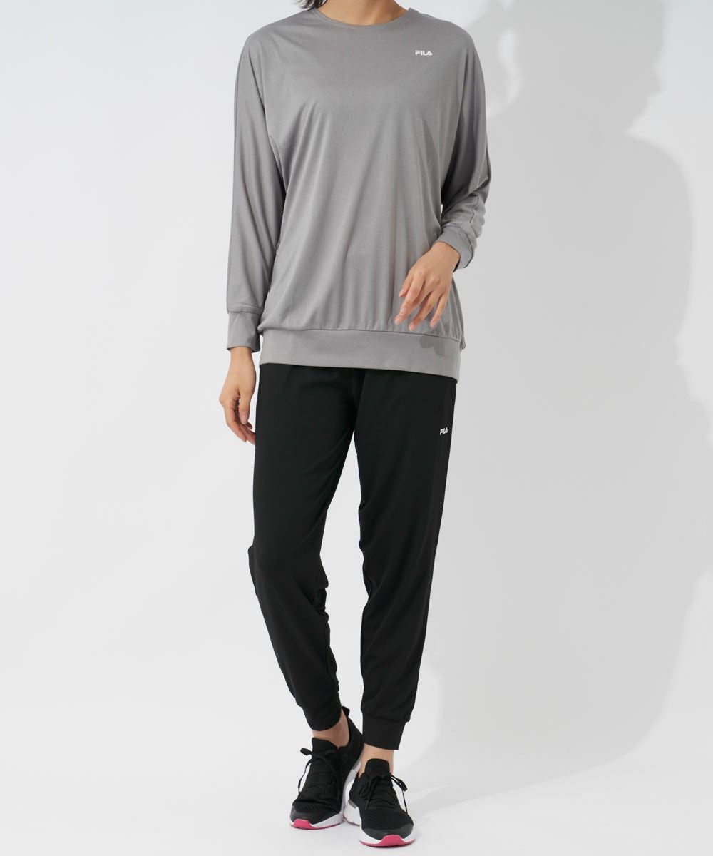 UV 紫外線遮蔽率95%以上で水陸両用、吸水速乾と機能面にも優れた、ドルマン長袖Tシャツ、ロングパンツのレディス上下セットウェアです。