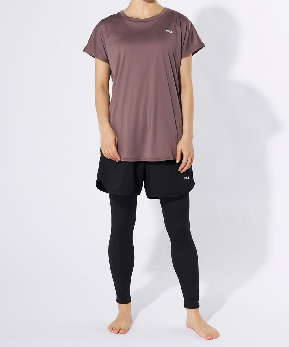 UV 紫外線遮蔽率95%以上と機能面にも優れた、Tシャツ、レギンス、ショートパンツのレディスフィットネスウェア3点セットです。