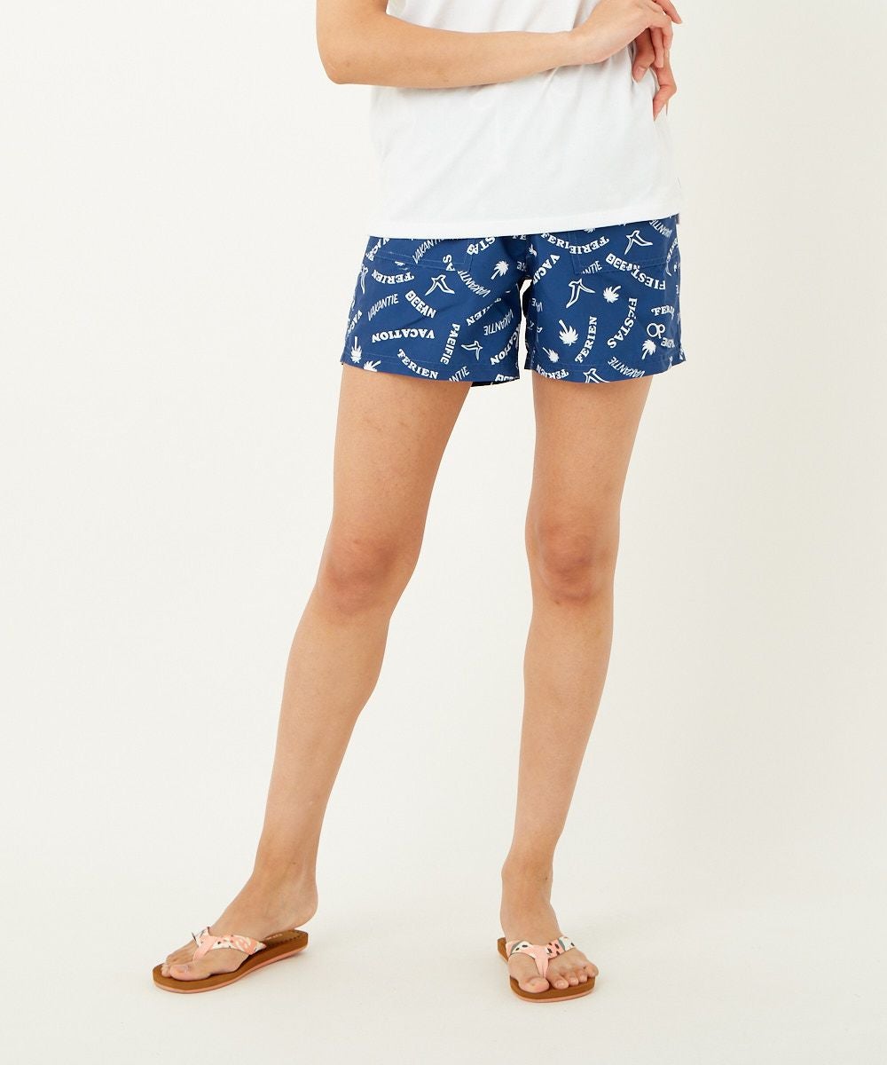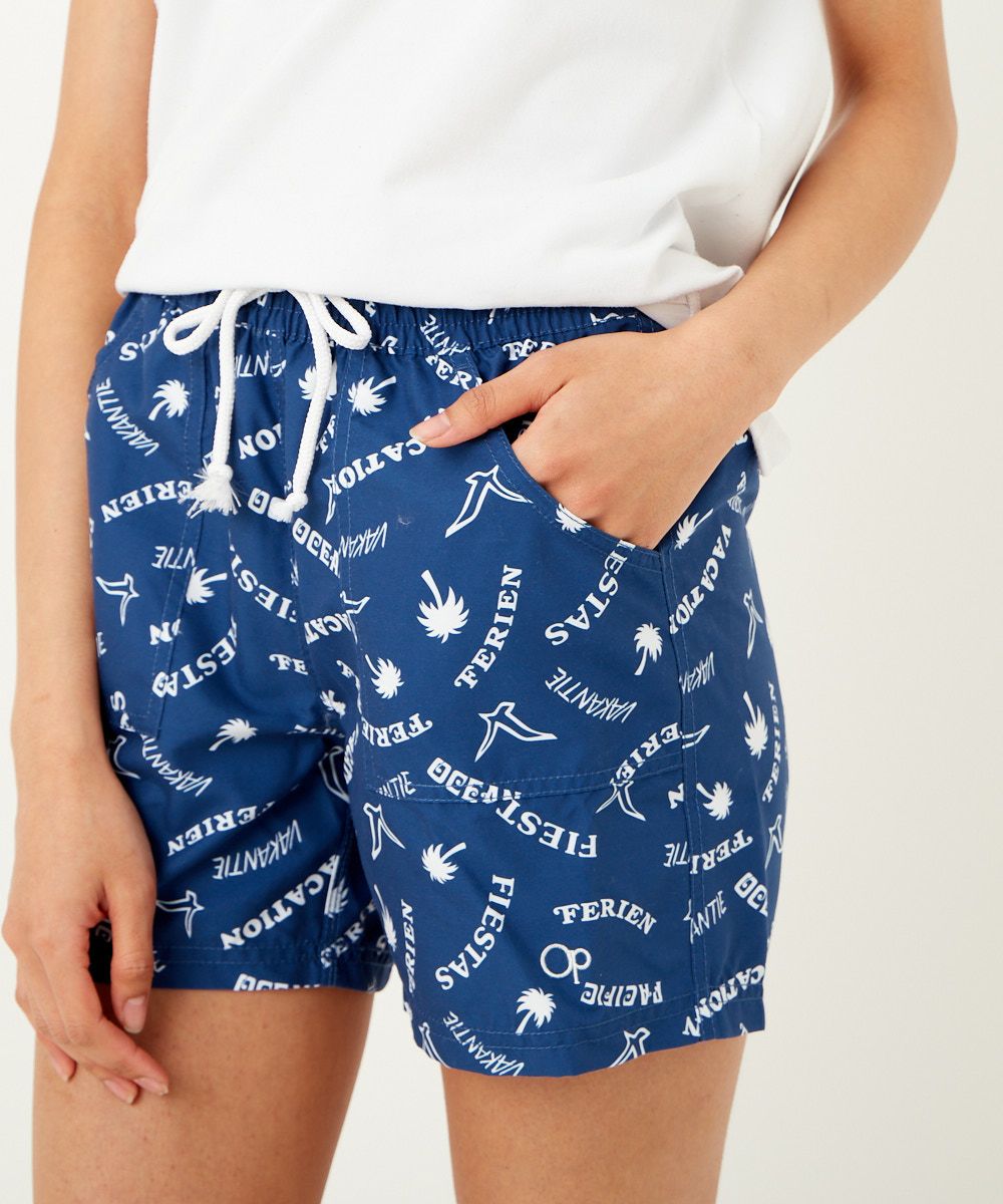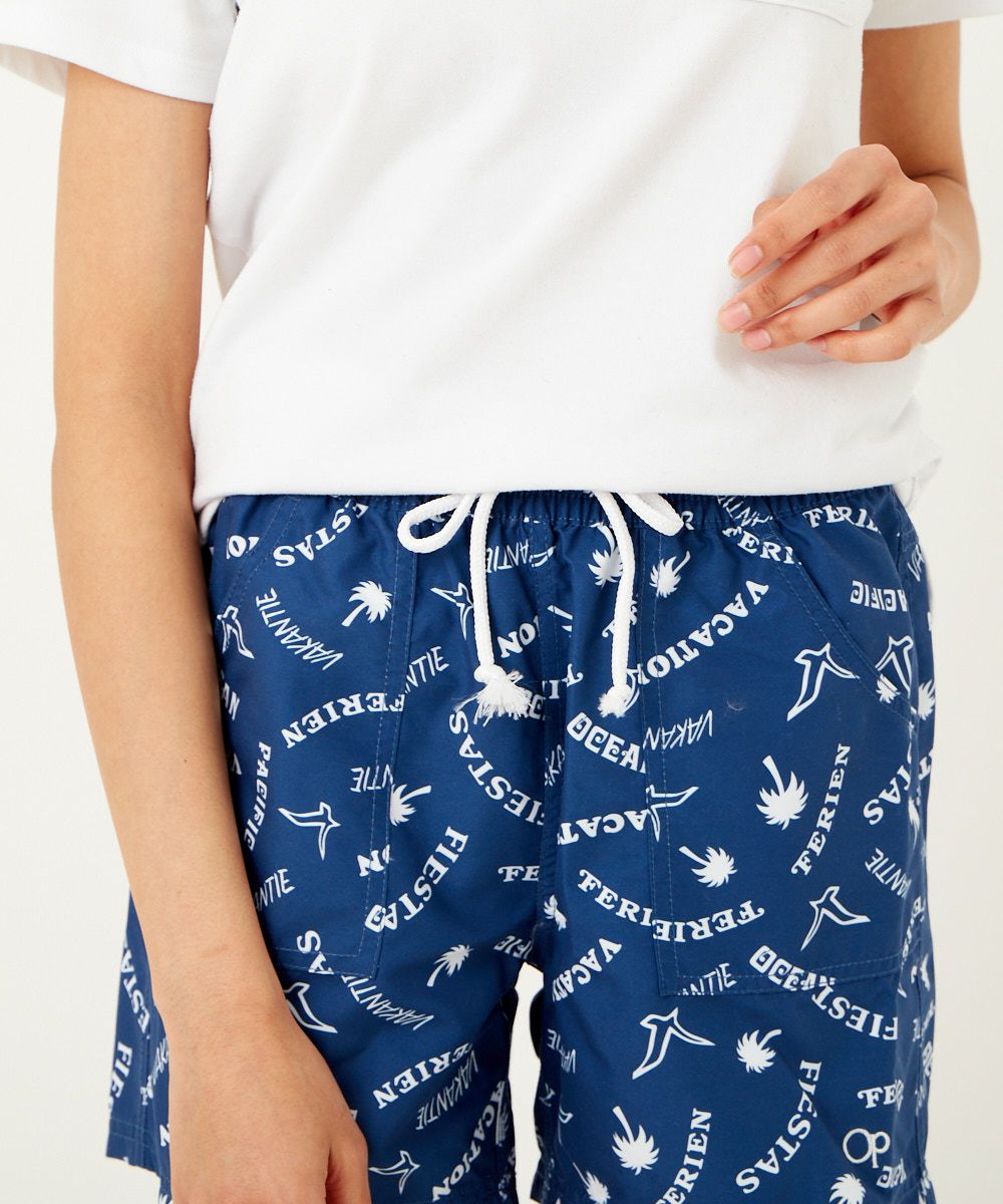 飛び柄のヤシの木とロゴがかわいいボードショーツです。ウエストはゴムと紐で楽チン且つ安心。