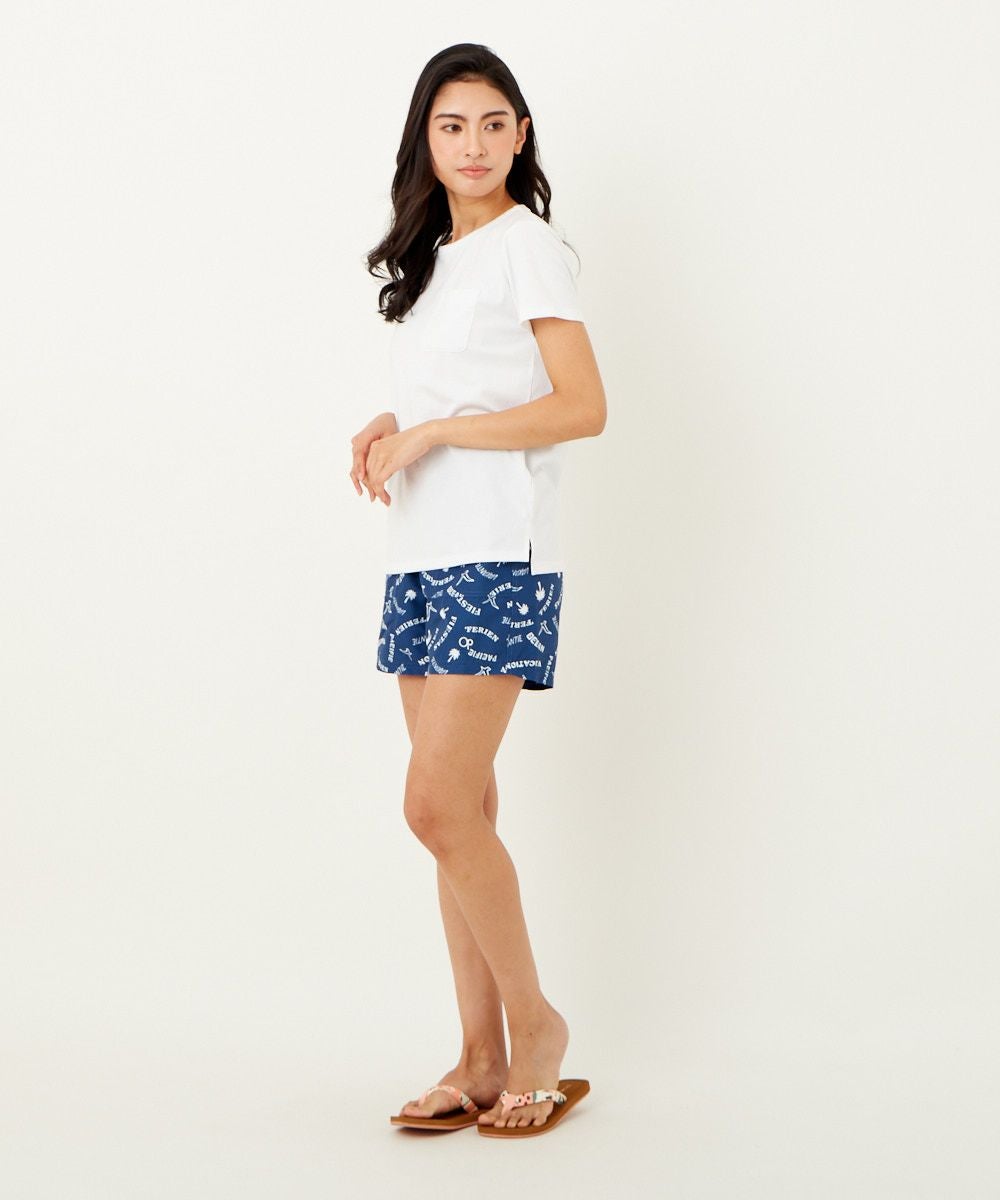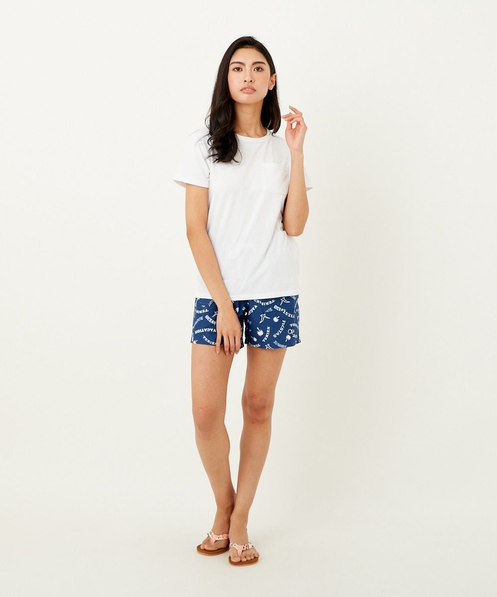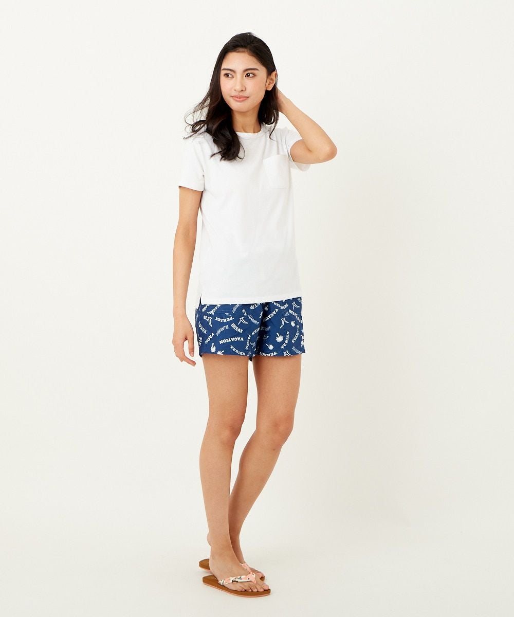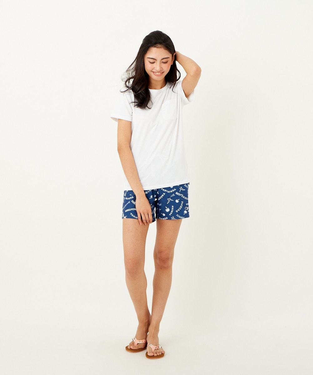 飛び柄のヤシの木とロゴがかわいいボードショーツです。ウエストはゴムと紐で楽チン且つ安心。