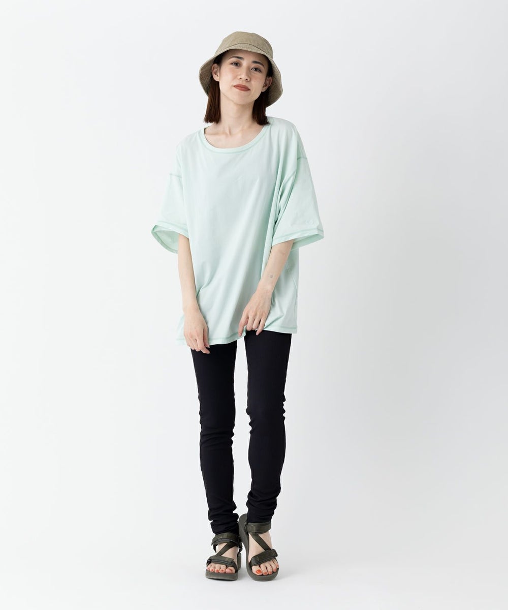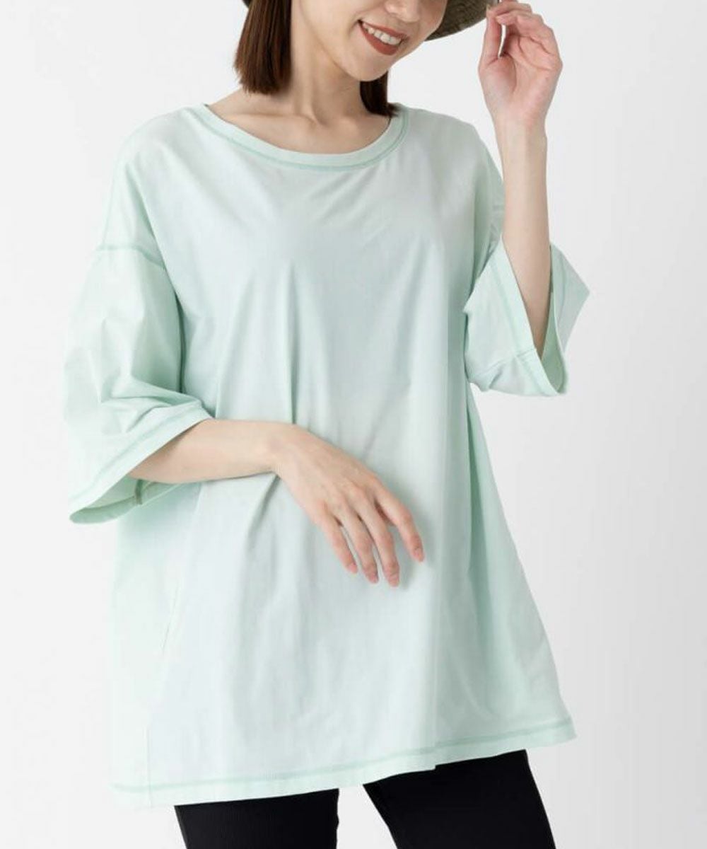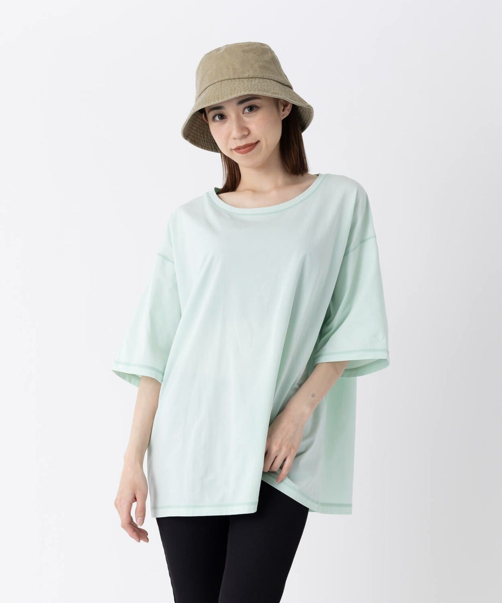 POPなカラー展開も可愛い、配色ステッチのゆったりシルエットの半袖ラッシュT。ハイブリッド素材で普段着でも、水回りのレジャーでも様々なシーンで着て頂けます。