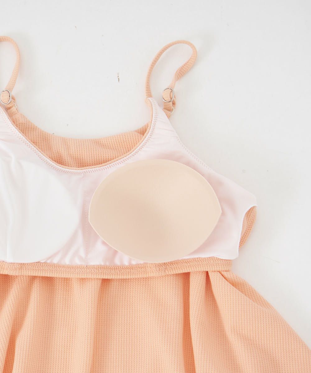 カップ付きキャミデザイン。カップは取り外し可能。裾にかけてフレアーシルエットになっているので お腹周りを綺麗に隠してくれます。キャミ、ショートパンツとそれぞれ単品としても着て頂けます。