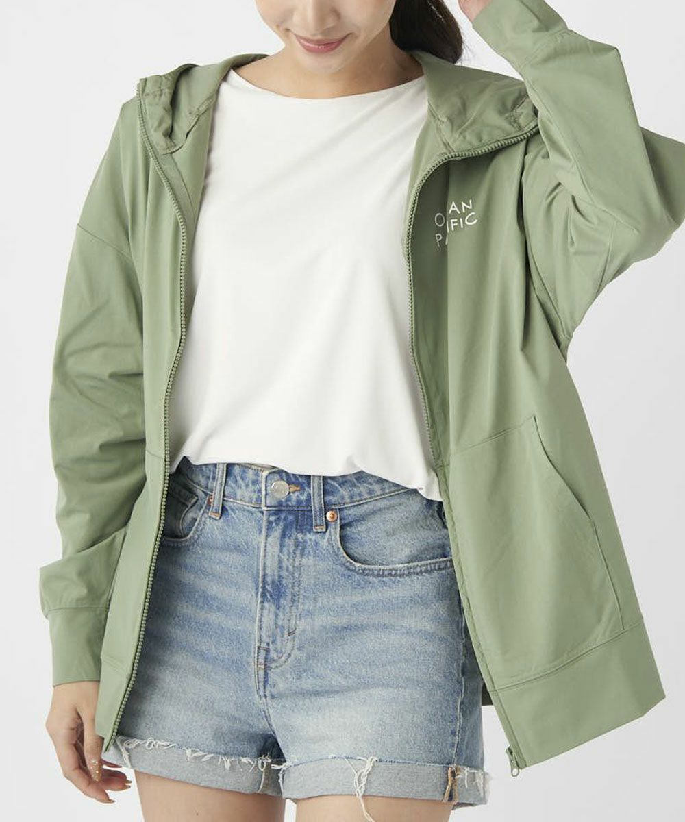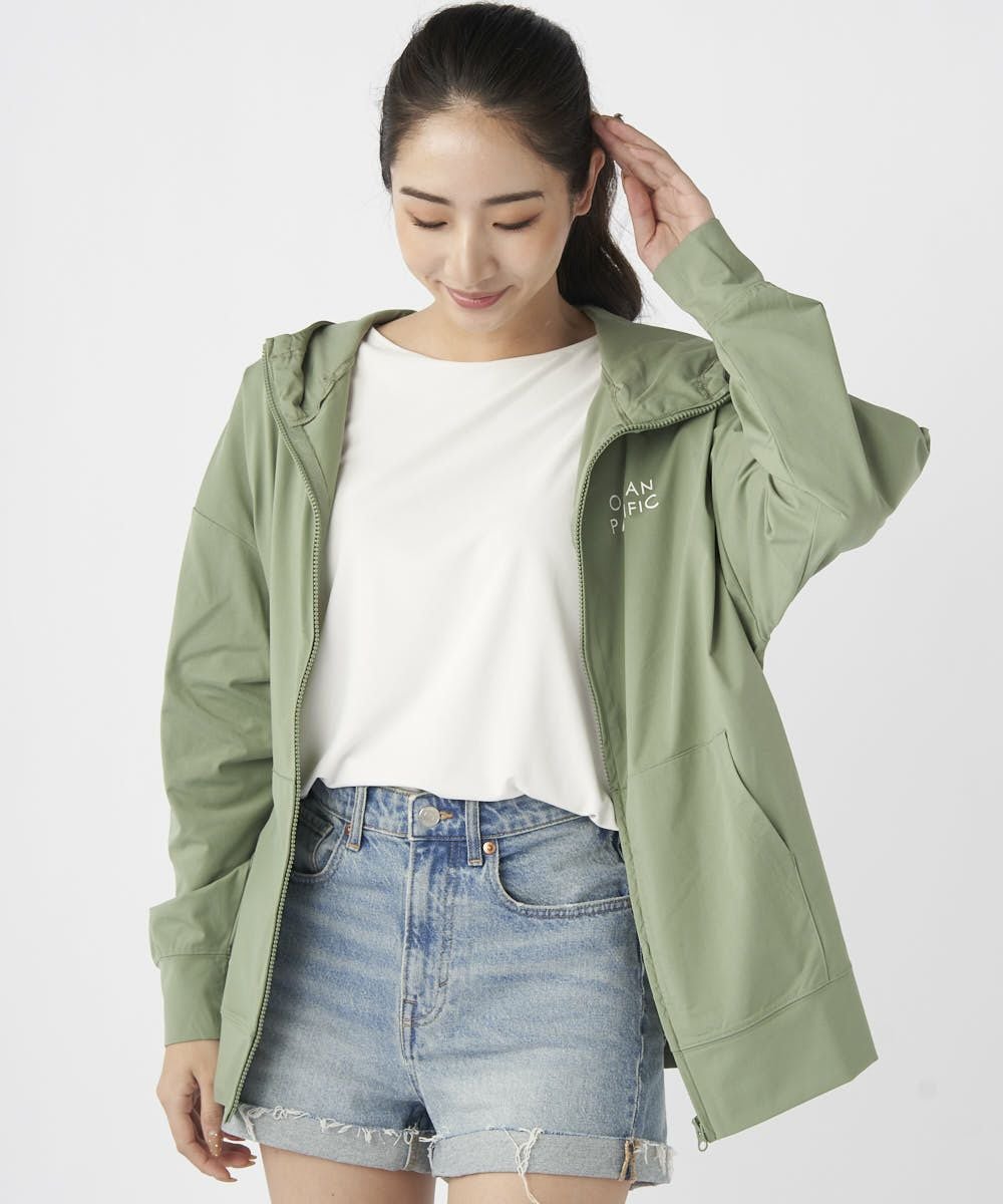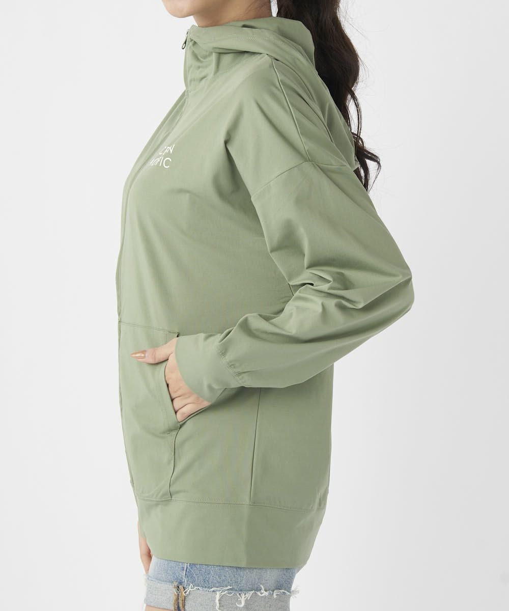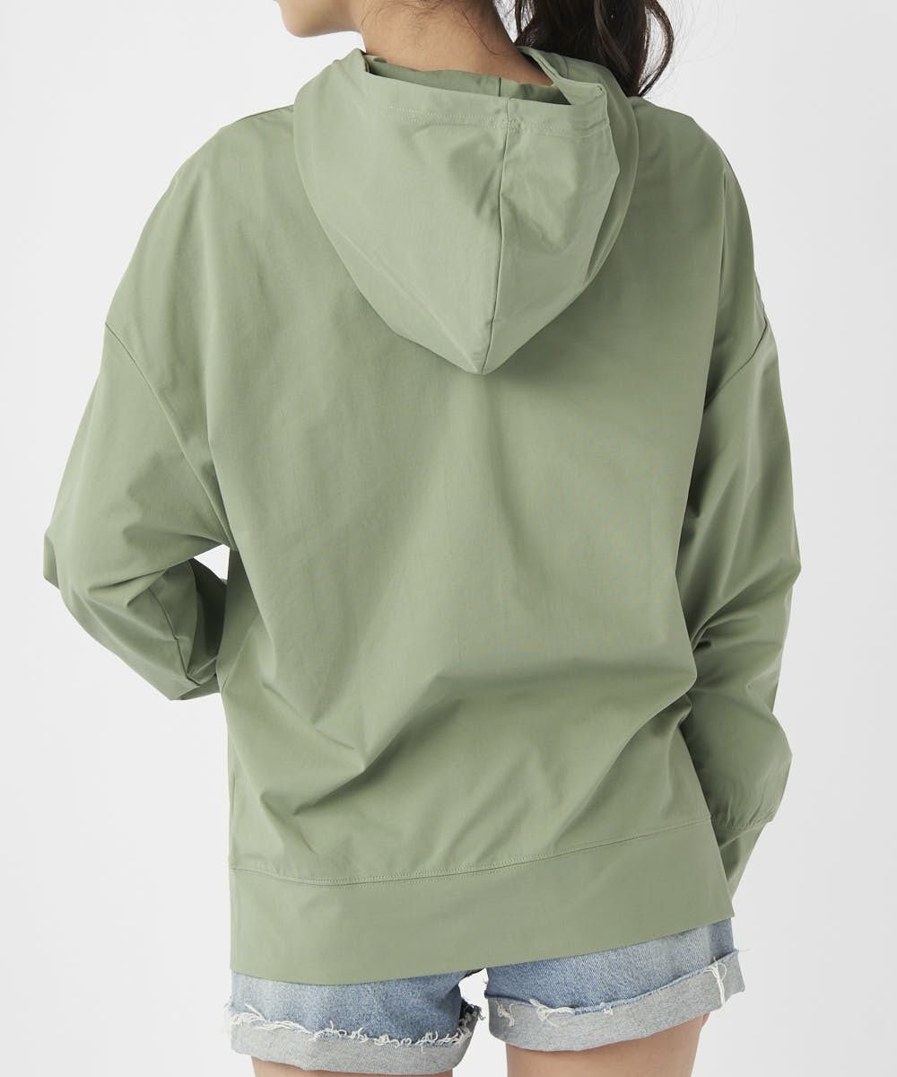 ポリエステル100%で軽量ながら、ストレッチ性と速乾性、UPF50+のUVカット機能をもったペアテックスを使用しました。 汗などの水分を吸い取ってサラサラな着心地をキープ。 まるで綿素材の様なマットな見え方なので、水着と合わせたコーデはもちろん、ランニングなどのフィットネス、トレーニングウェアやヨガウェアにもおすすめ。 袖口リブ仕様で安心感があり、カンガルーポケット付きで便利!またジップを閉めた際に、しっかり首部分もガードしてくれる襟の高さがあるのも嬉しい!アウトドアでの日焼け対策や野外ライブ・フェスやサウナやスパでもオススメです。 またシワにもなりにくいので、旅行やリゾート持っていくのにもぴったりです。