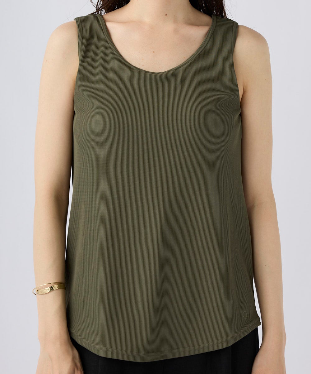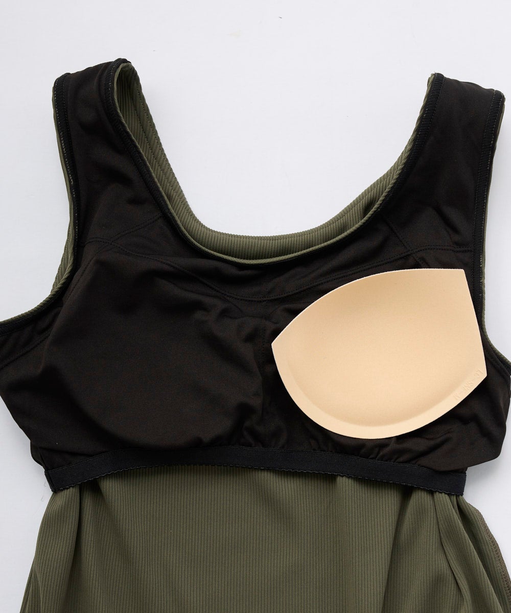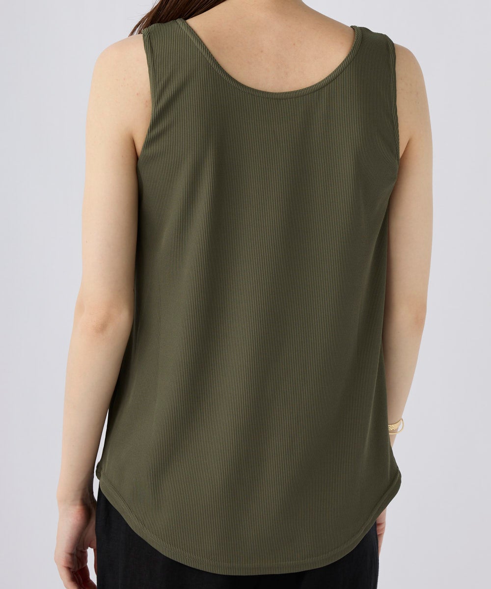 ストレッチ性が有り、UVカット、耐塩素の機能付きリブで水陸着用可能なハイブリッド商品。カップ付きです がゆったりとしたしたシルエットのタンクトップ。カップは取り外し可能。