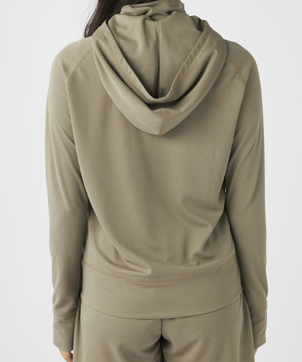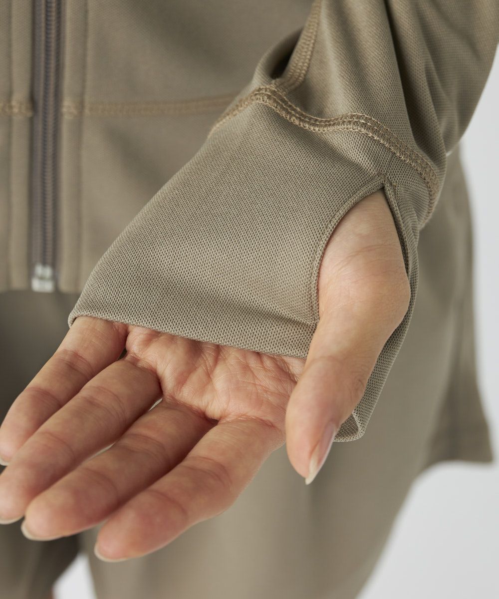 取り外し可能なフード、サムホール付きで紫外線対策もばっちり。