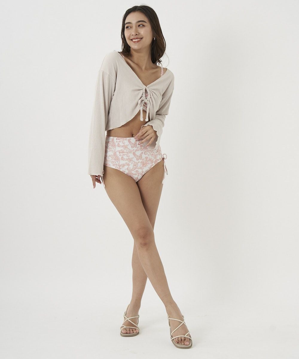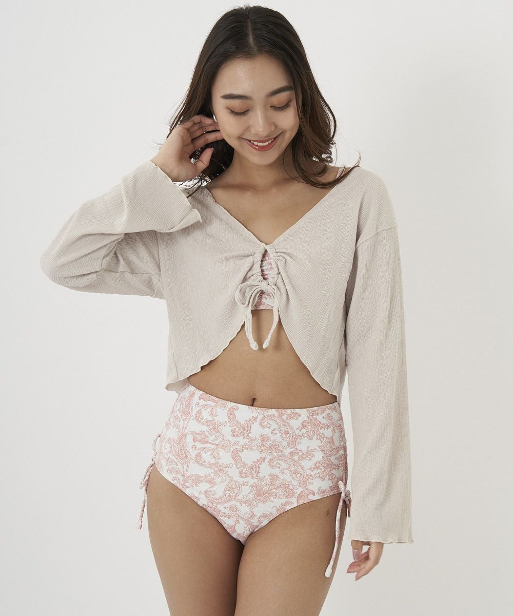 素材が凸凹したシワ素材で見た目にも通気性にも優れた水着セット。とにかくシワ素材のボレロが可愛い!!普段にもカーディガンとして使えます♪水着の柄は淡いペイズリーで大人な水着です。