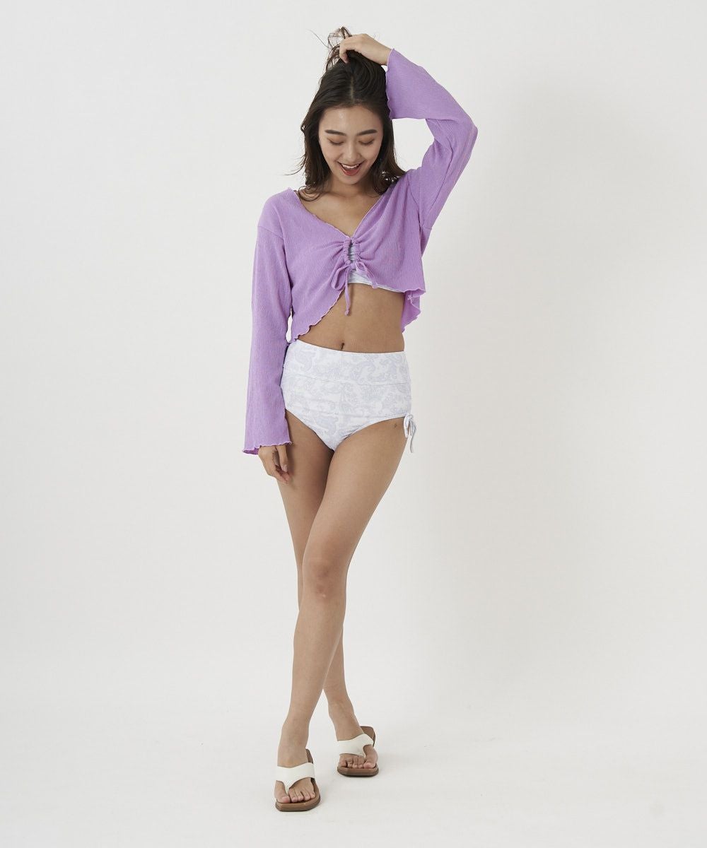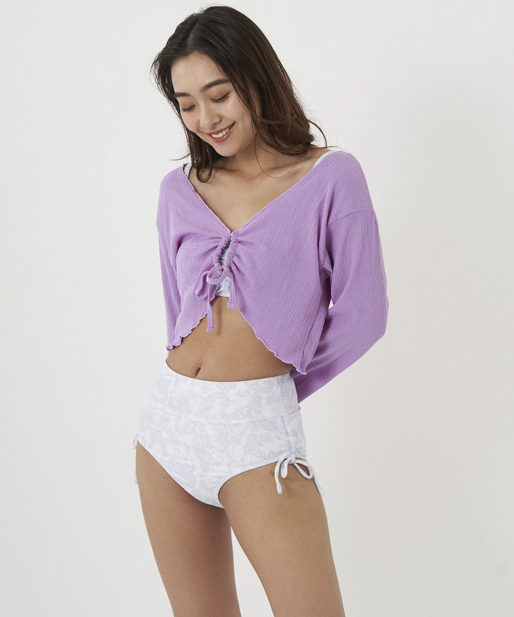 素材が凸凹したシワ素材で見た目にも通気性にも優れた水着セット。とにかくシワ素材のボレロが可愛い!!普段にもカーディガンとして使えます♪水着の柄は淡いペイズリーで大人な水着です。