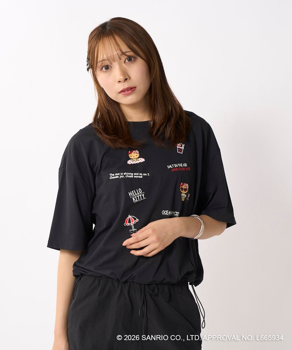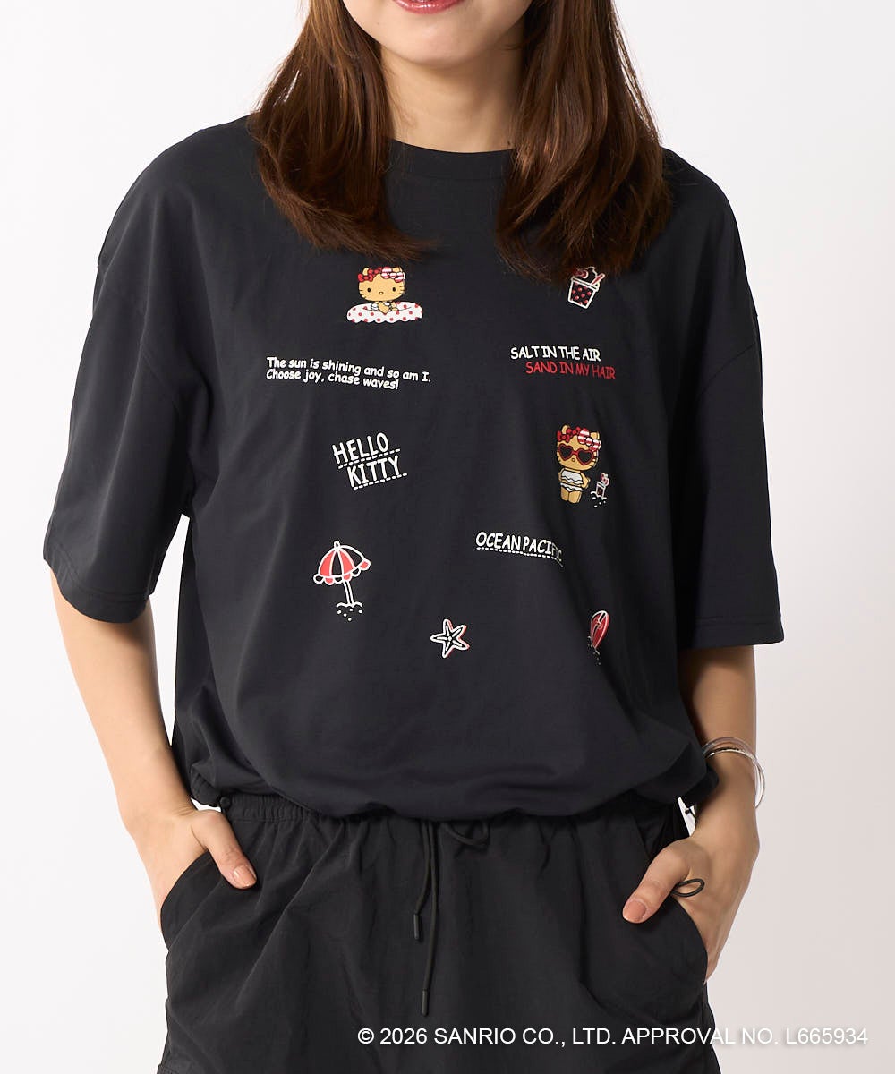 フロントには、ハローキティやロゴ、ビーチをイメージさせるモチーフを散りばめたキュートなラッシュTシャツです。