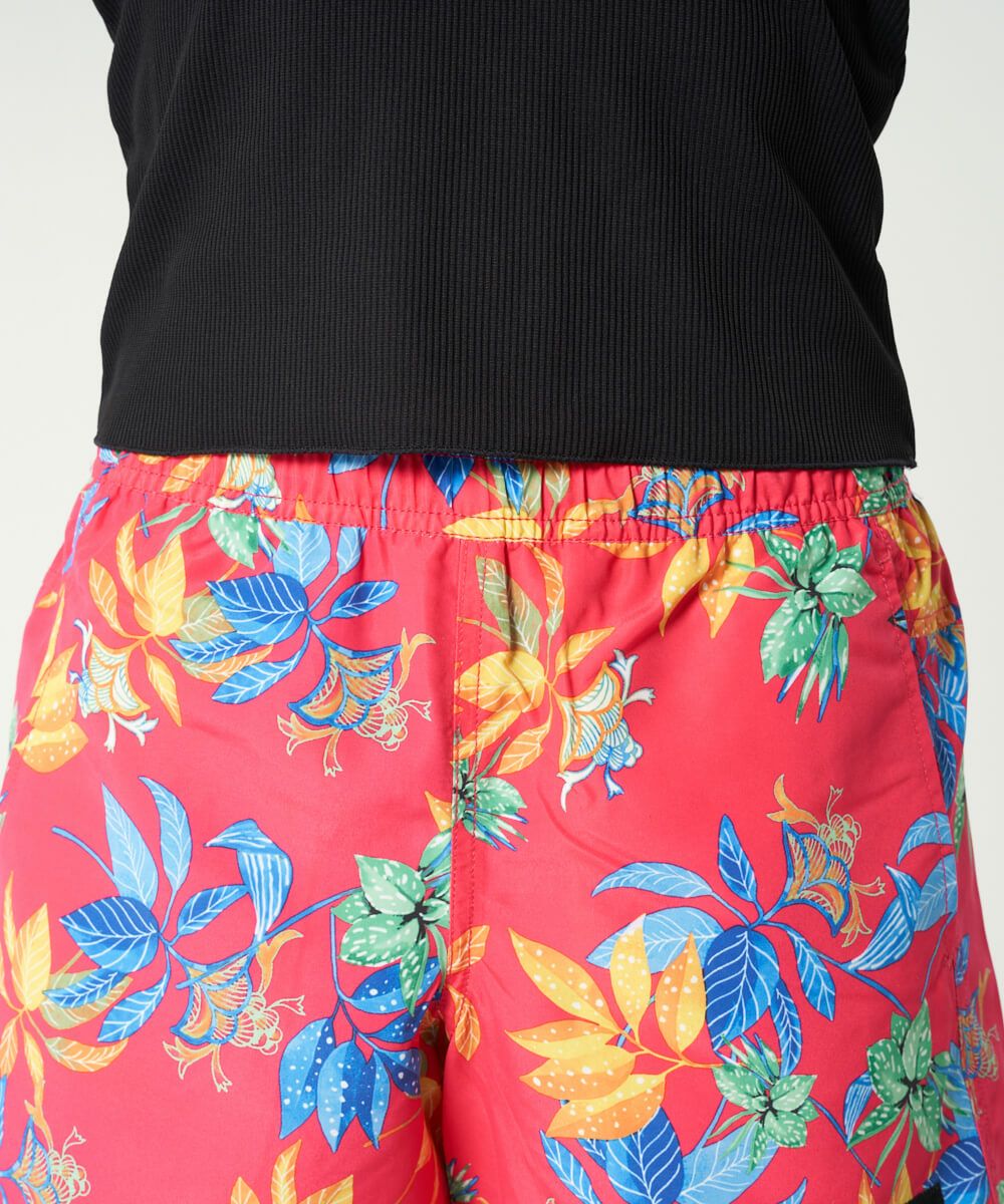 カラフルな総柄が可愛いボードショーツ。ウエストはゴム使用で履きやすく、紐も付いてるので多少の調節は可能。