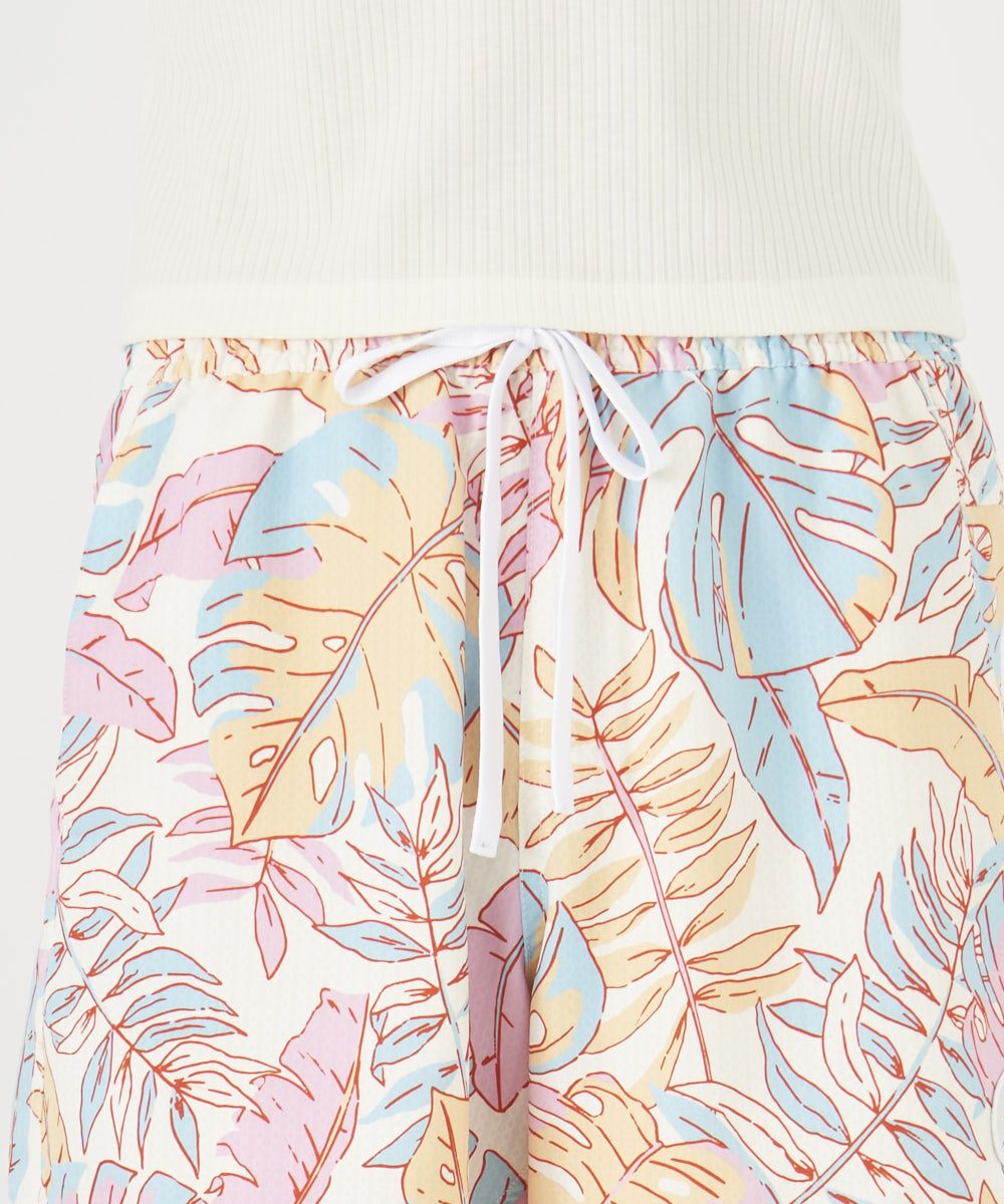 ポリエステルとポリウレタン糸をX字にジャガード織りした4WAYストレッチ素材を使用。ポップなパステルカラーのシーズン総柄ボードショーツ。