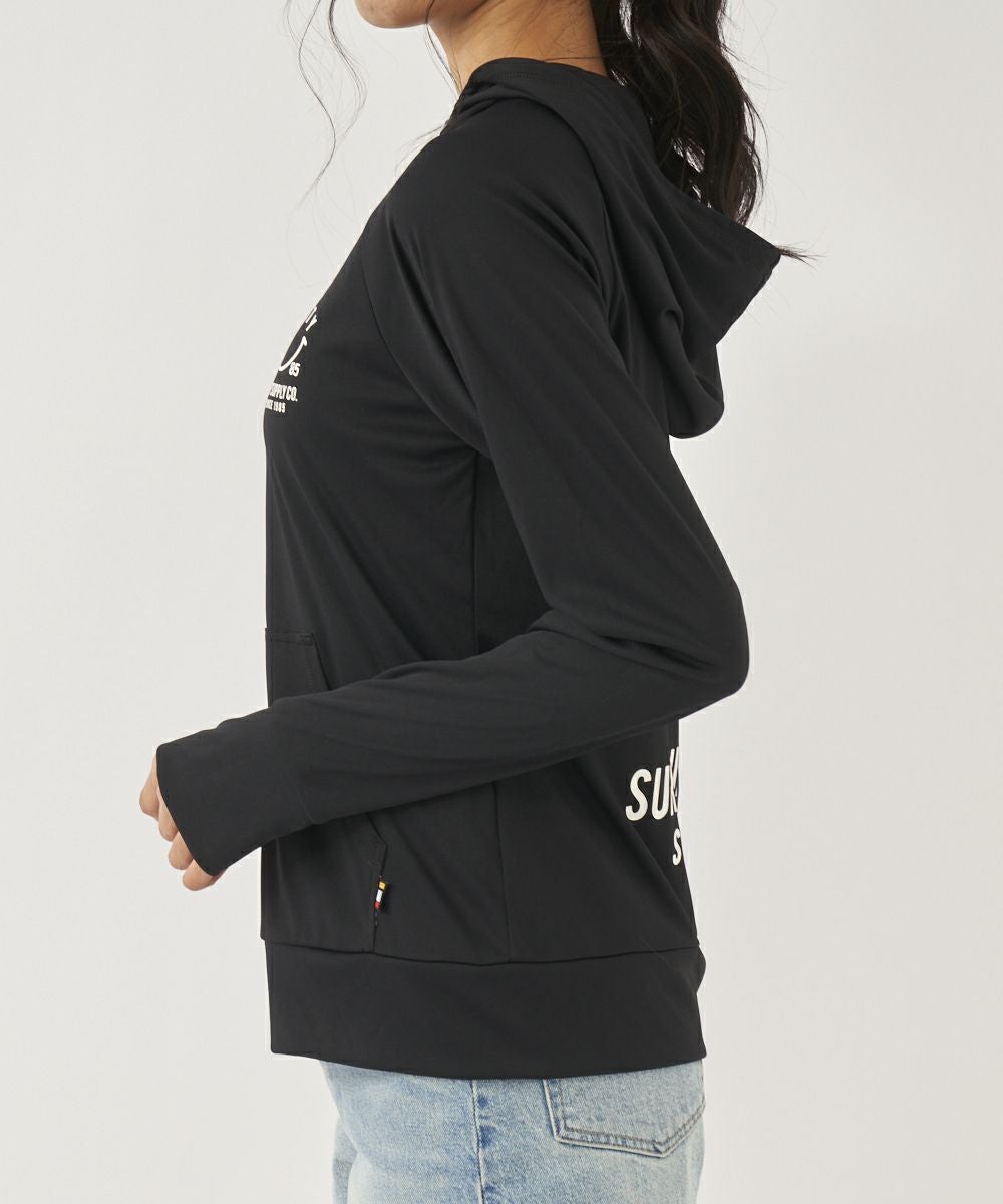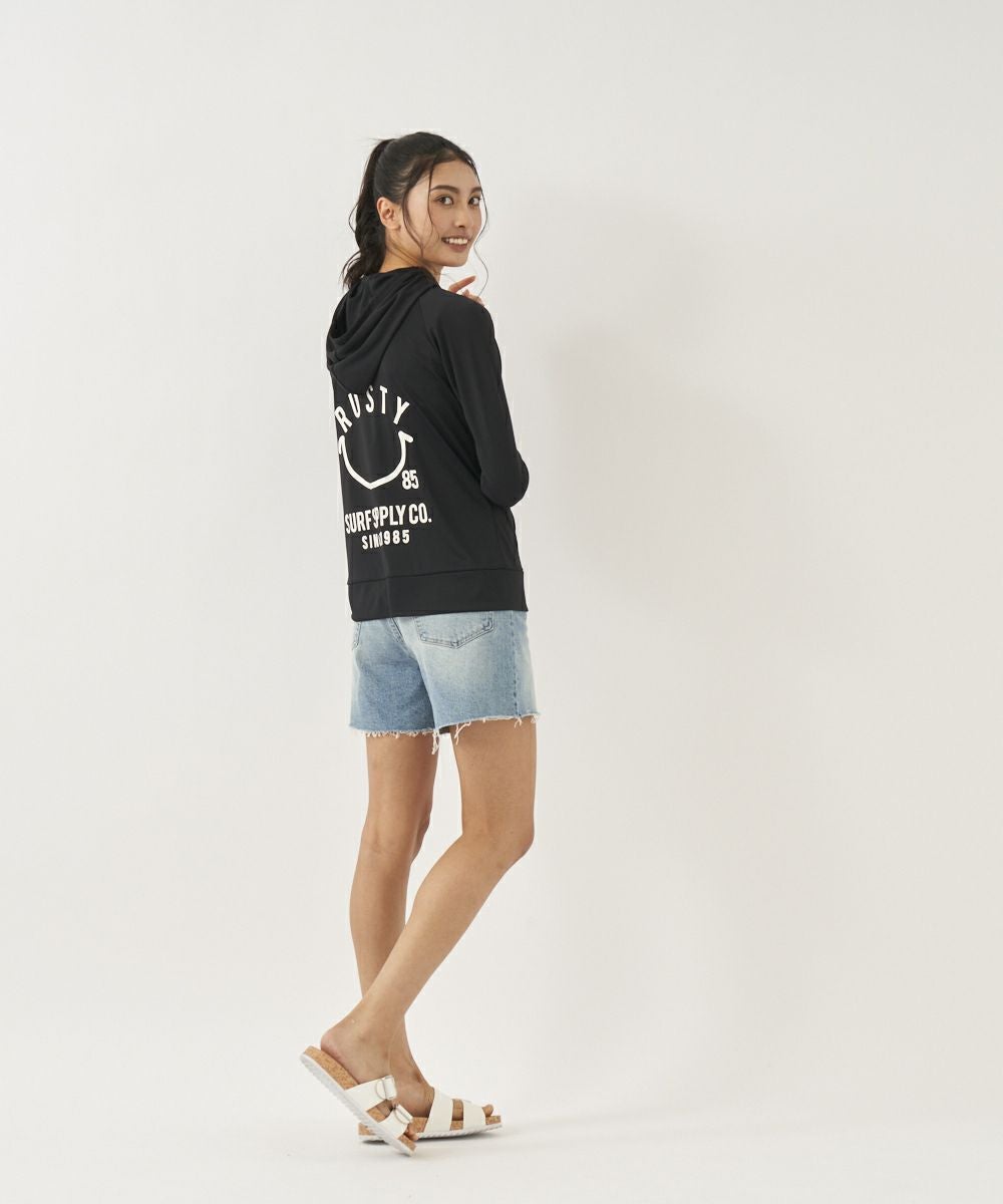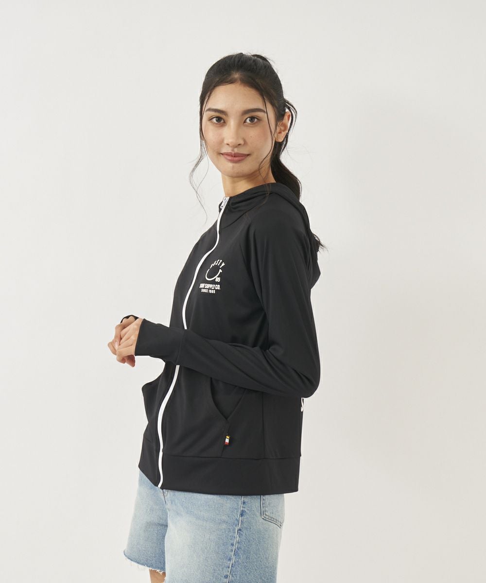 吸汗速乾、UVカット機能を兼ね揃えたポリエステル100%のスムース素材を使用。 人気のニコちゃんシリーズに新色が登場!胸と背中のニコちゃんモチーフがポイント。フード付き。
