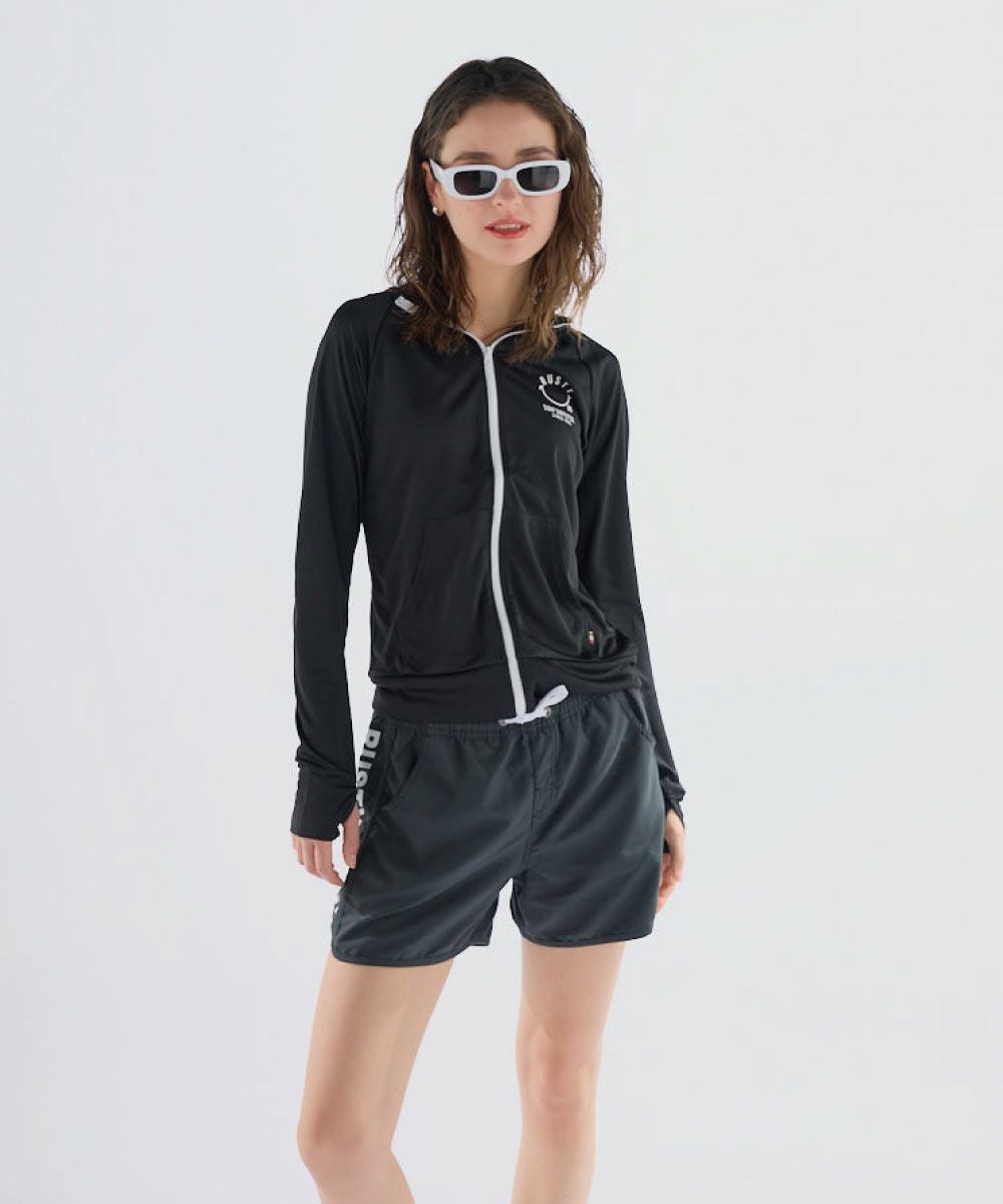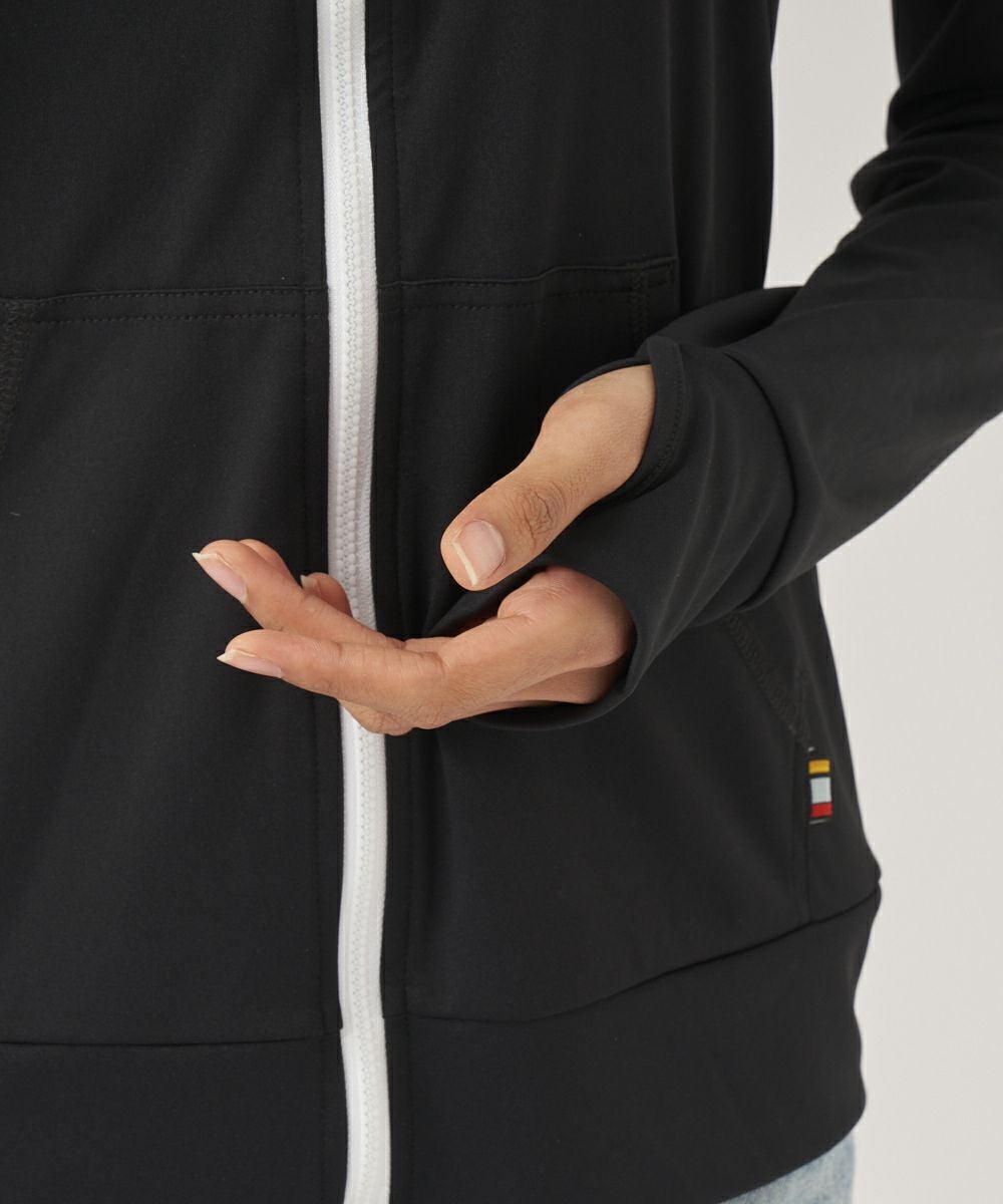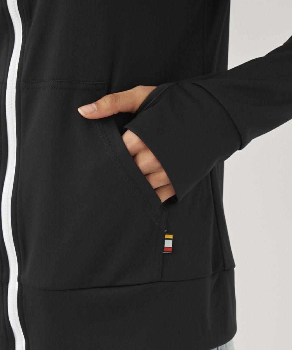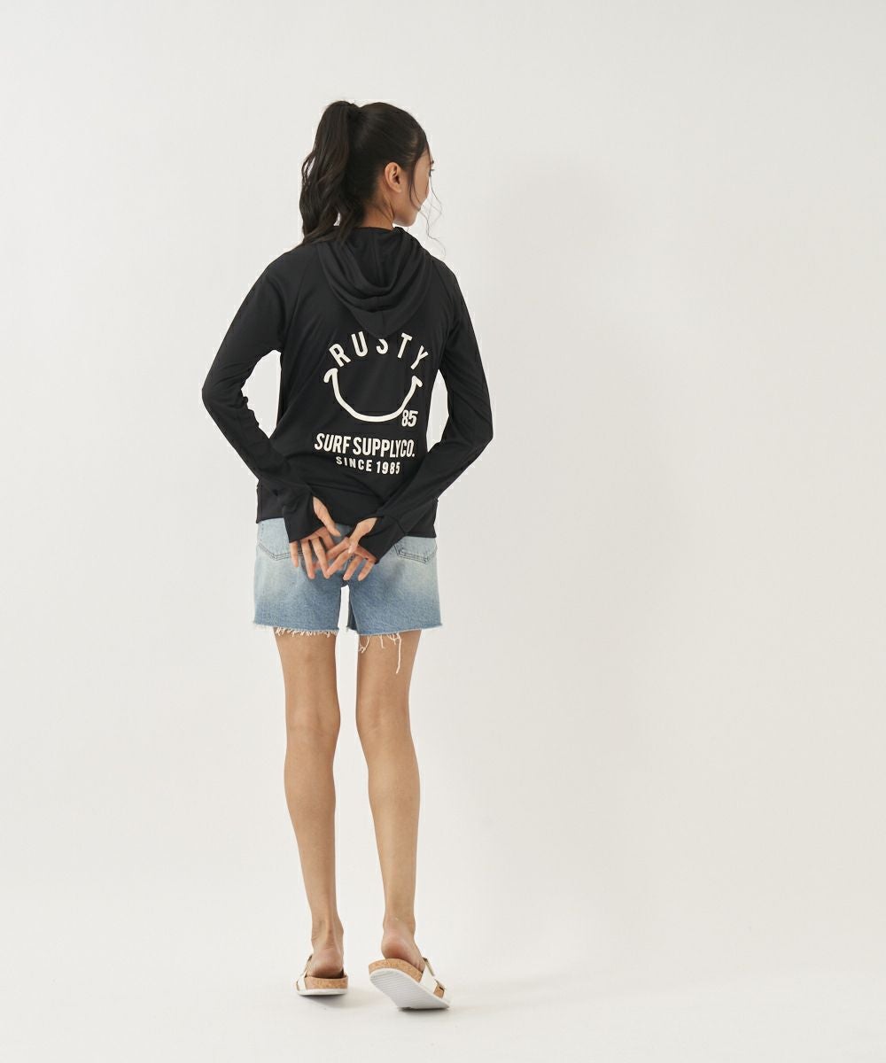 吸汗速乾、UVカット機能を兼ね揃えたポリエステル100%のスムース素材を使用。 人気のニコちゃんシリーズに新色が登場!胸と背中のニコちゃんモチーフがポイント。フード付き。