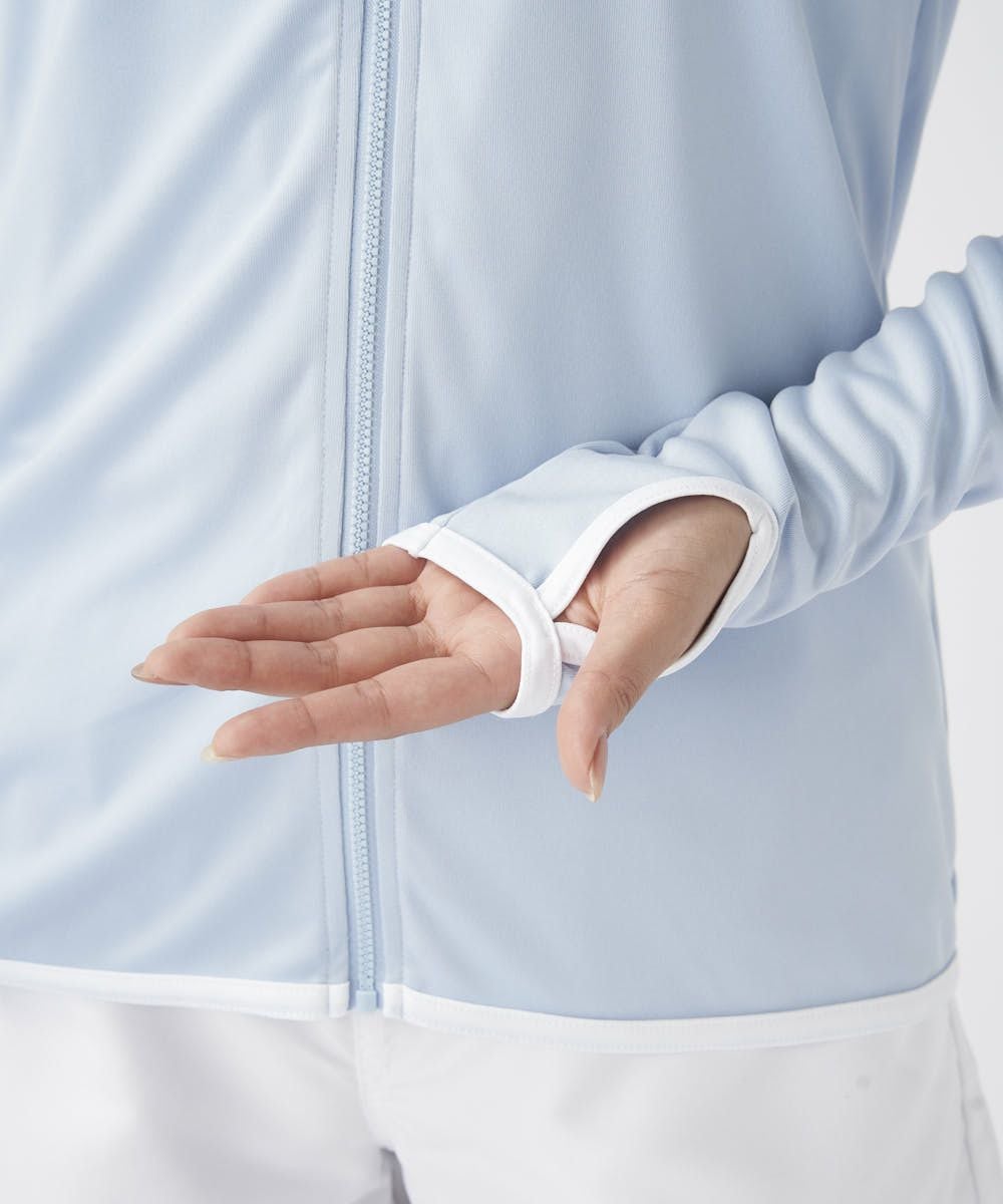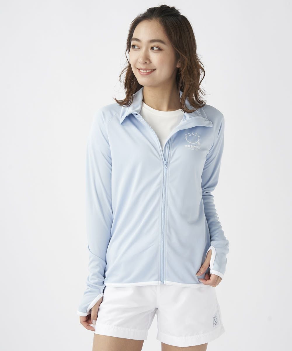 RUSTY人気のニコちゃんシリーズ。フロントジップのスタンドカラー仕様です。 素材は超軽量のポリエステルスムース生地で、吸汗速乾とUVカット機能を兼ね揃えています。