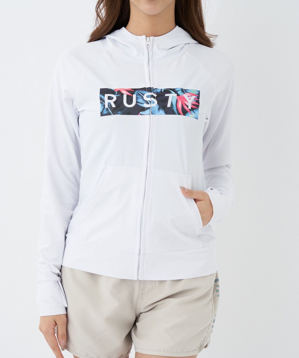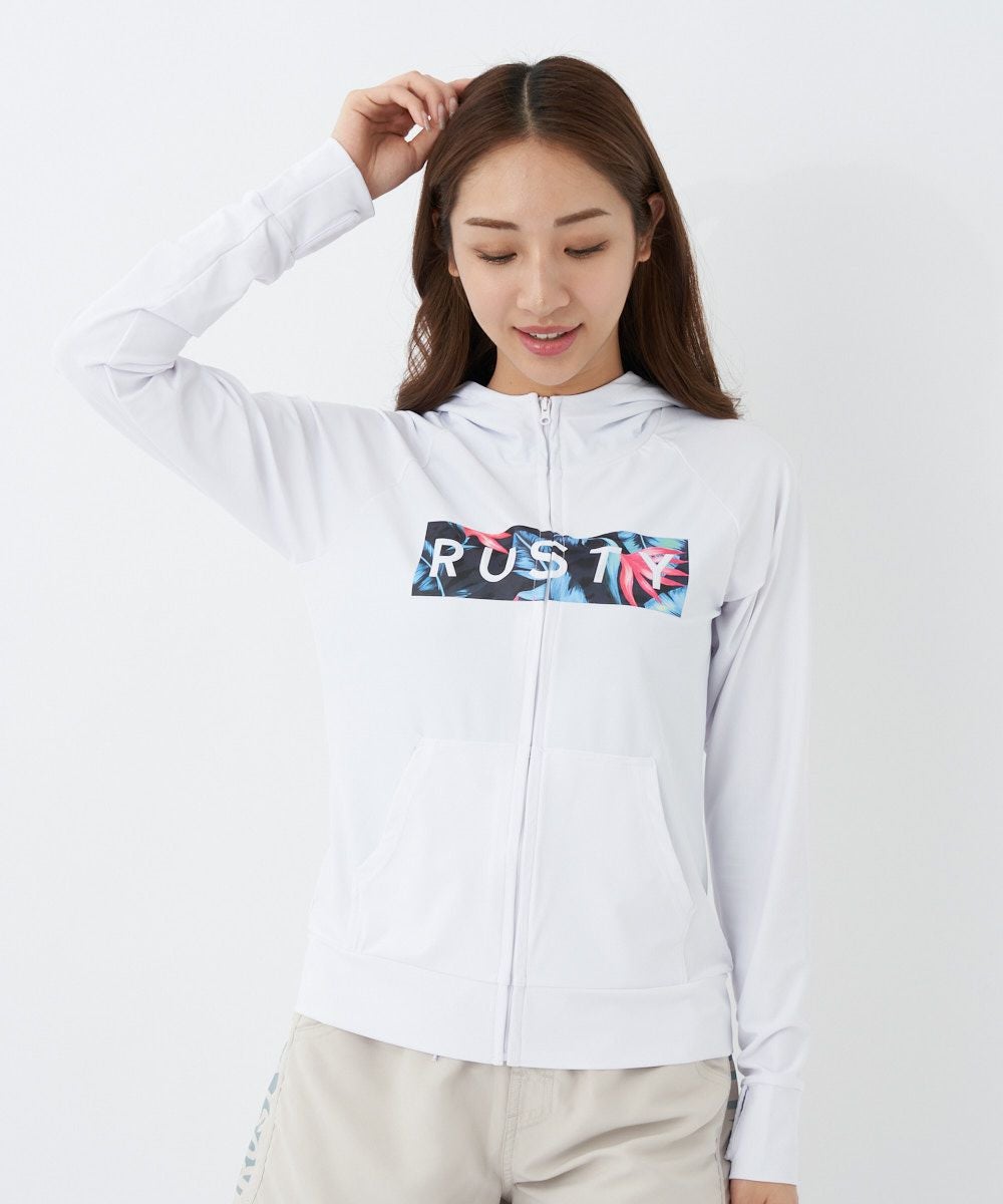 2WAY素材のジップパーカー。フード裏にはシーズン柄をレイヤード。 胸に配置したブランドロゴの中にも柄を連動させたデザイン。
