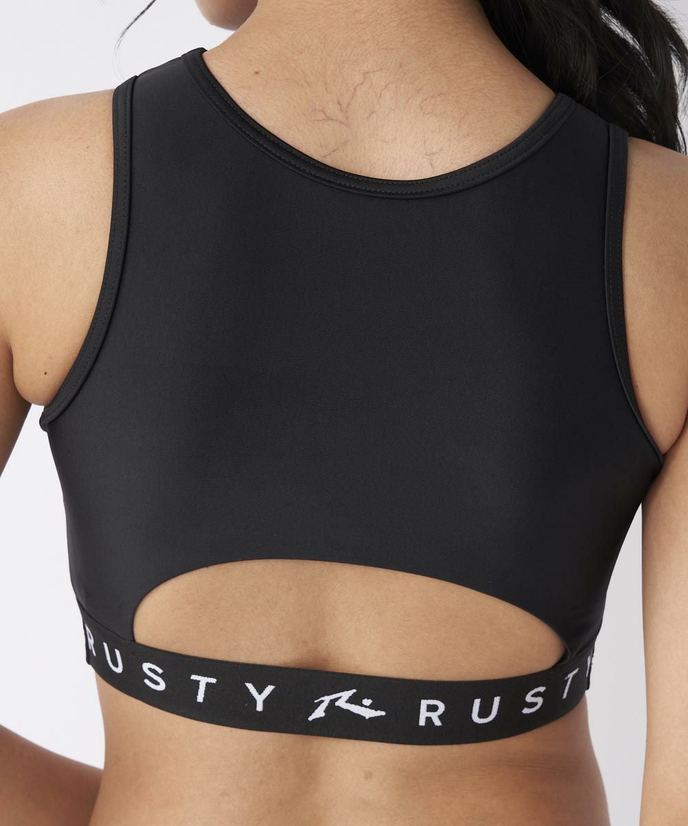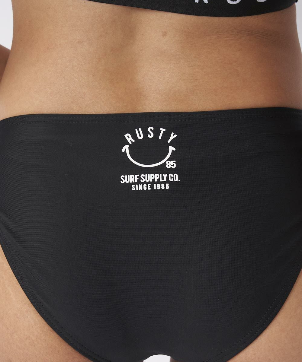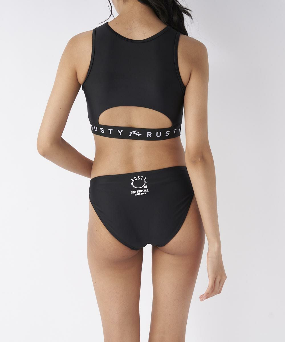 RUSTYの売れ筋ニコちゃんシリーズ。ポリエステル2WAY素材のスイムウェア。 胸にはブランドロゴをプリント、バック裾にはRUSTYロゴのジャガードゴムでアジャスト。 パンツは腰にニコちゃんモチーフをプリント。