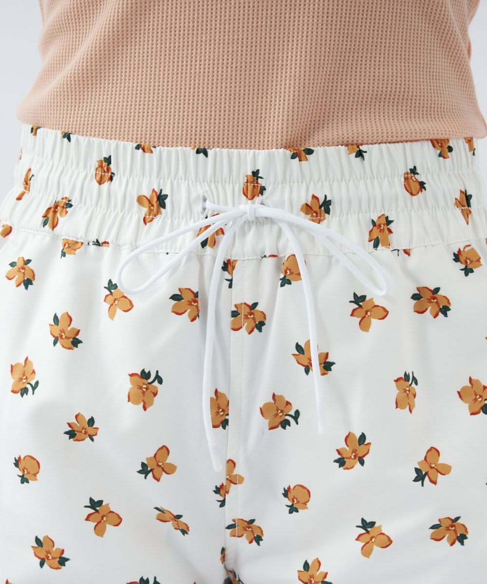 小花柄とPOPなカラー展開が可愛い、ピーチ風のマットな風合いのボードショーツ。股ぐりも深めで履きやすいデザインです。