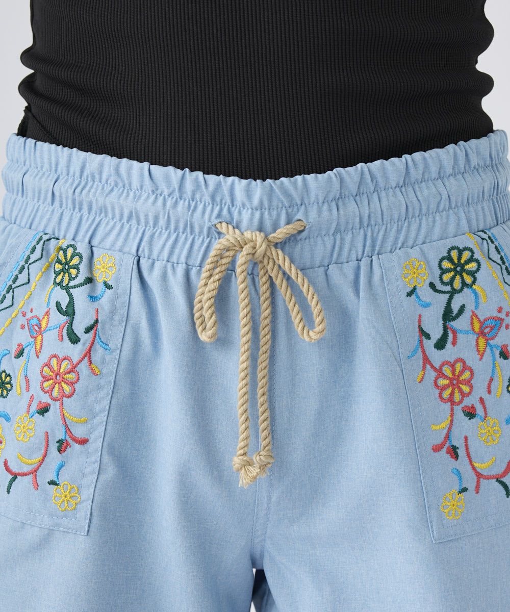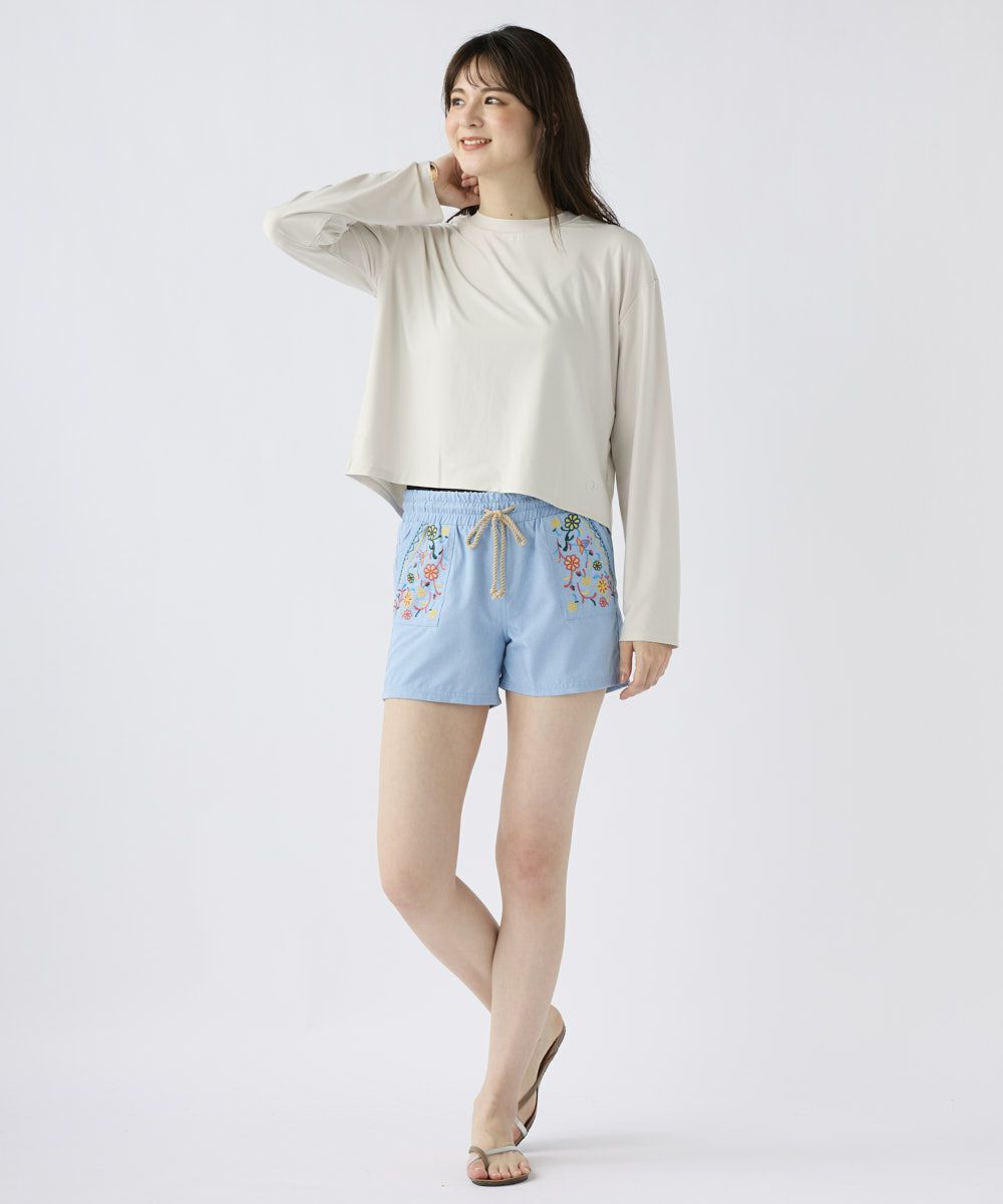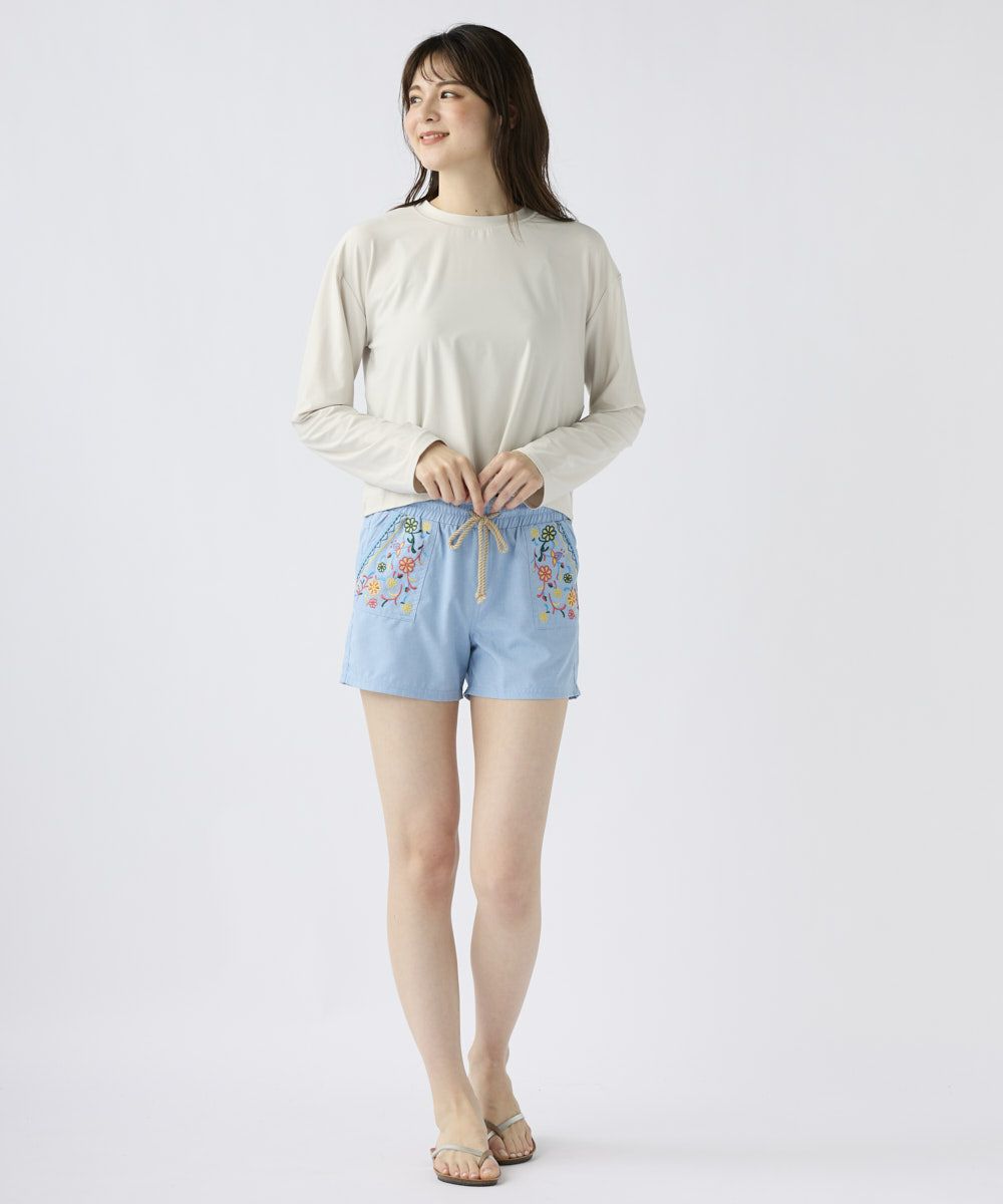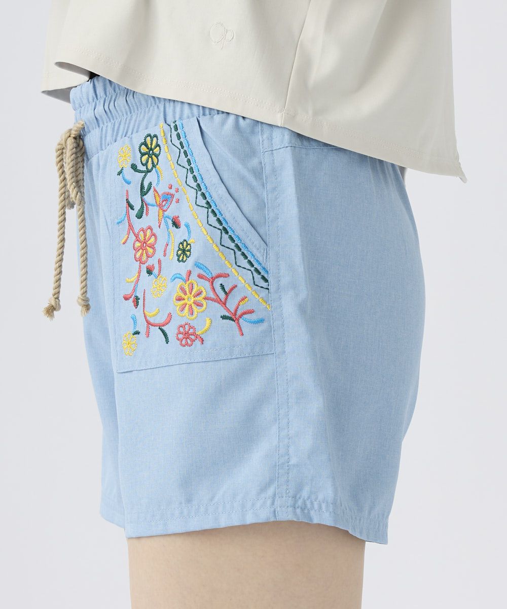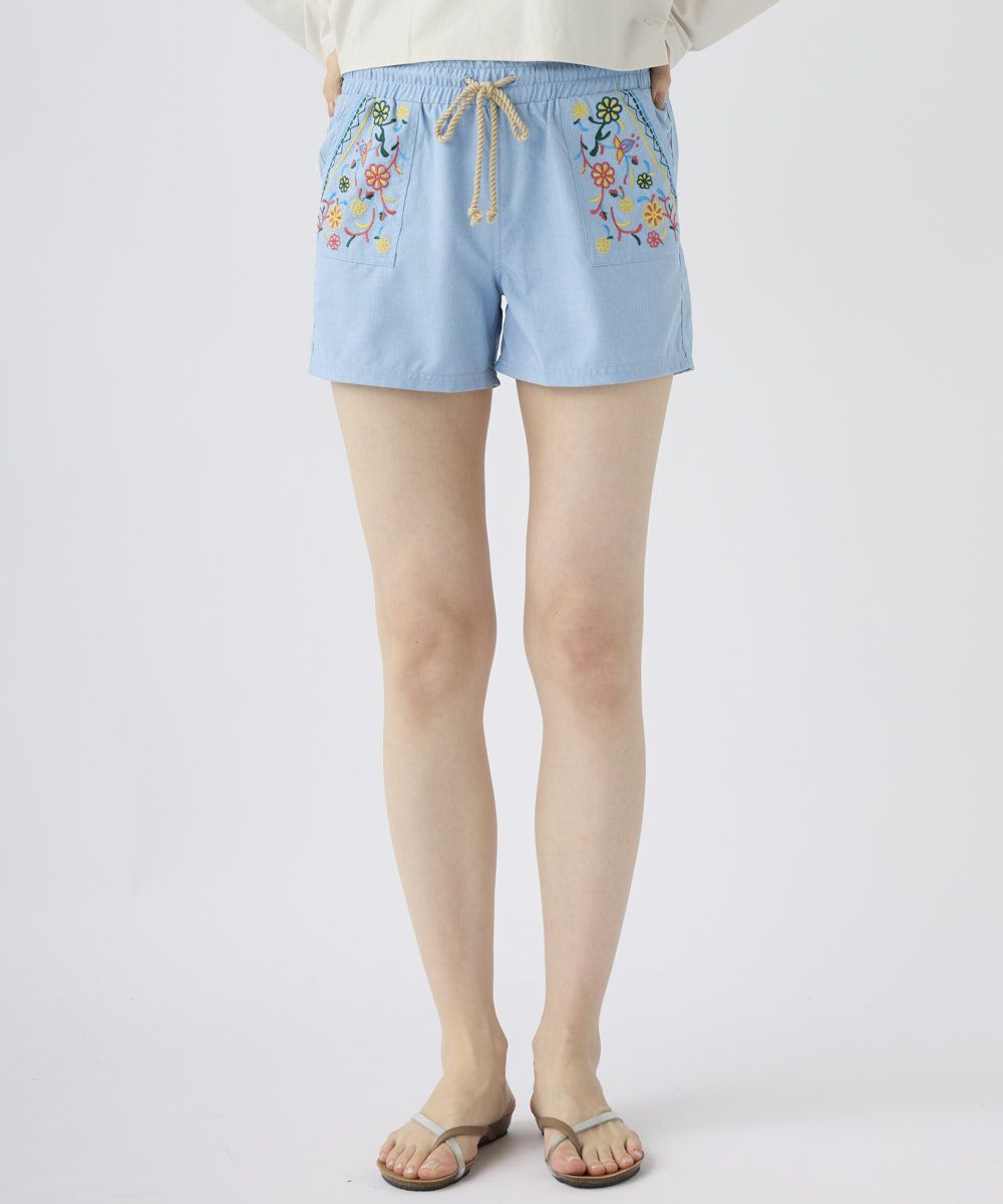 左右のポケット部分の刺繍デザインがキュートなボードショーツ。ウエストがゴムなのが履きやすくて嬉しい。夏のアウトドアにぴったりなアイテム。
