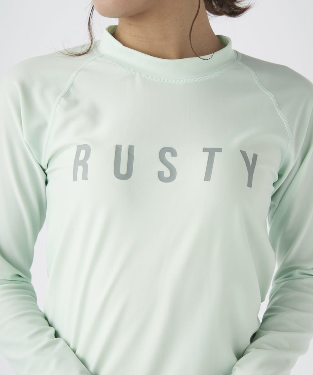 RUSTYの売れ筋ニコちゃんシリーズ。ポリエステル2WAY素材を使用したラグランデザイン。 胸にブランドのロゴをプリントし、背中にはニコちゃんグラフィックを大胆にプリント! ハイネックのプルオーバーラッシュガードです。