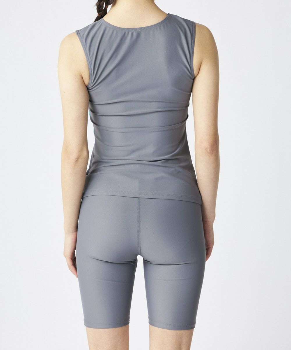 トップス、ボトムス共にバイカラーで切り替えの入ったロゴデザイン柄がおしゃれなフルジップのセパレート水着、フィットネスシーンにおすすめのセパレート水着です。