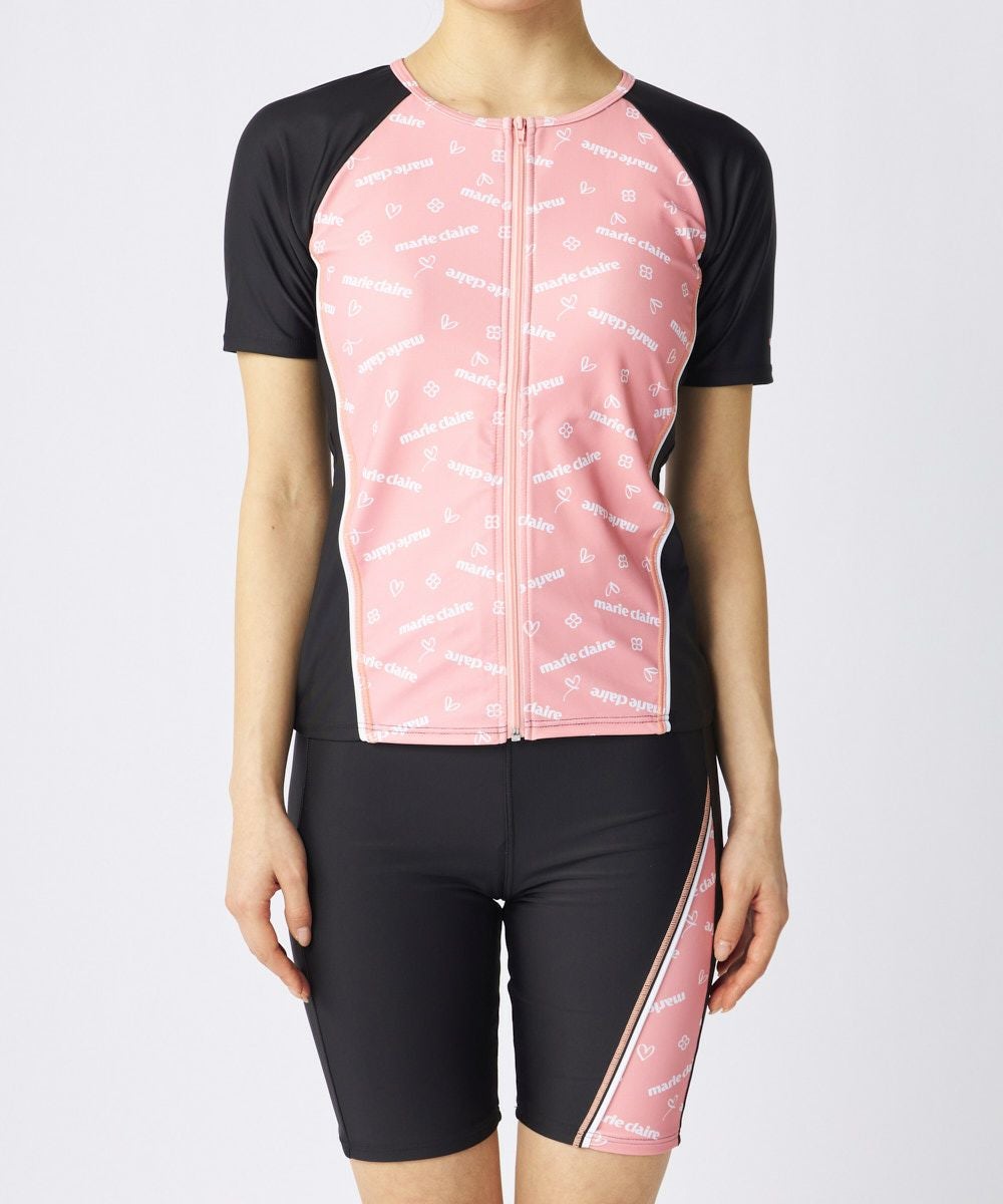 トップス、ボトムス共にロゴデザインがかわいいフルジップのセパレート水着。半袖タイプなので、気になる二の腕を隠し、安心して泳ぐことがでます。フィットネスシーンにおすすめのセパレート水着です。