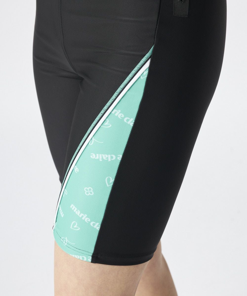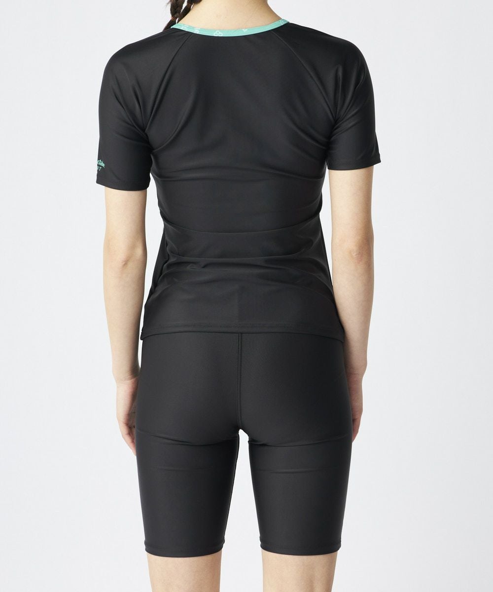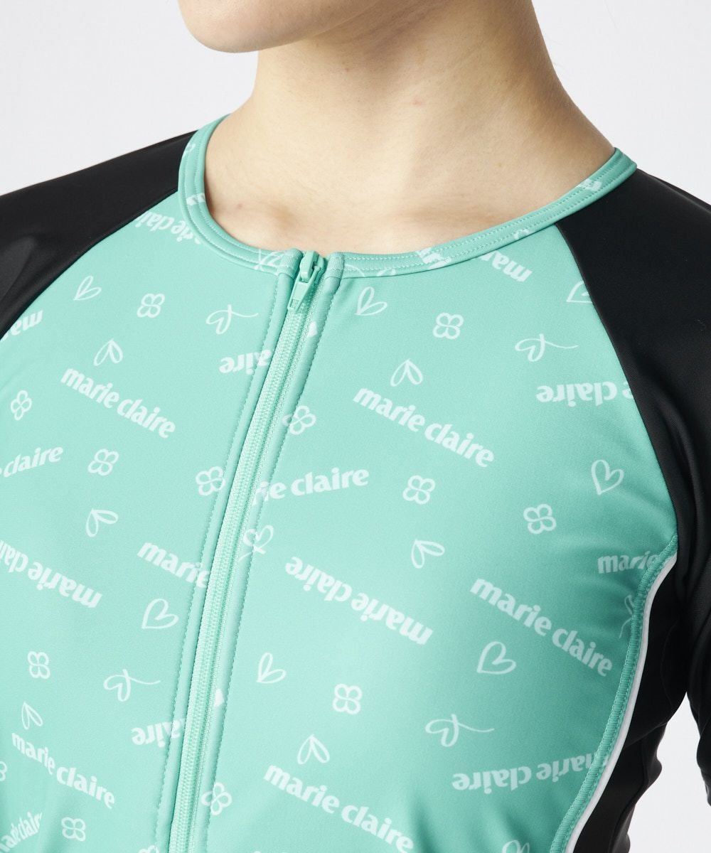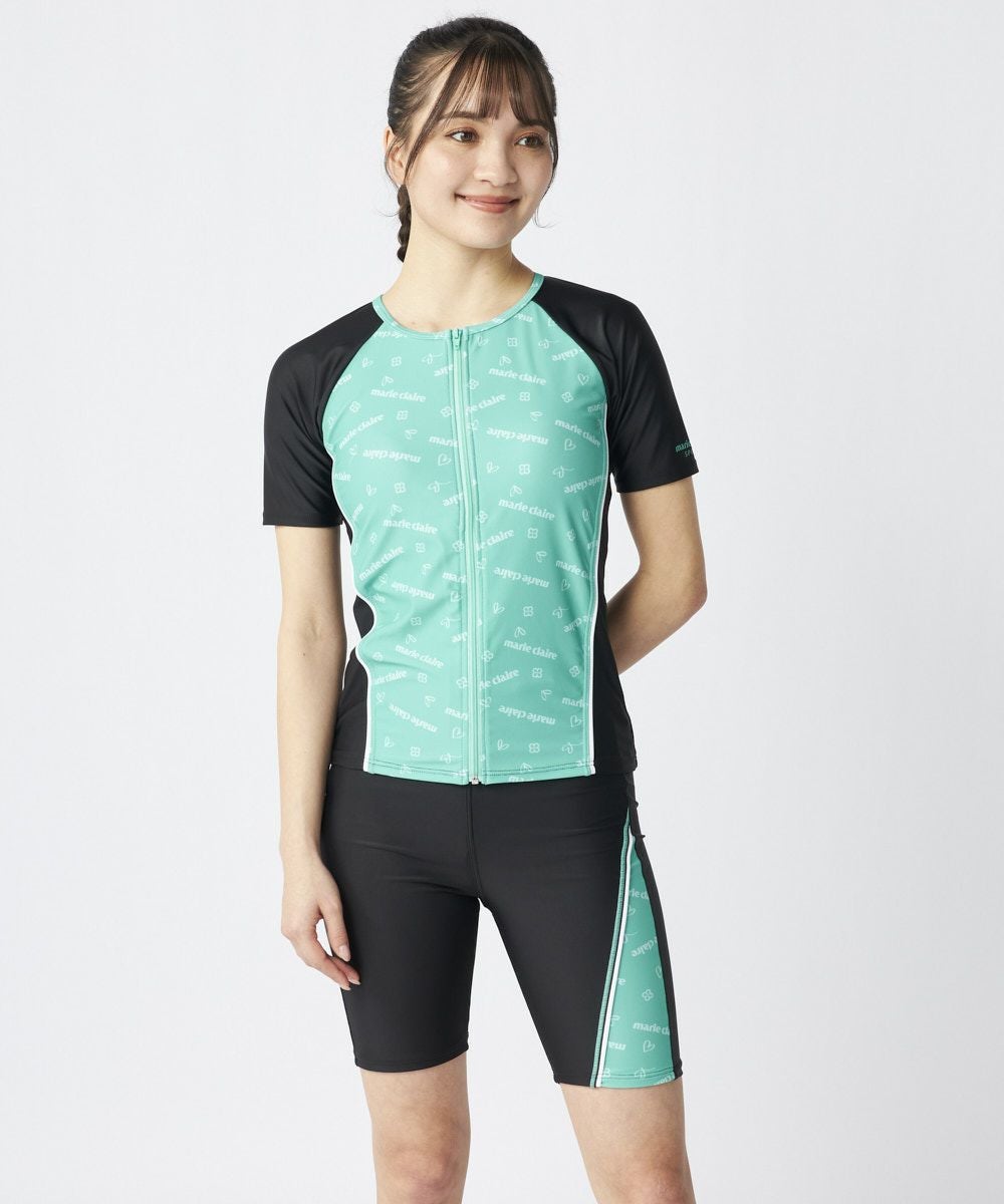 トップス、ボトムス共にロゴデザインがかわいいフルジップのセパレート水着。半袖タイプなので、気になる二の腕を隠し、安心して泳ぐことがでます。フィットネスシーンにおすすめのセパレート水着です。