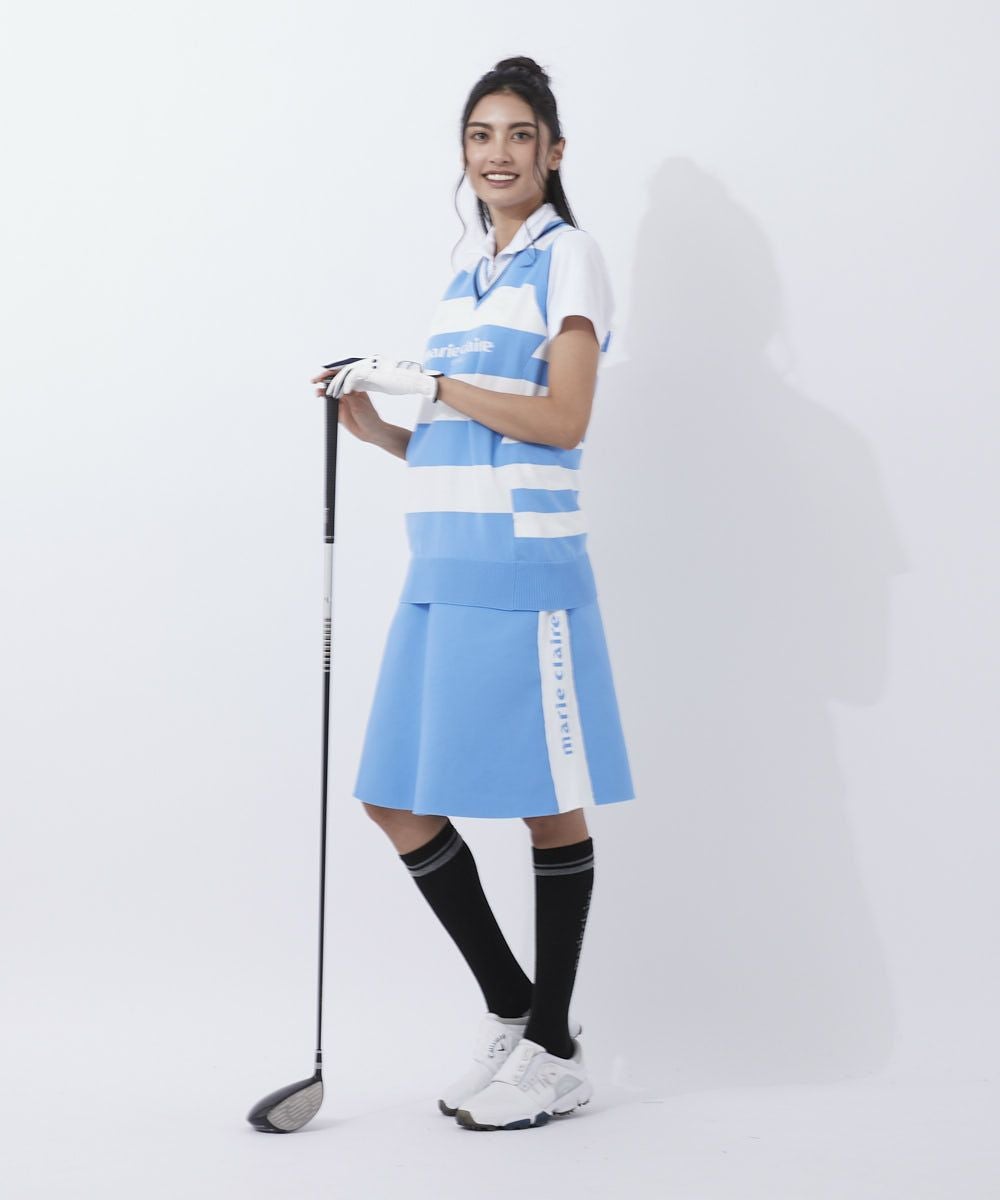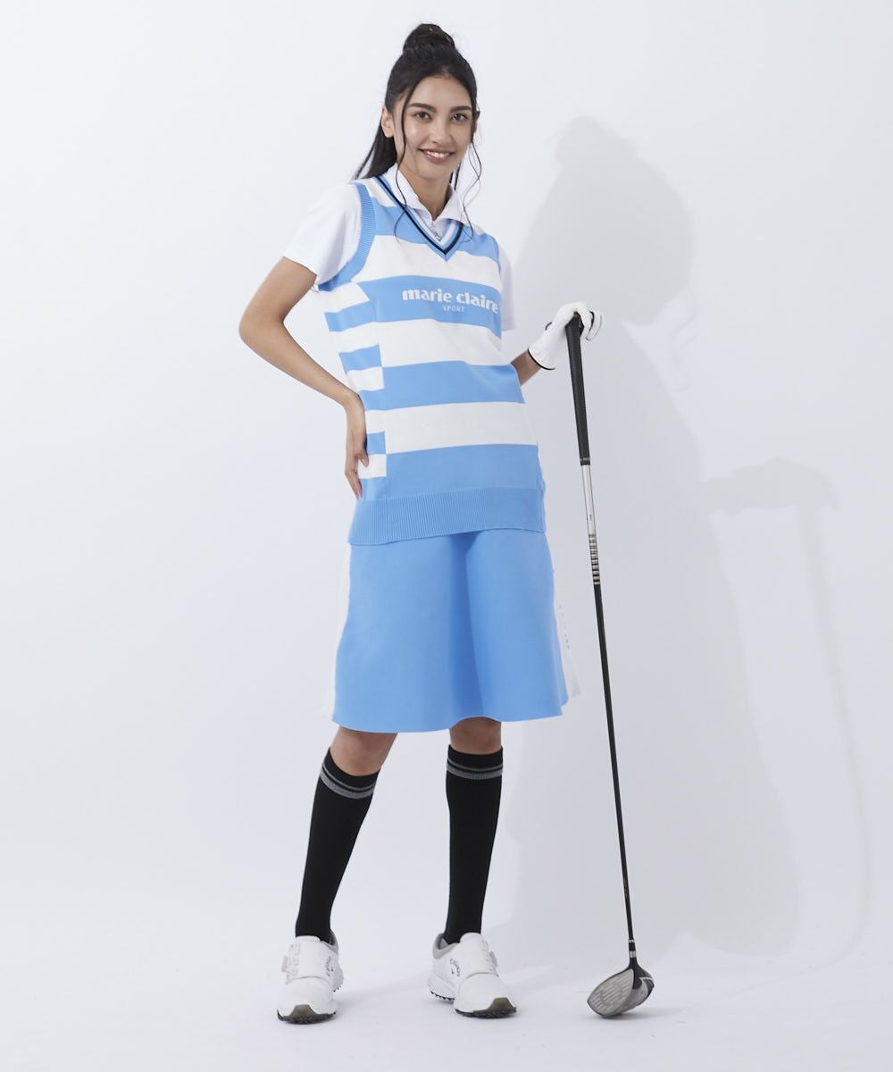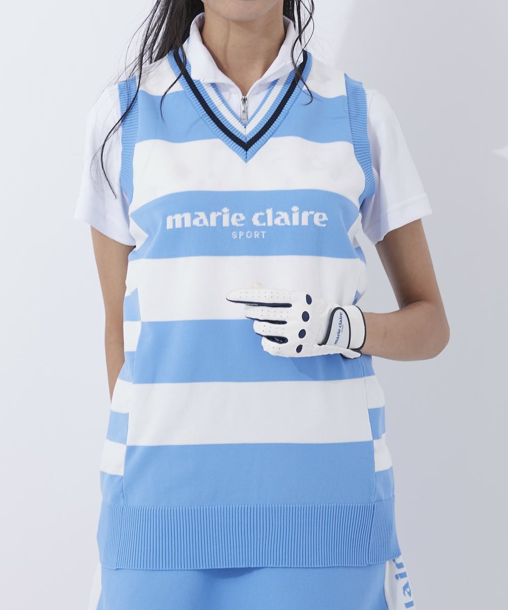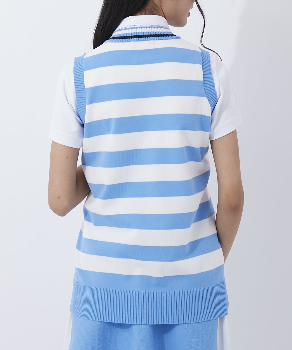 軽量ニットのボーダー柄ベスト。脇部分のピッチ違いのボーダーで細見え効果を期待!