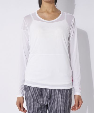 紫外線対策の長袖クルーネックインナーシャツ。軽くて涼しい素材の夏に最適なインナーです。切替メッシュ素材は肌心地が良く快適で、重ね着してもゴワつきません。