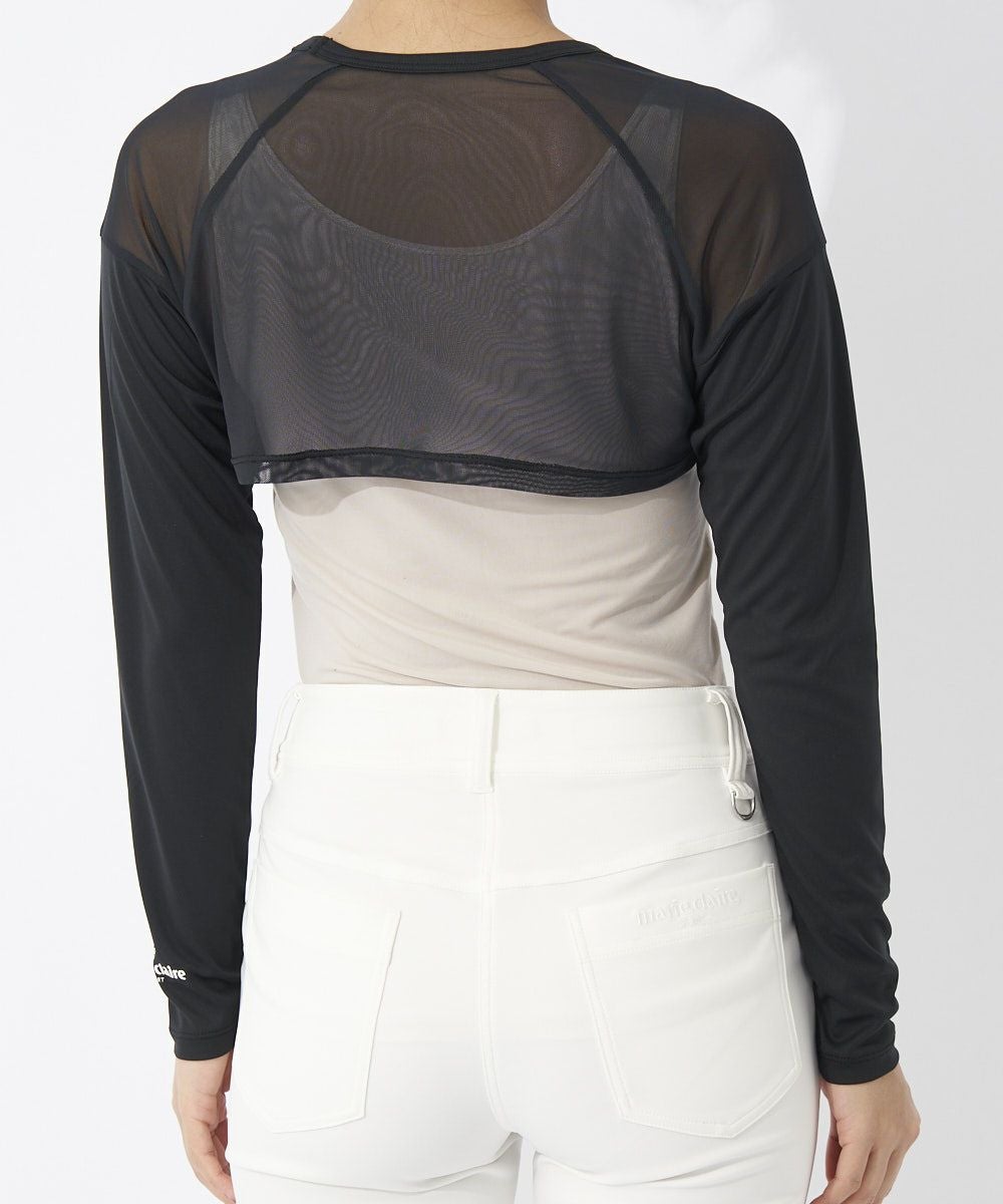 UV対策できるメッシュ切り替えの丸首アンダーシャツのボレロ丈タイプです。首回りがすっきりとしているのでモックネックシャツのアンダーとして着用するのにも最適です!