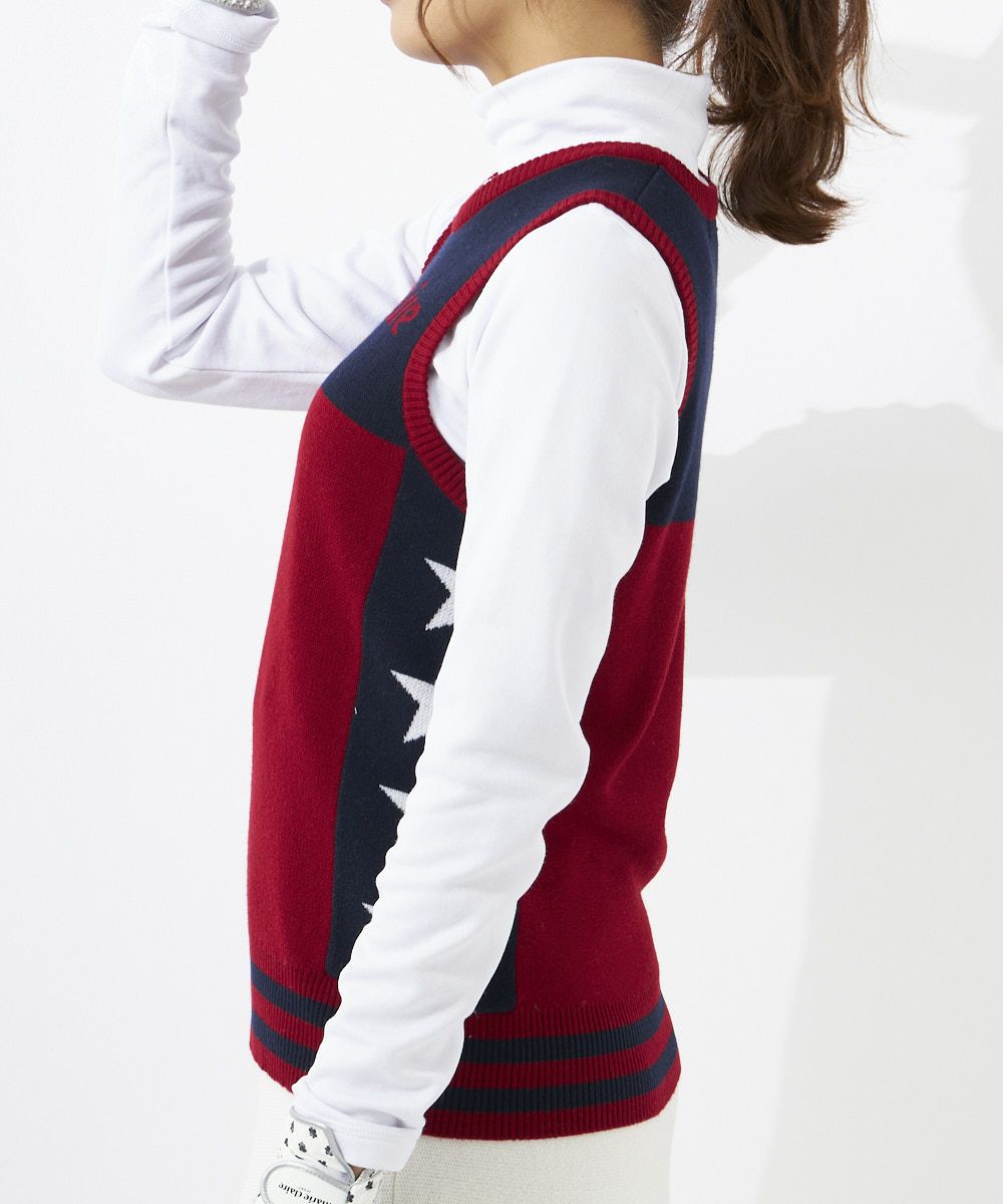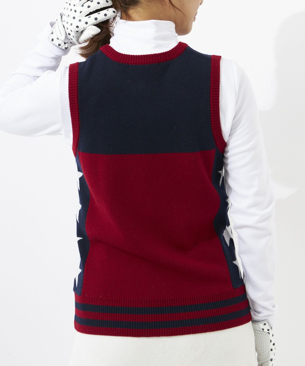 細身え効果のある配色ベストです。サイドの星柄がアクセントに。肌寒いときにインナー上に着て頂けるアイテムとなっております。