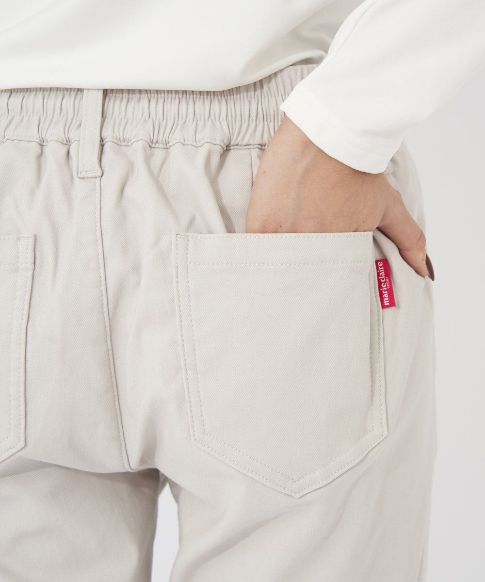 ウエスト背面には、ゴムが入っており、お腹周りも楽に、座った時なども窮屈感なく着用いただけます。