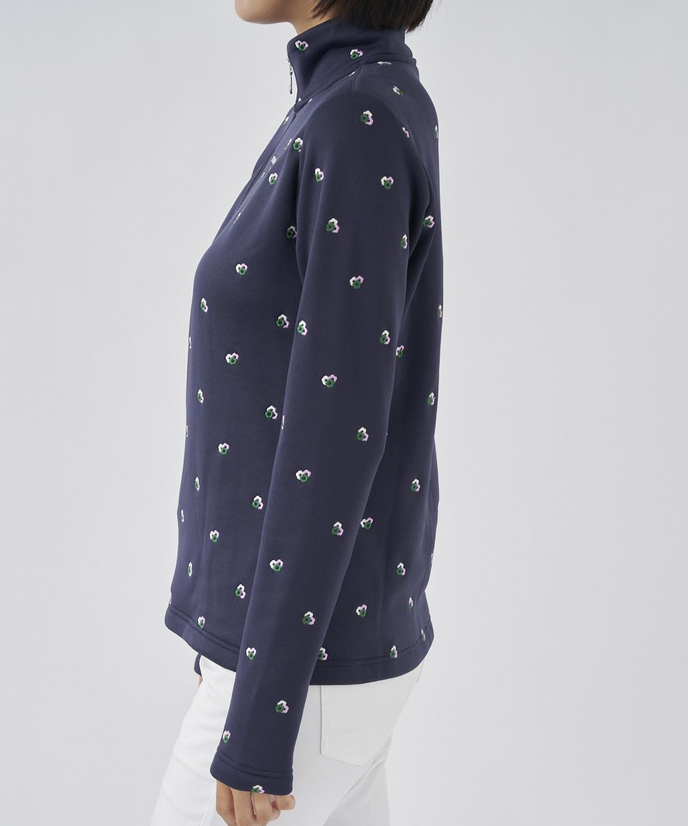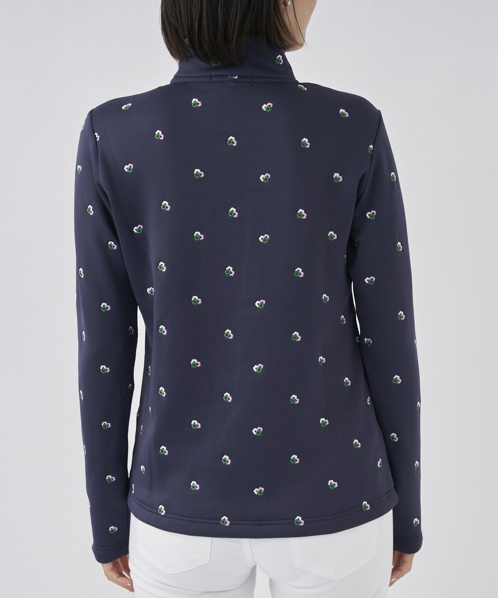 柔らかな肌触りの裏シャギーハイネックシャツです。お花の飛び柄刺繍が可愛い一枚です。
