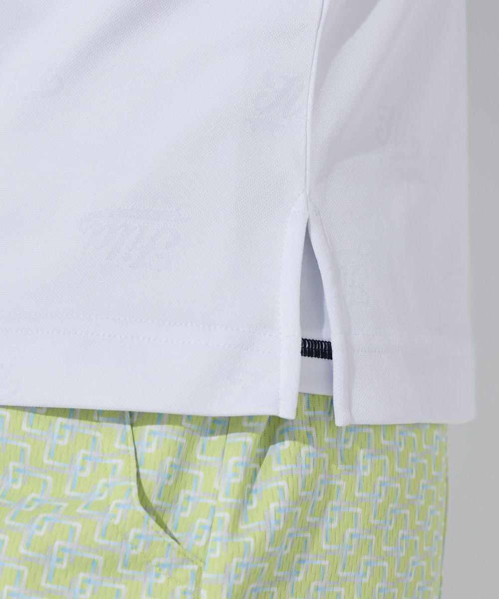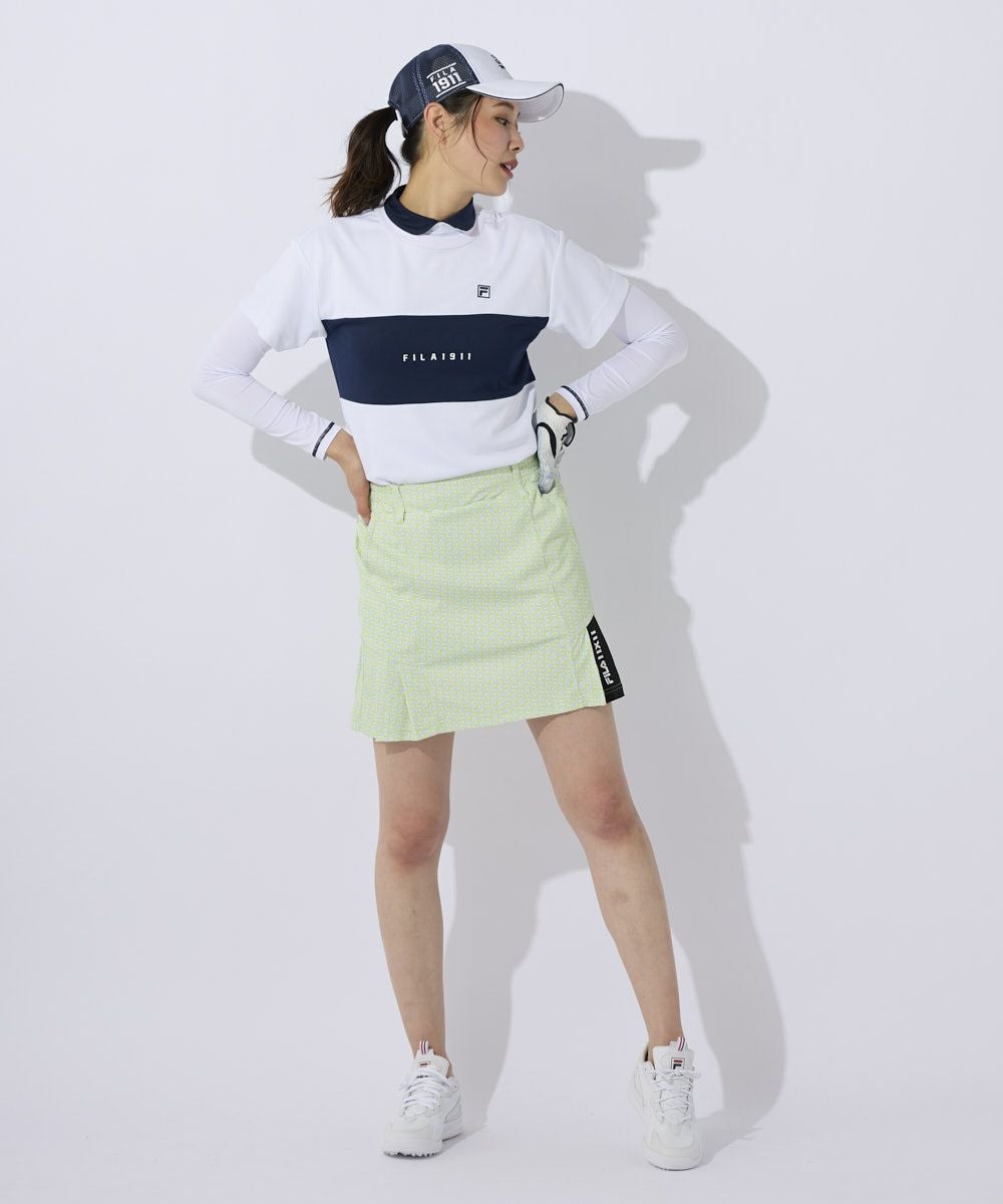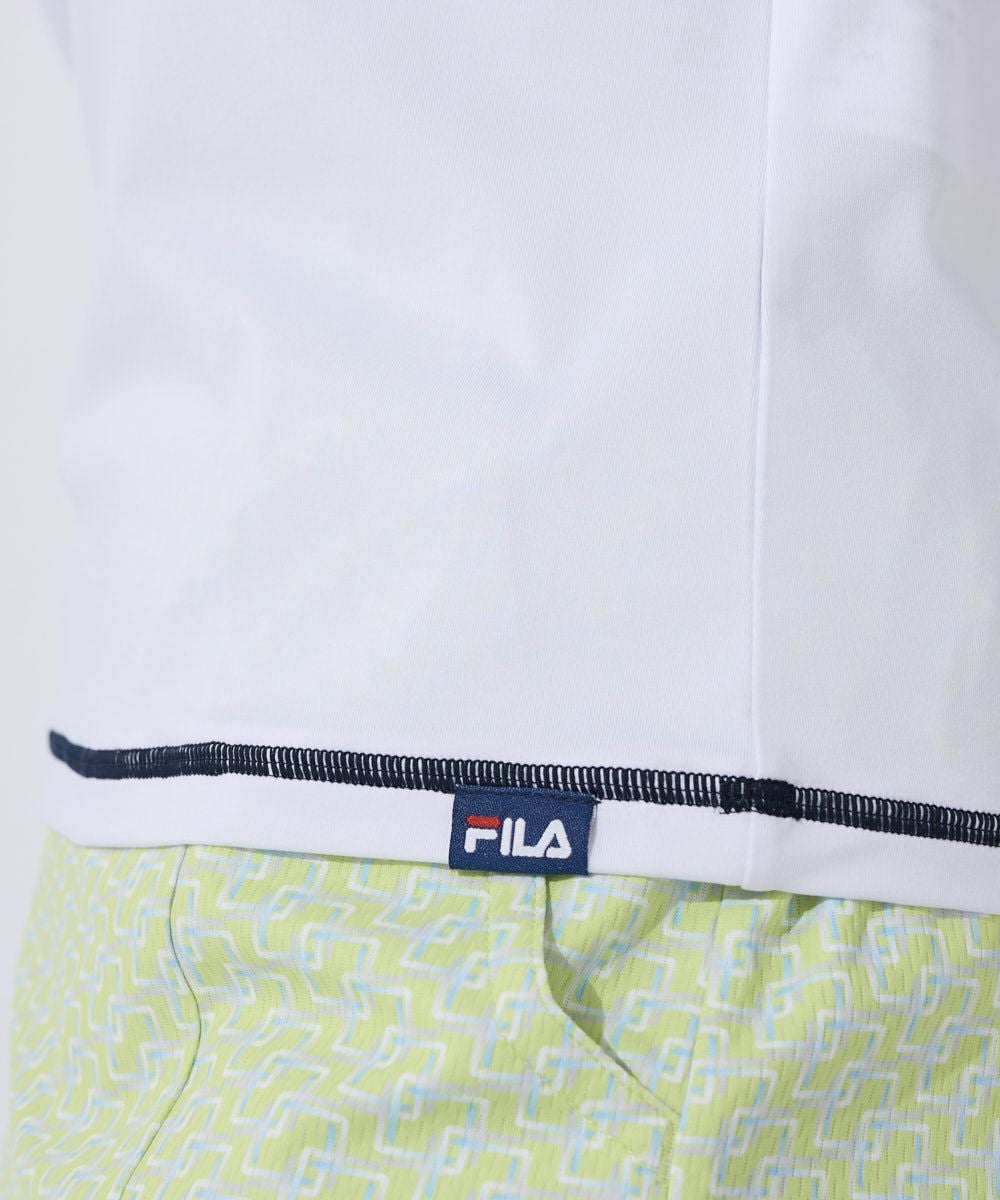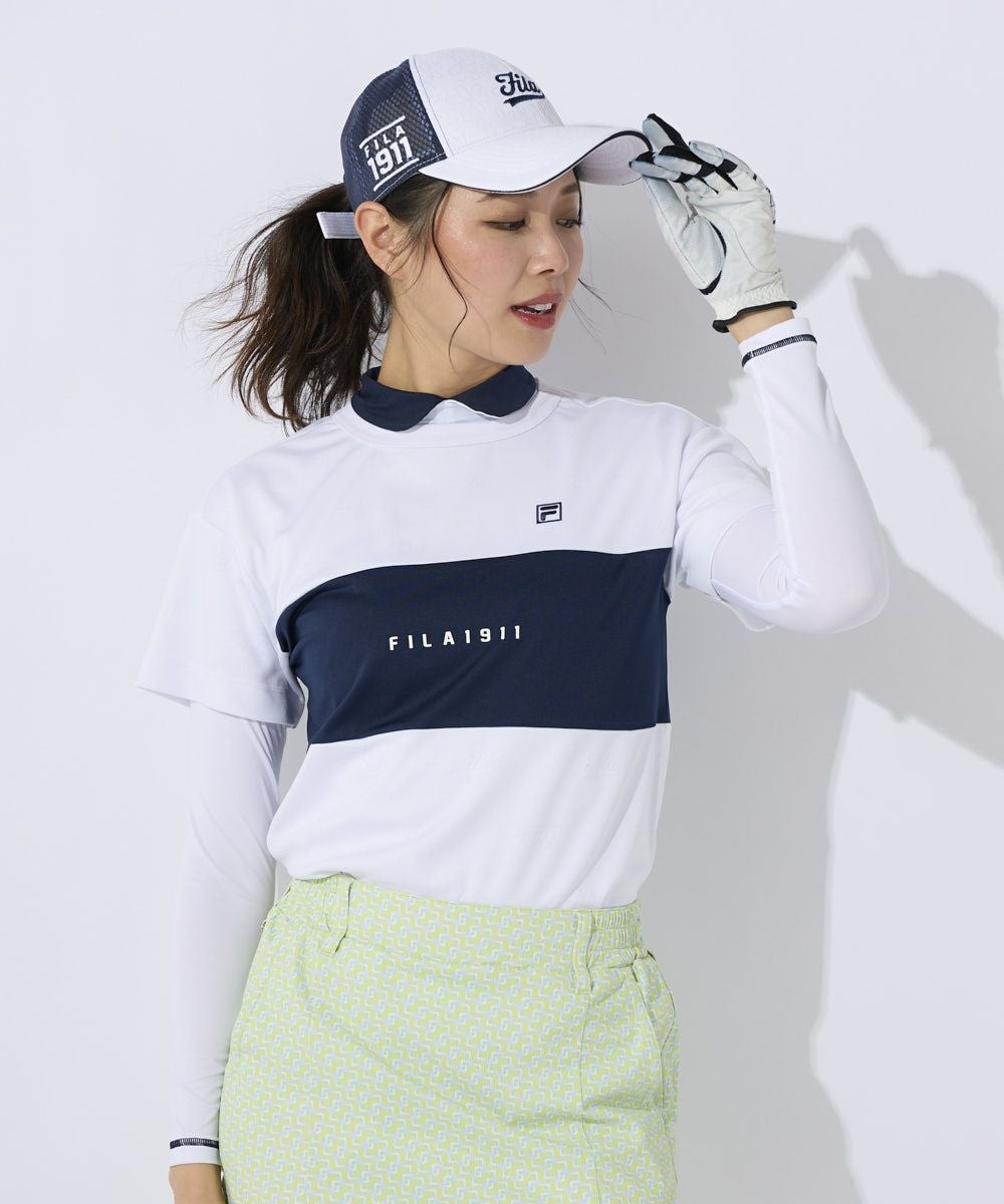 TシャツにはFILAロゴをランダムにジャガードで表現した、ストレッチ性の良い素材を使用。インナーの衿はハイネックとしてもしくは折り返してシャツ衿にもできる2WAYタイプです。