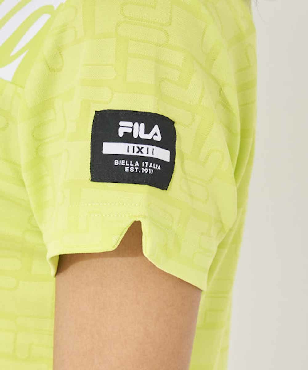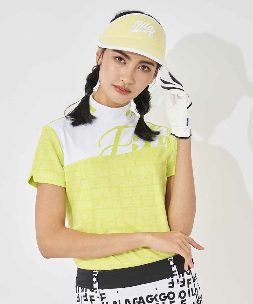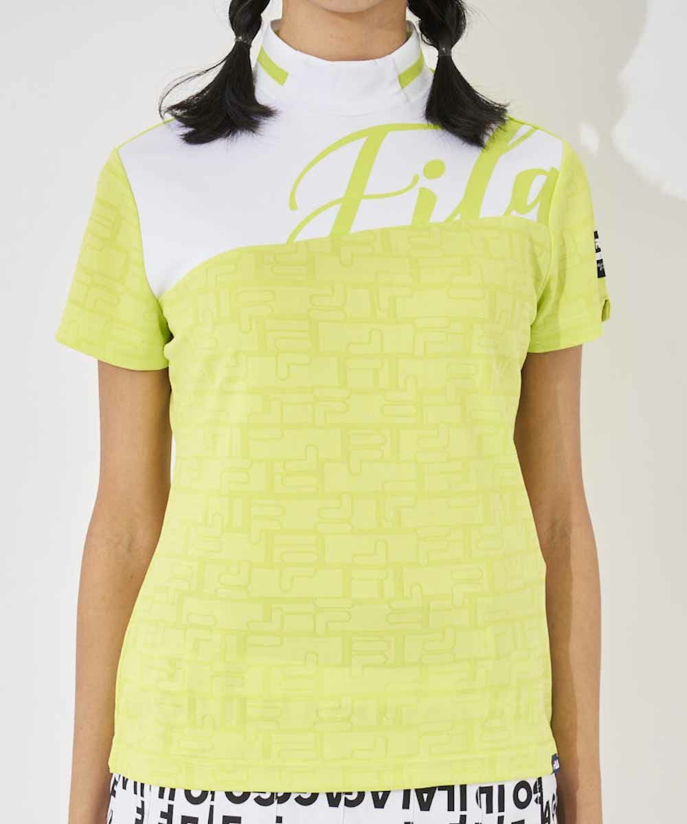 ブロック切り替えが特徴的な、リブ衿のモックネックシャツ。衿リブにFILA誕生年のローマ数字「�氤ァ�氤氈v、FILAのFをジャガードで表現しました。ストレッチ性の良い素材を採用しております。
