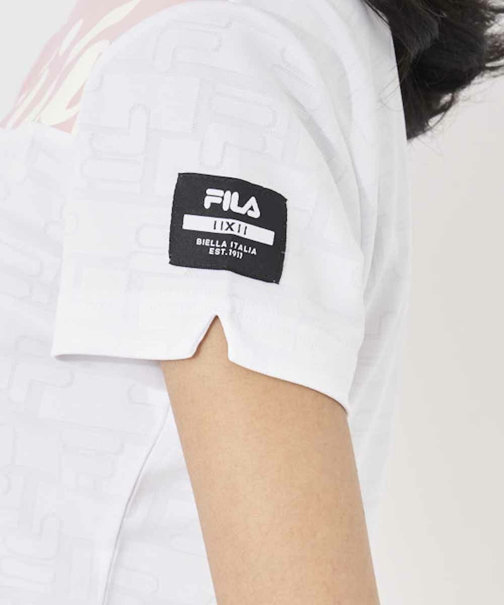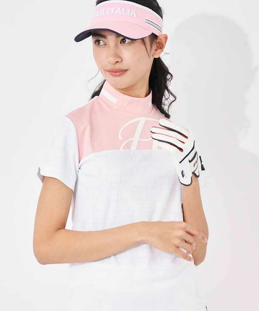 ブロック切り替えが特徴的な、リブ衿のモックネックシャツ。衿リブにFILA誕生年のローマ数字「�氤ァ�氤氈v、FILAのFをジャガードで表現しました。ストレッチ性の良い素材を採用しております。