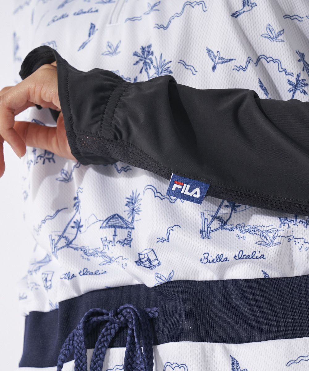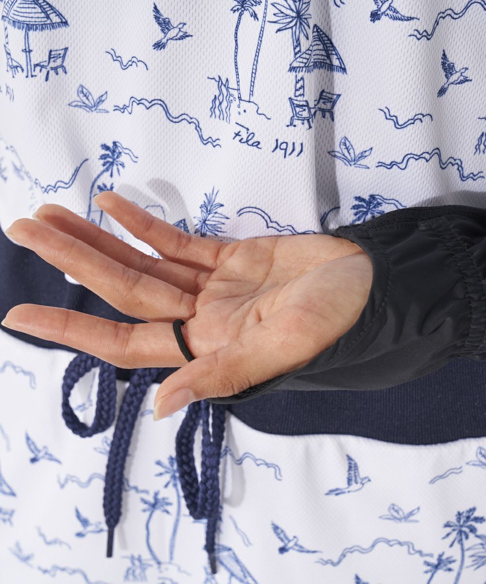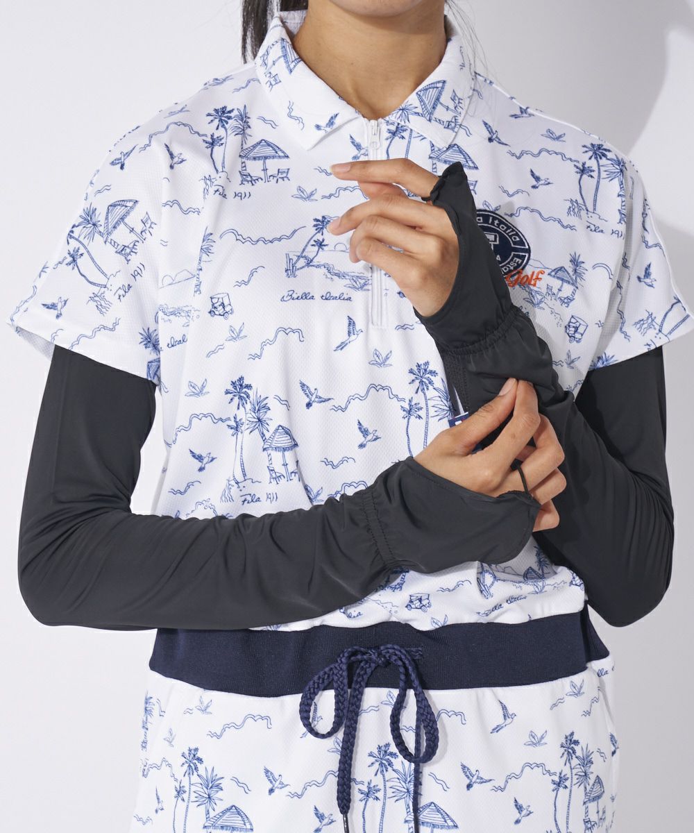 接触冷感機能糸を使用したベア天竺素材を採用しました。手の甲までしっかり日よけができるような仕様です。手首部分がゴムシャーリング仕様になっており、手甲カバー部分が邪魔な時はたくし上げることができます。
