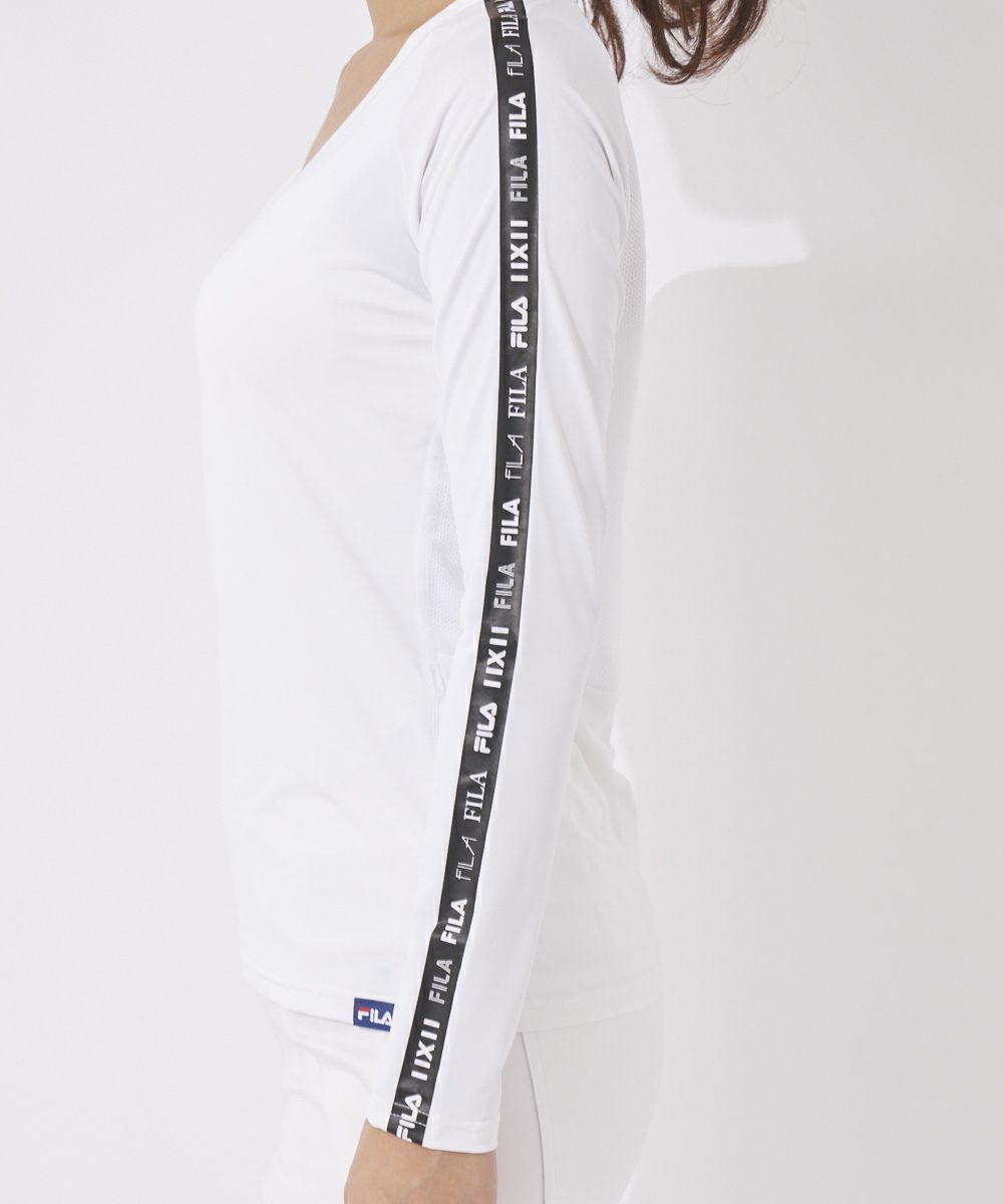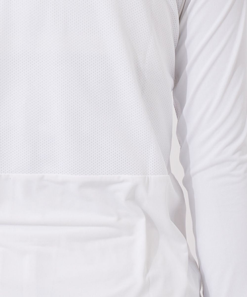 接触冷感機能糸を使用した、ベア天竺のUネックインナーシャツ。袖下、背中のメッシュ素材は皮膚接着面積が少ないため汗をかいてもべたつかず、蒸れを軽減する仕様となっております。