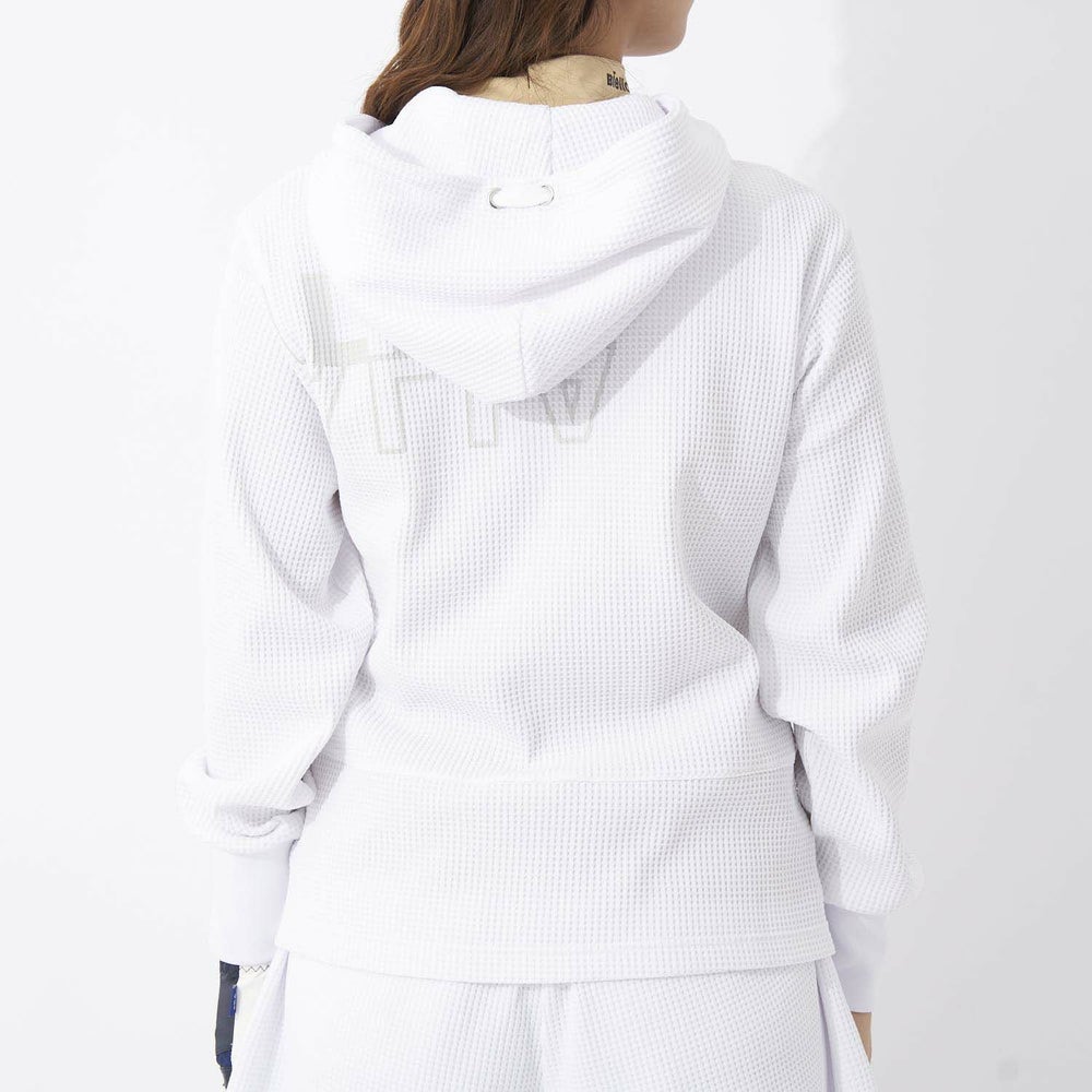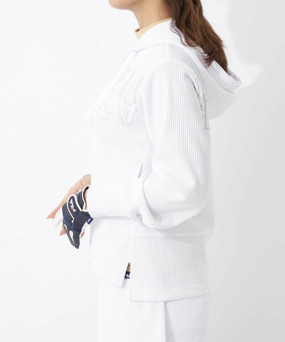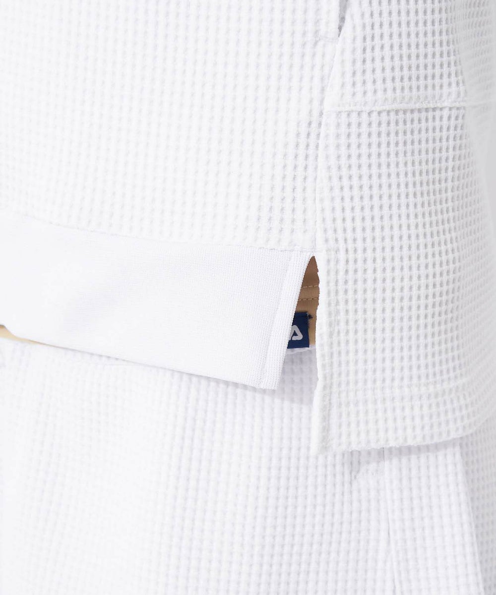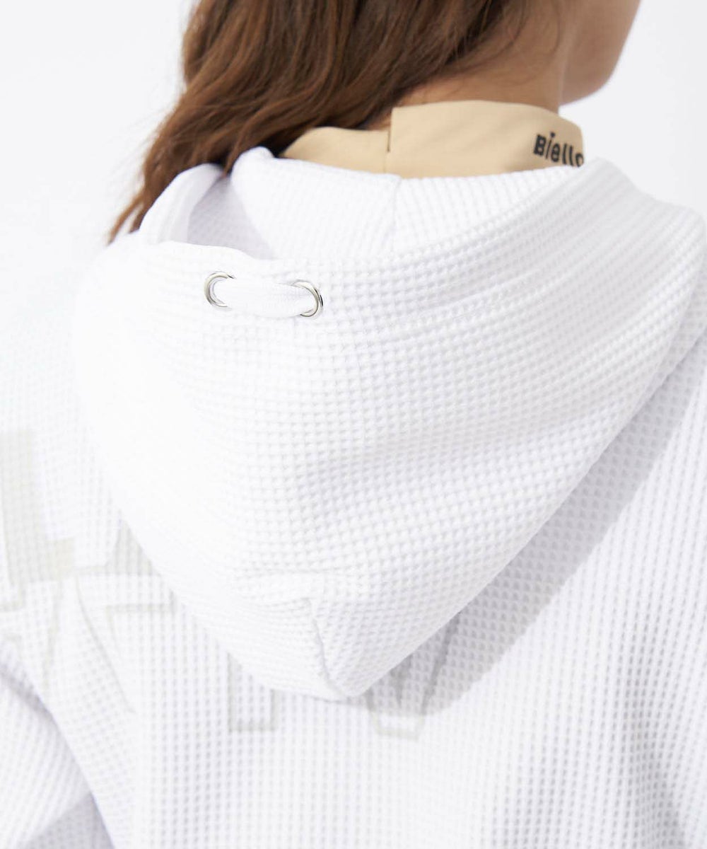 寒暖差のある春先から活躍する、表面感のあるワッフル素材を使用したパーカー。裾にスリットと前後差をつけた。動きのあるシルエットです。