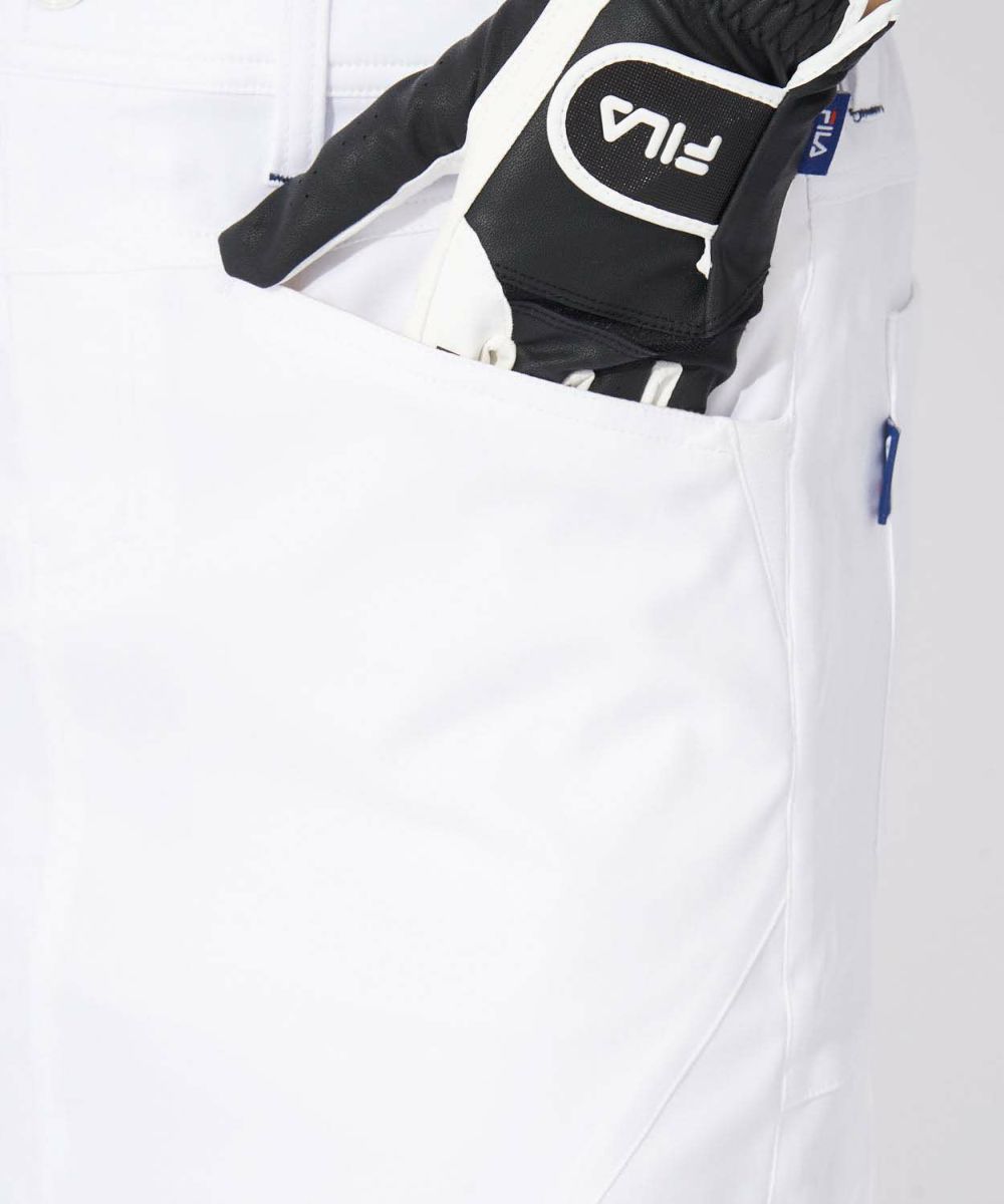 ストレッチ性に富んだ吸水撥水素材を使用。裾スリットと後ろプリーツで女性らしい魅力をプラス。右後ろポケットは使い分けに便利な二重仕様。