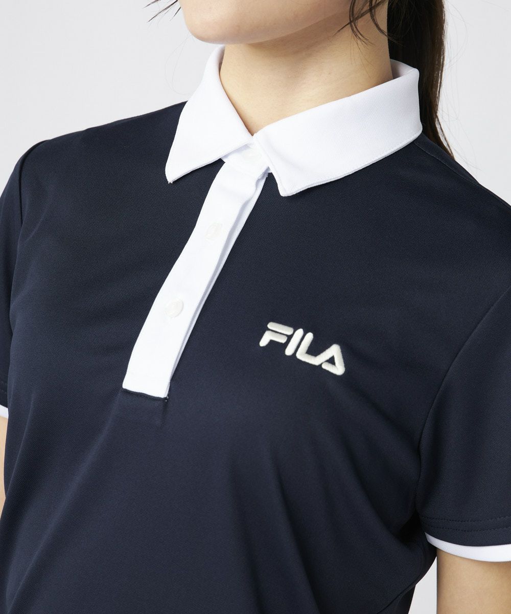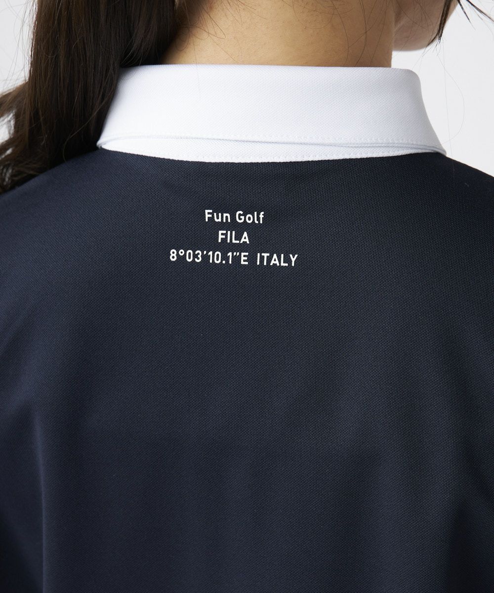衿のバイカラーがかわいい半袖ポロシャツ。ベーシックなデザインなので、スカート、パンツ選ばずコーディネートを楽しめます。程よい丈感で、アウトでもインでもバランスよく着用いただけます。バックデザインにはフィラゴルフのキャッチコピー【Fun Golf】のテキストを小さく入れており、細部までこだわったオシャレなデザインです。
