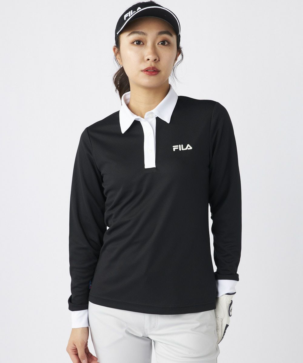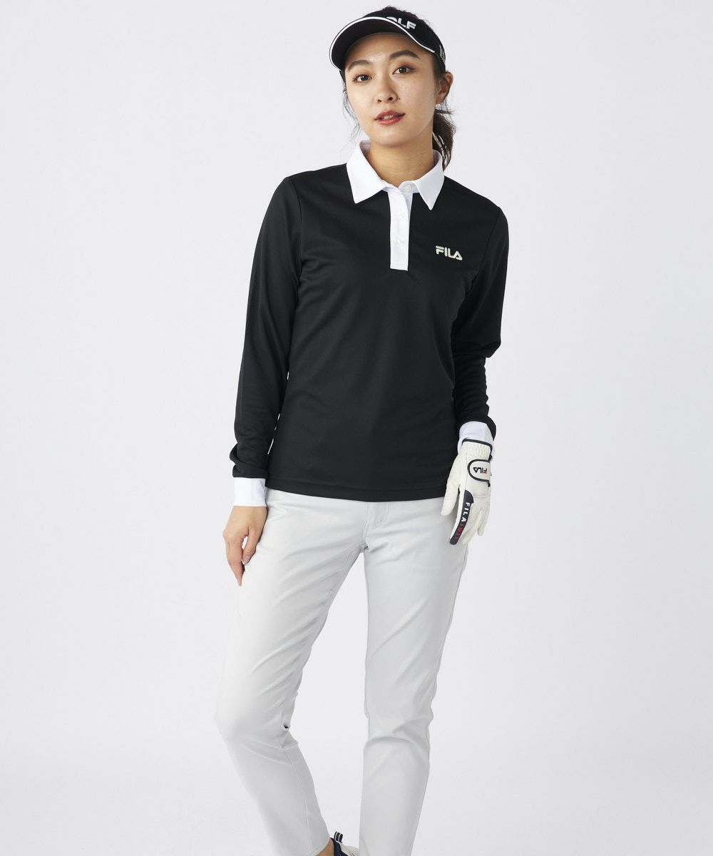 衿のバイカラーがかわいい長袖ポロシャツ。ベーシックなデザインなので、スカート、パンツ選ばずコーディネートを楽しめます。