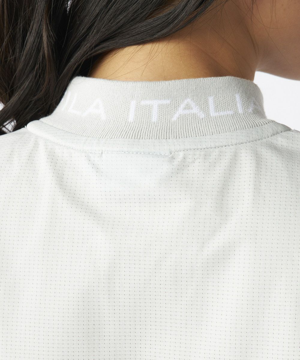 シンプルながらもスポーティな印象を与えるハーフジップ仕様で、襟元にはさりげないロゴがあしらわれています。